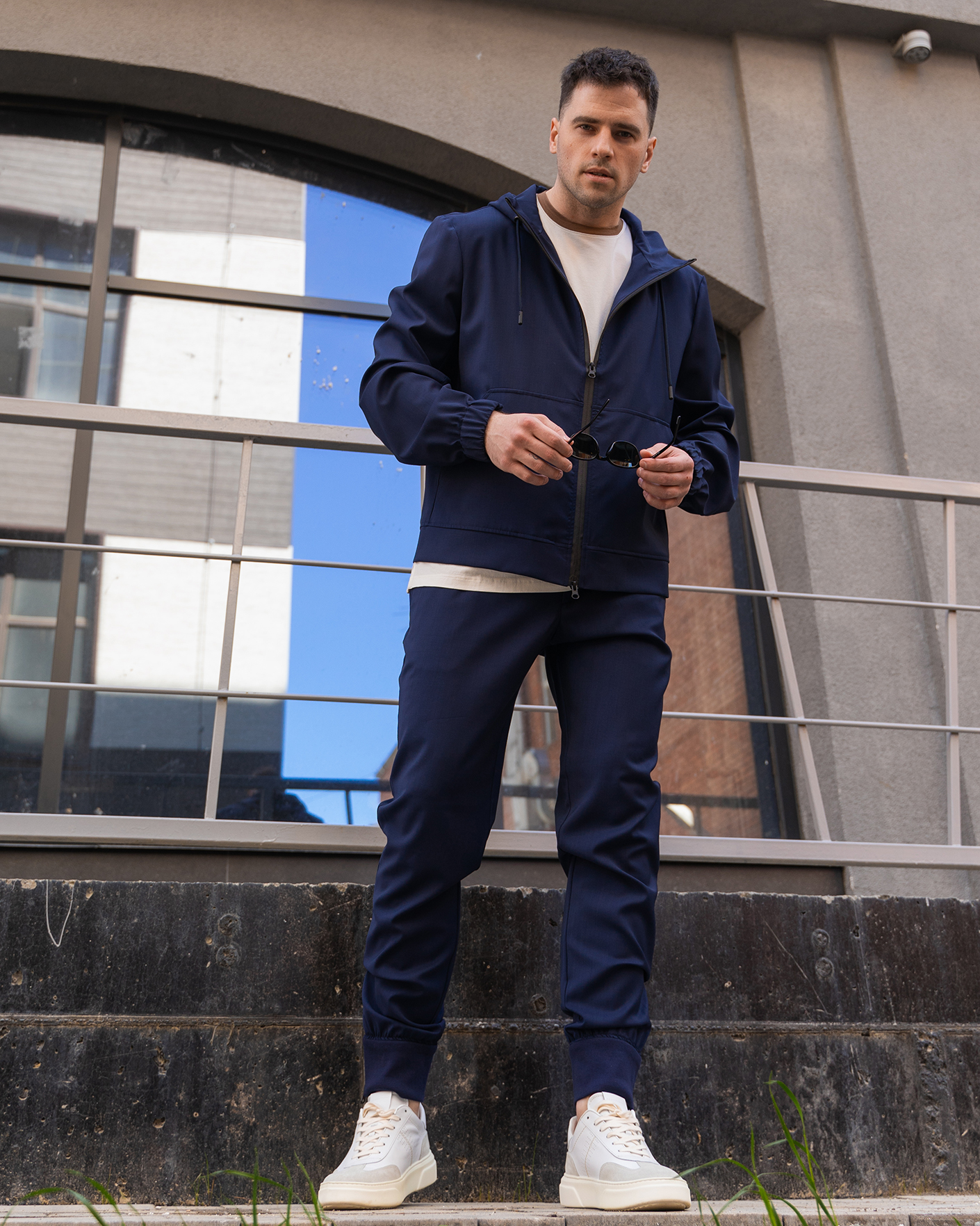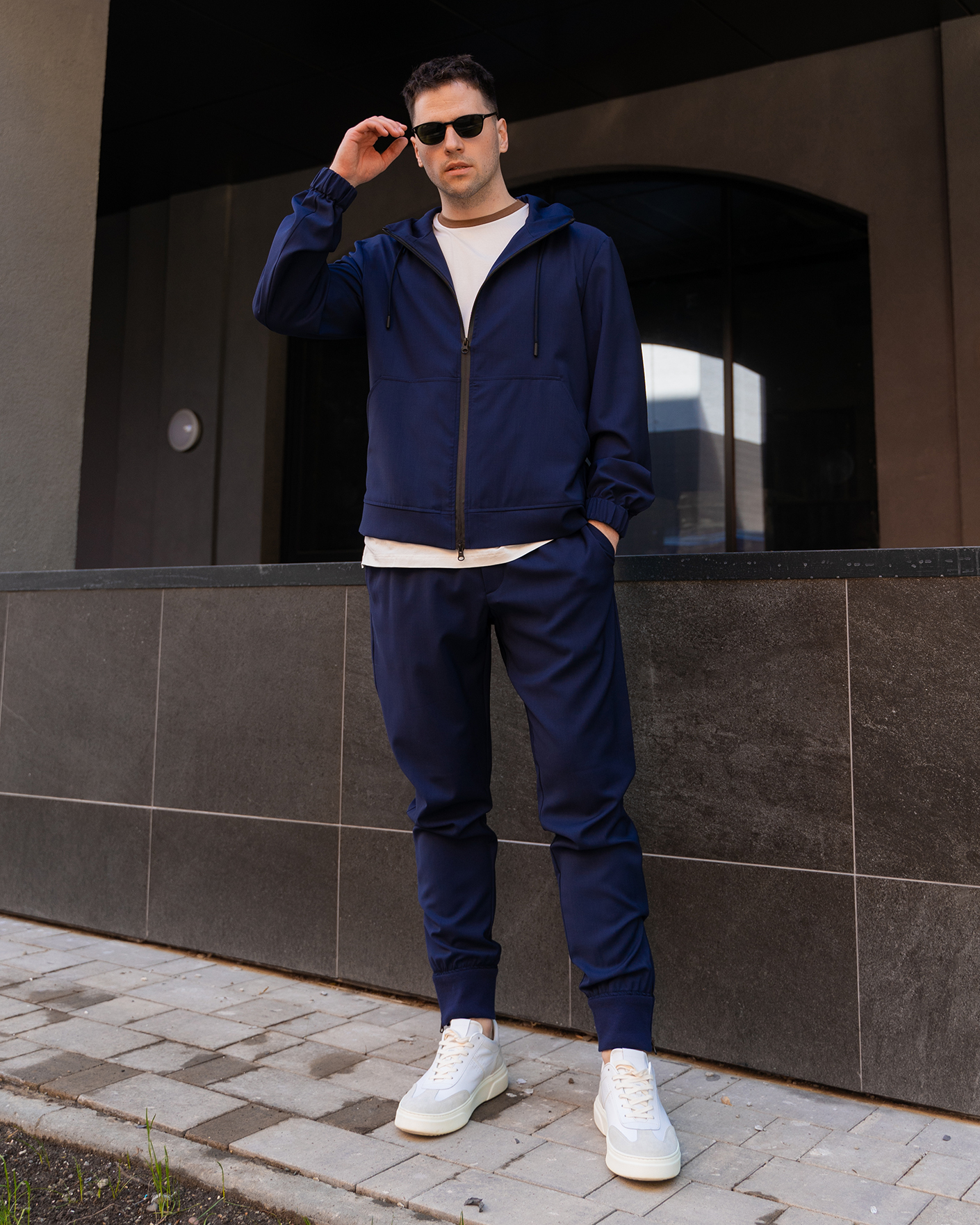 Стильный и комфортный образ в спортивном стиле для прогулок состоит из фиолетово-синего худи на молнии и регулируемым капюшоном, из белой футболки с контрастным воротом, а также из джоггеров-банан фиолетово-синего цвета с поясом на резинке в складку.