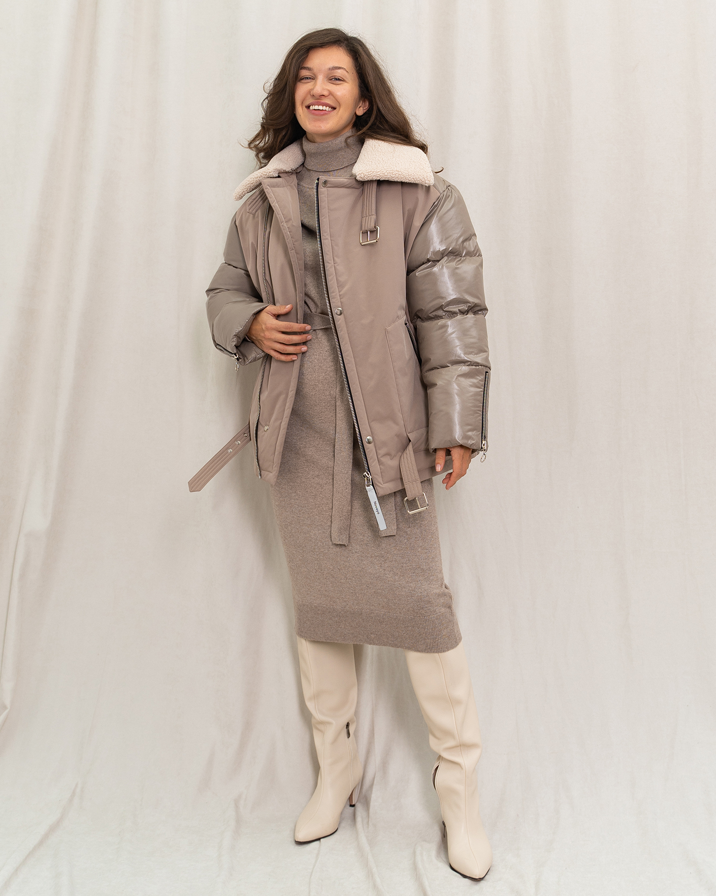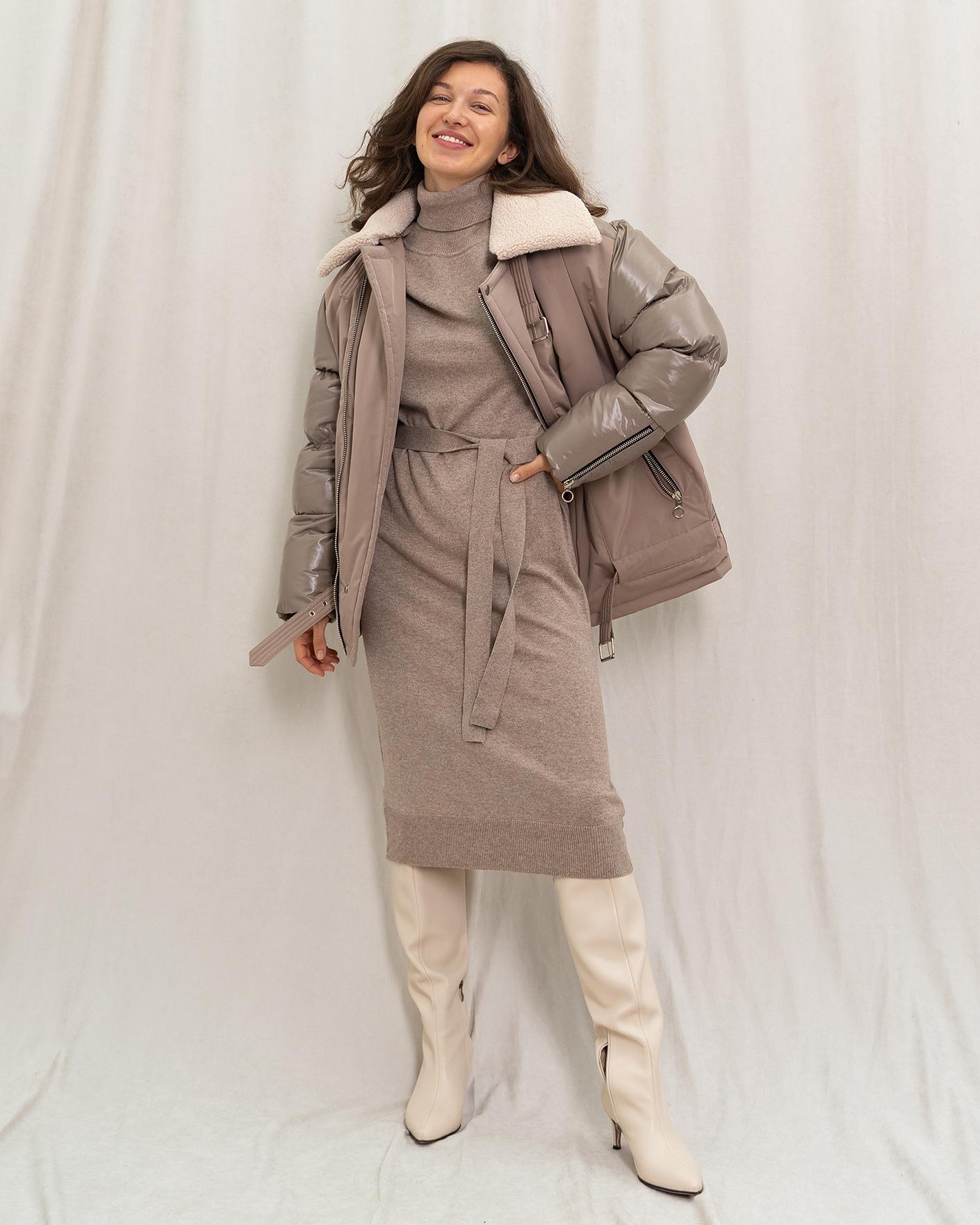 Стильный и универсальный образ на каждый день состоит из теплой куртки-косухи бежевого цвета из комбинированных тканей с застежкой на молнию и из свободного серо-бежевого платья на поясе.