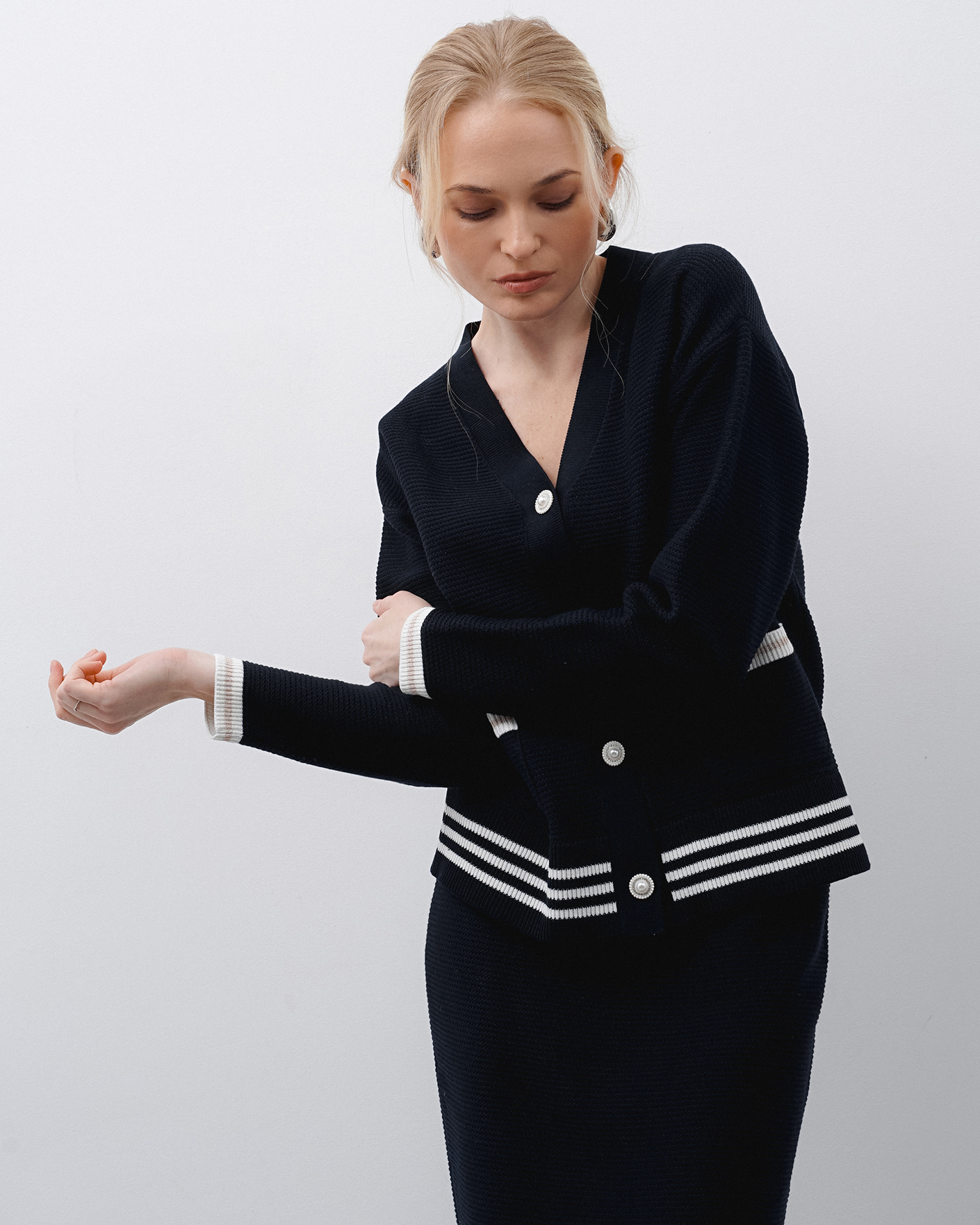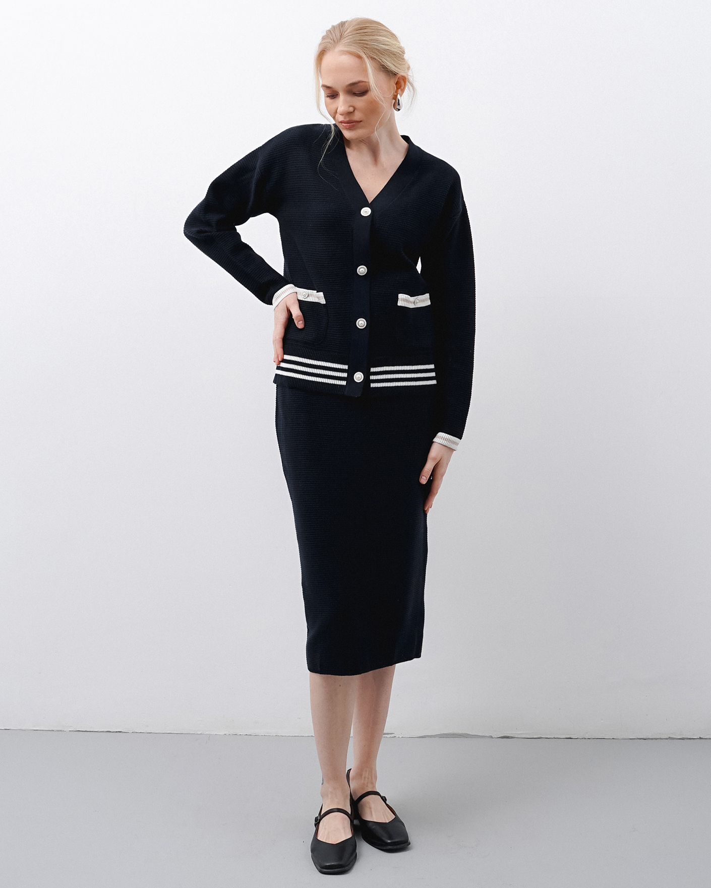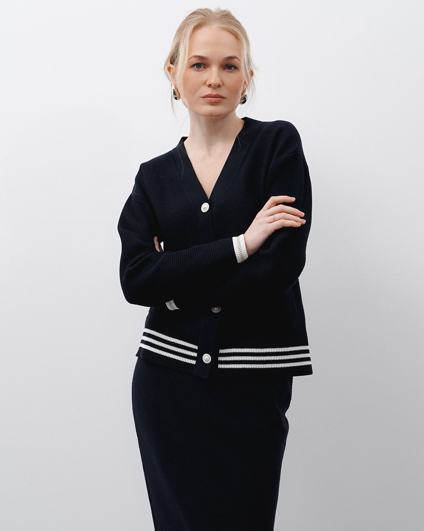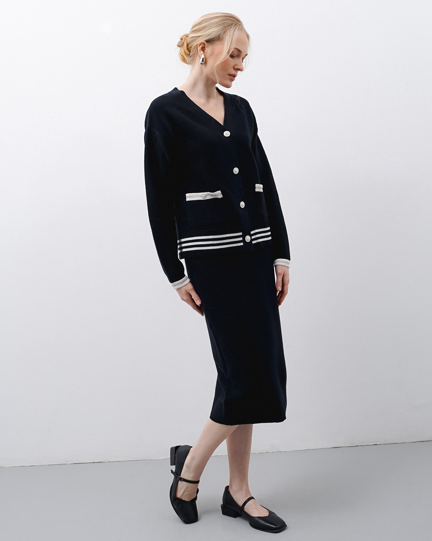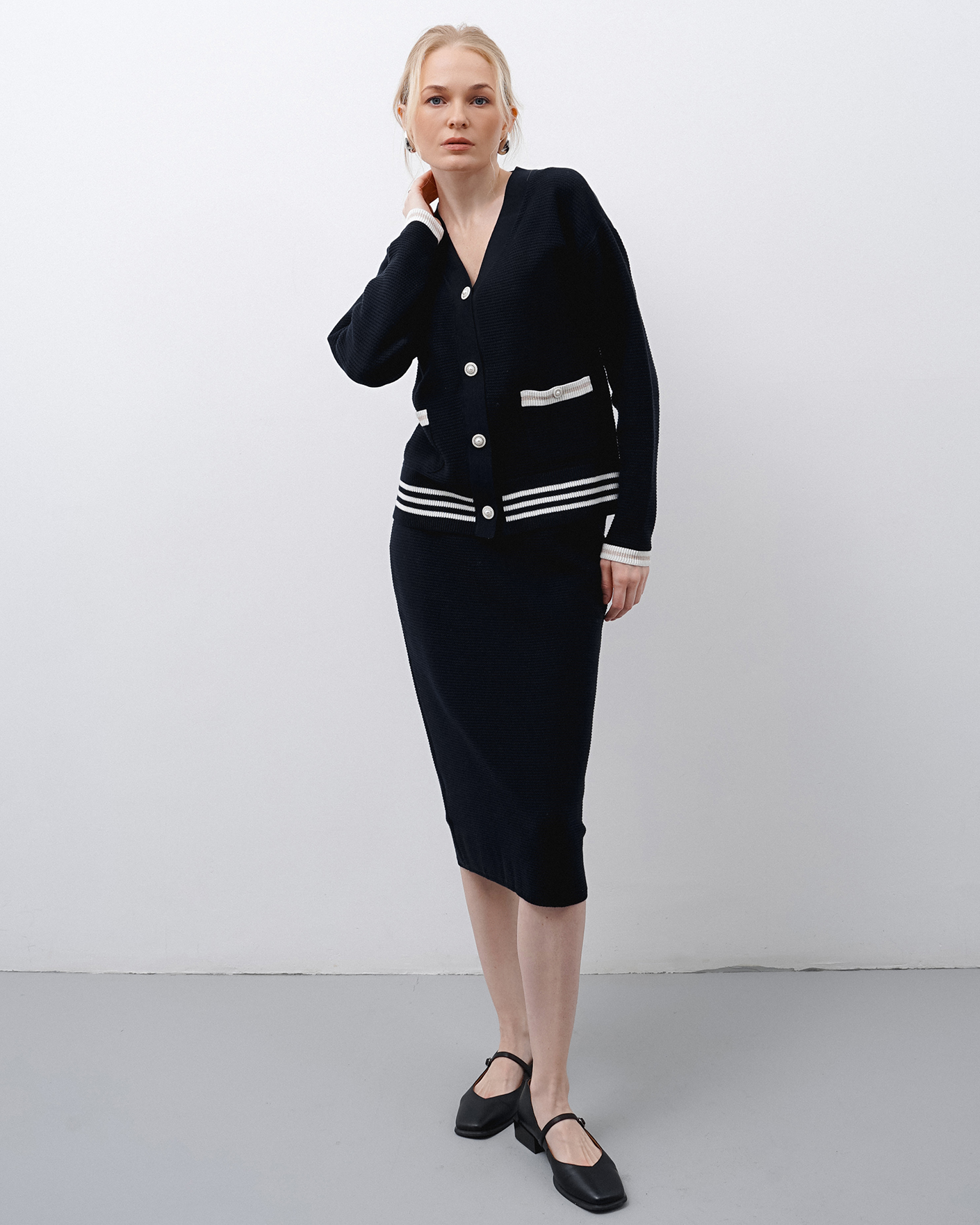 Стильный классический образ от Nelva для работы в офисе состоит из свободного кардигана в горизонтальную текстурную вязку с V-образным вырезом и застежкой на пуговицы, а также из темно-синей юбки-карандаш длины миди.