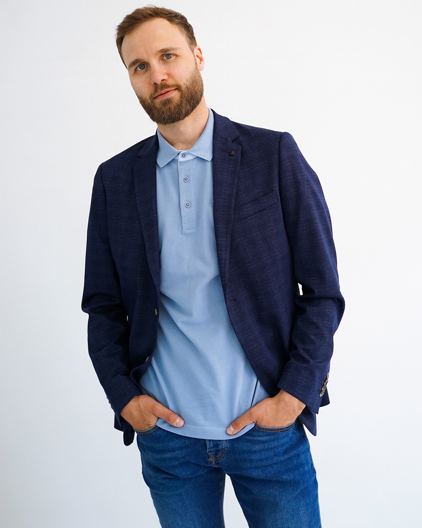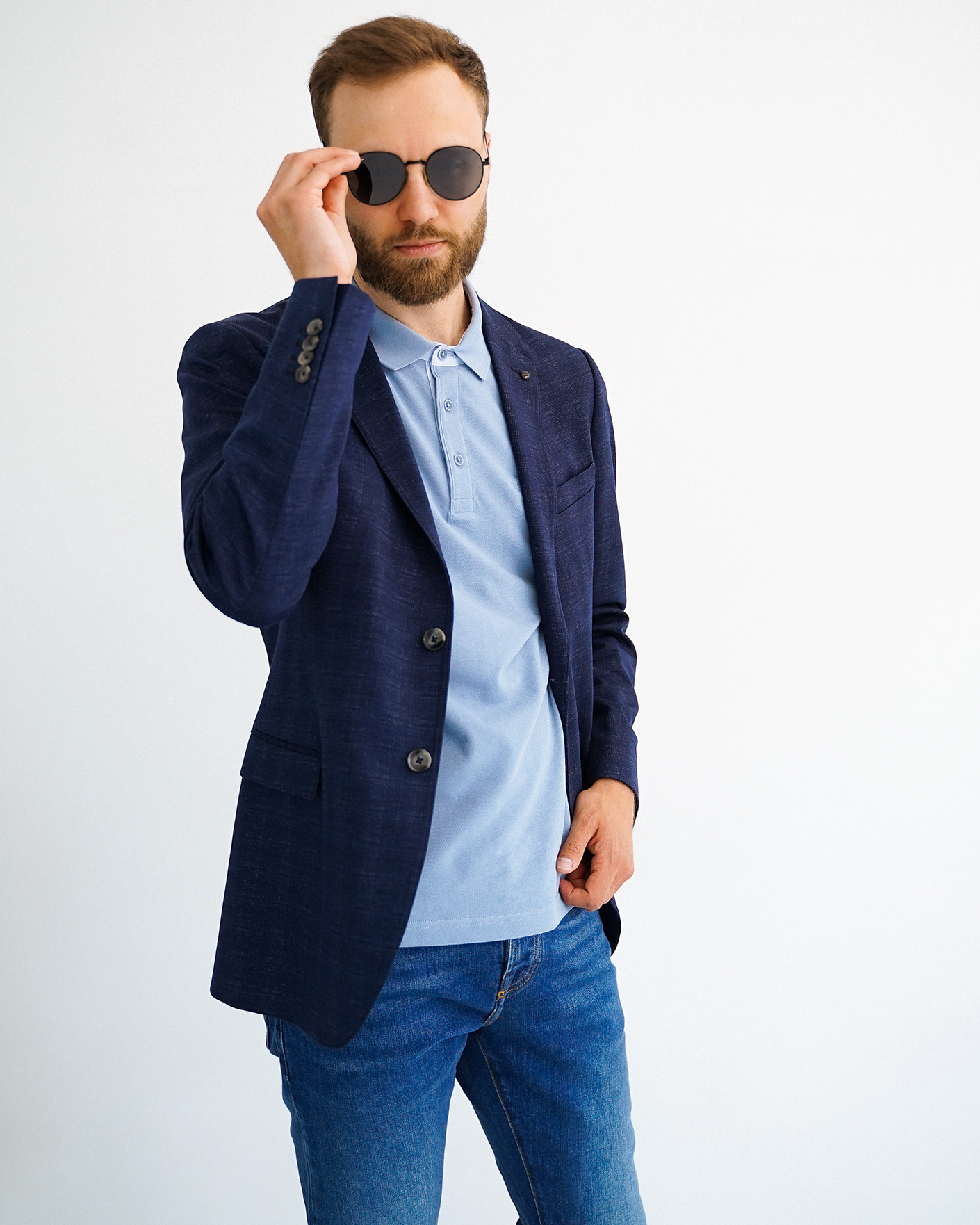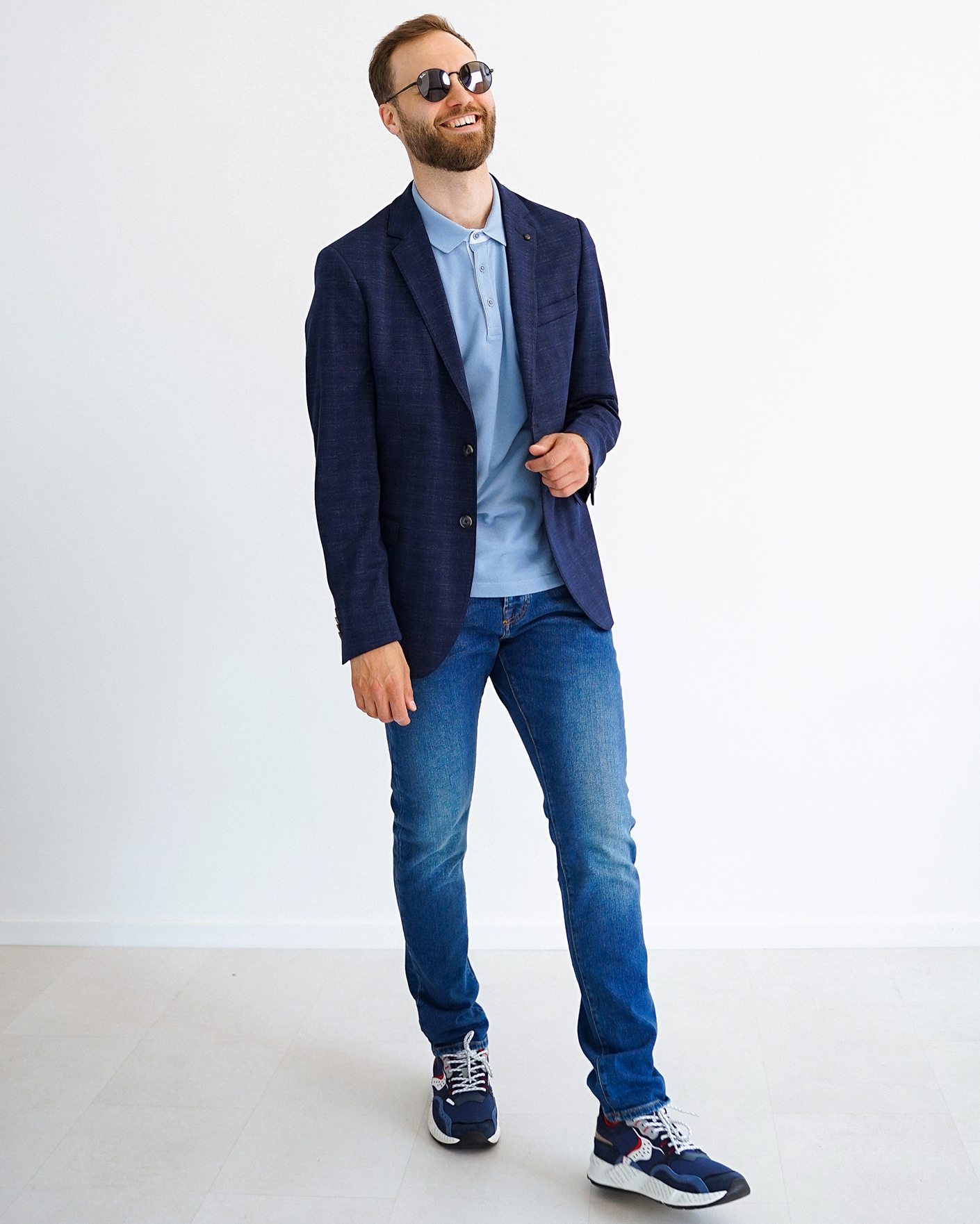 стильный образ для работы в офисе: пиджак, футболка-поло, джинсы