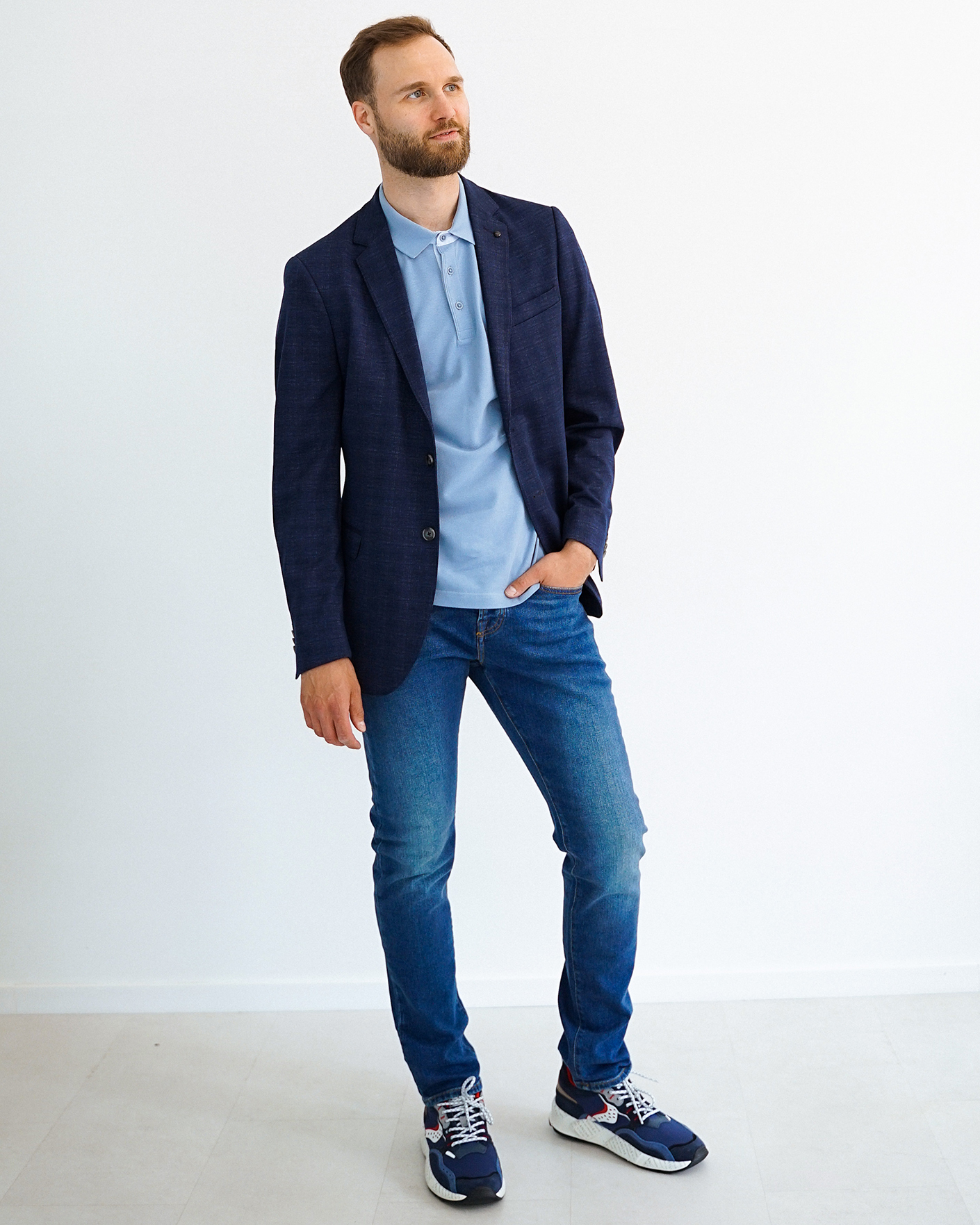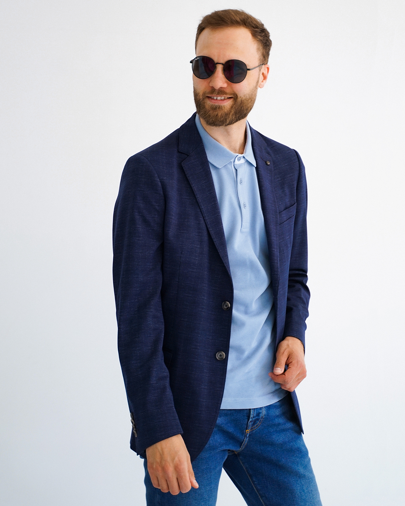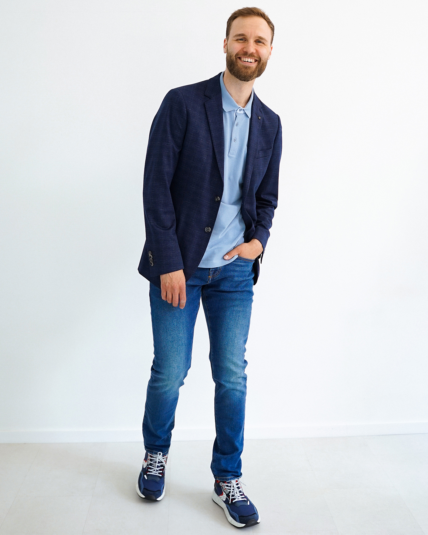 стильный образ для работы в офисе: пиджак, футболка-поло, джинсы