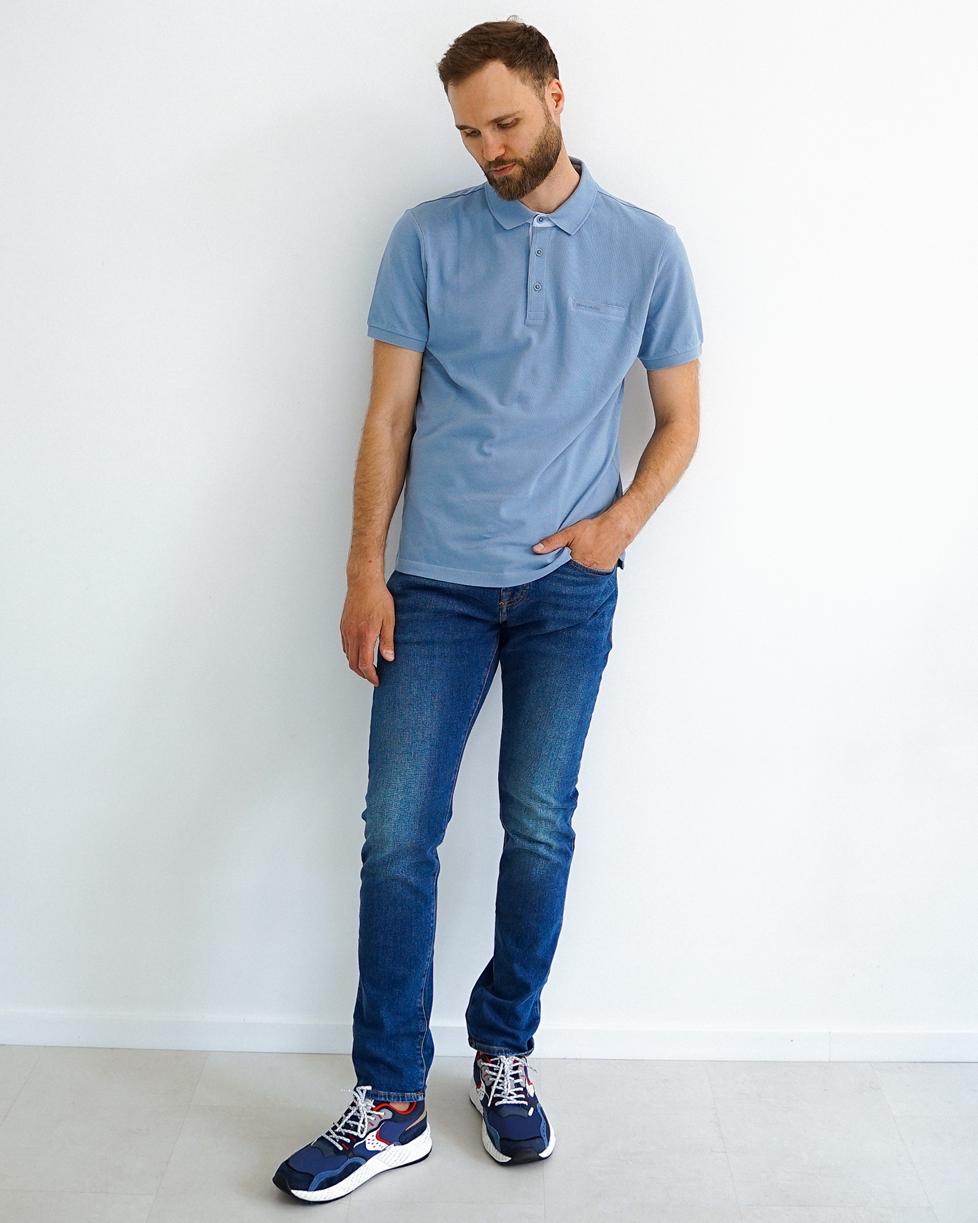 Стильный образ на каждый день и для работы в офисе состоит из пиджака фиолетово-синего цвета в строчный рисунок и крупную клетку, из серо-голубой футболки-поло из 100% хлопка, а также из хлопковых джинс синего цвета в диагональную структуру.