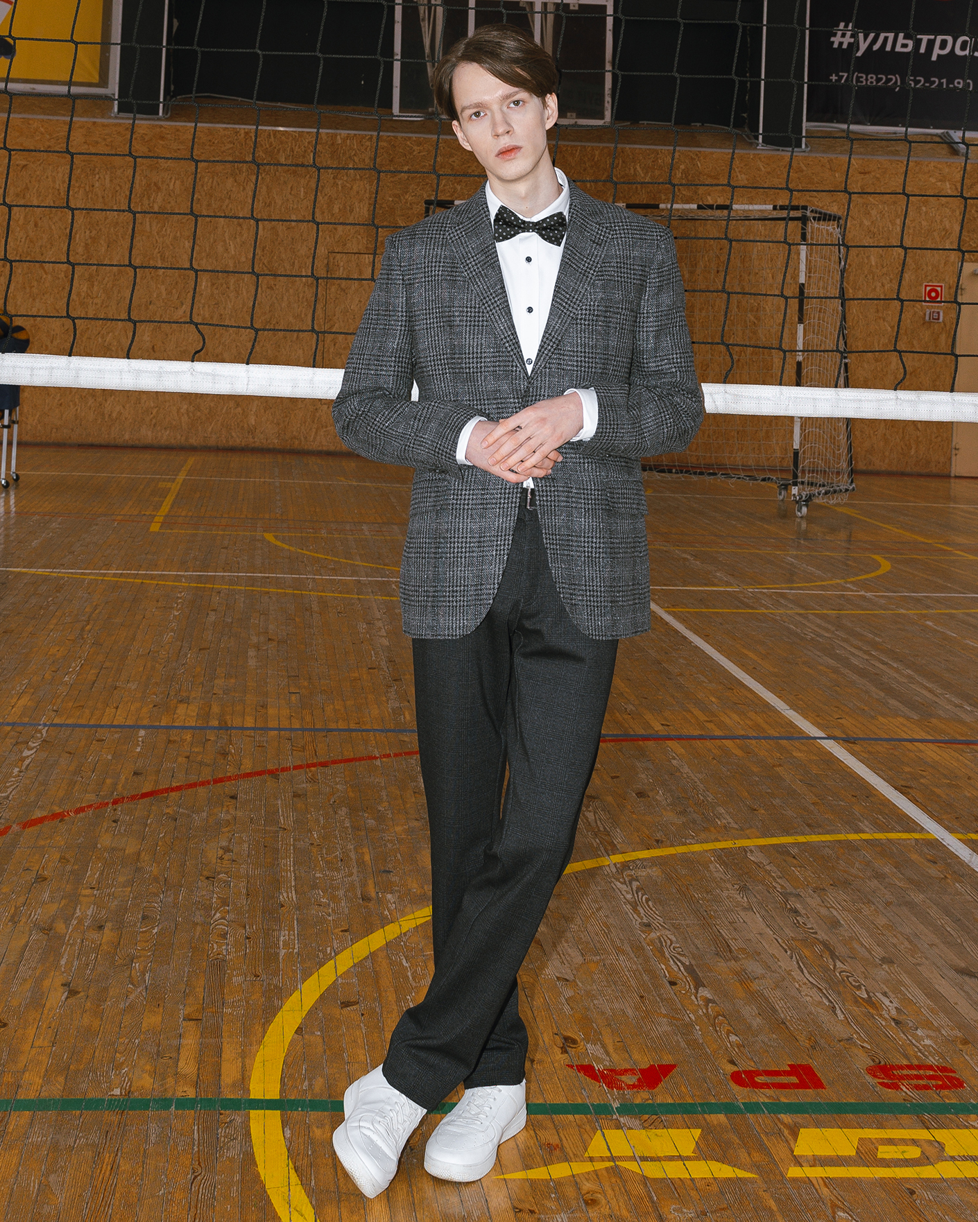 Стильный образ для выпускного вечера состоит из пиджака серого цвета в мелкую клетку, из классической рубашки белого цвета, а также из брюк-чинос темно-серого цвета в мелкую клетку. Образ можно дополнить стильным галстуком или галстуком-бабочка.