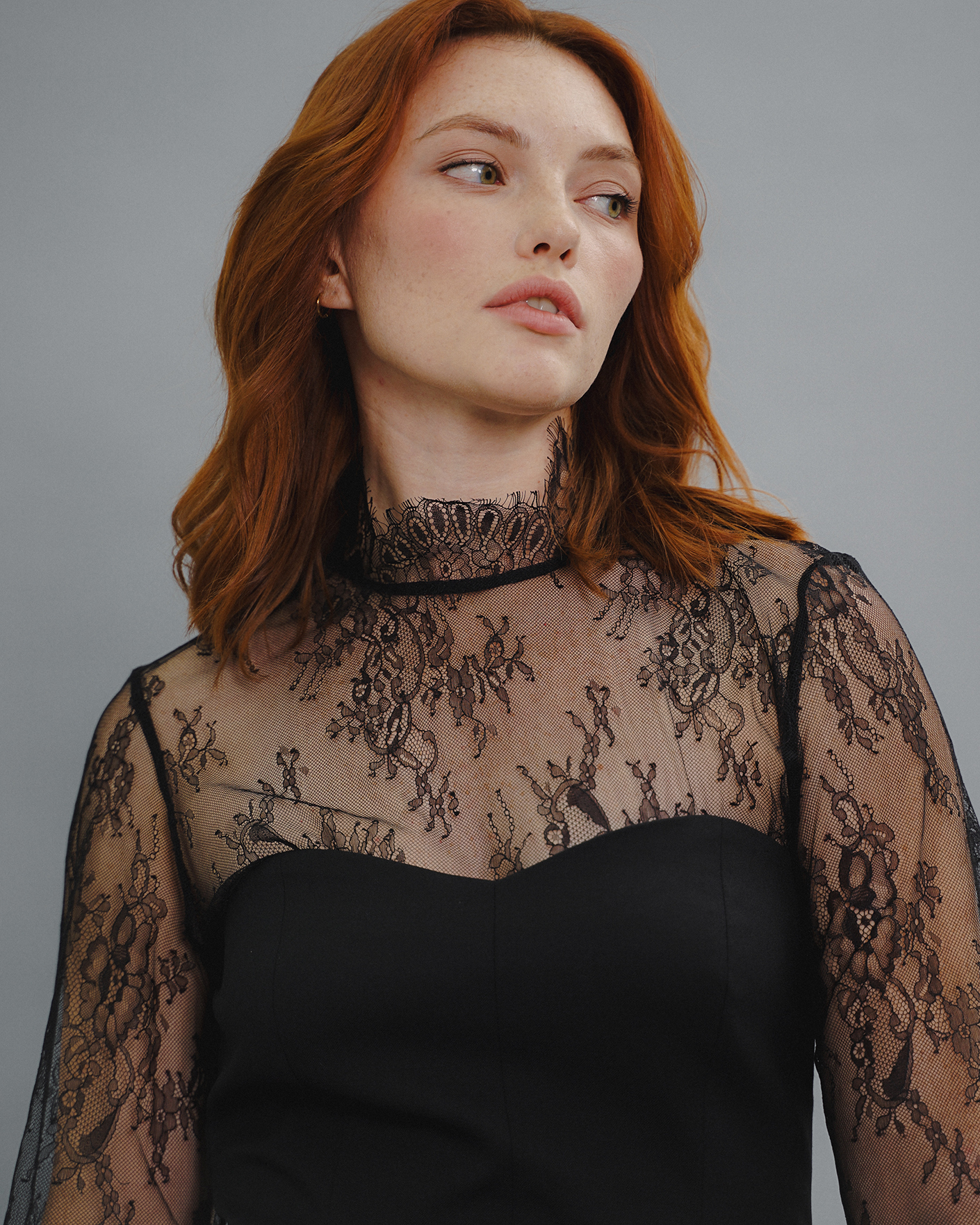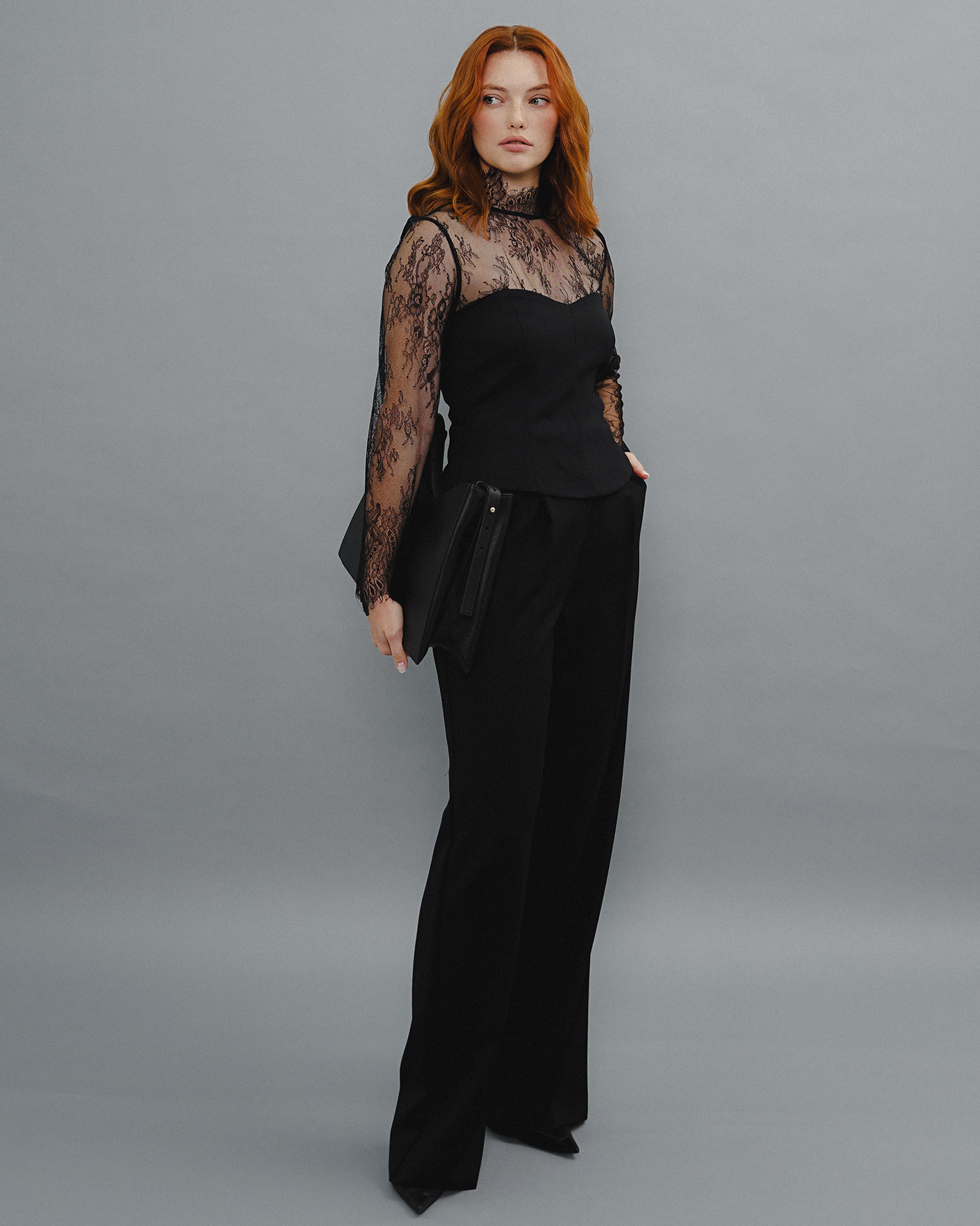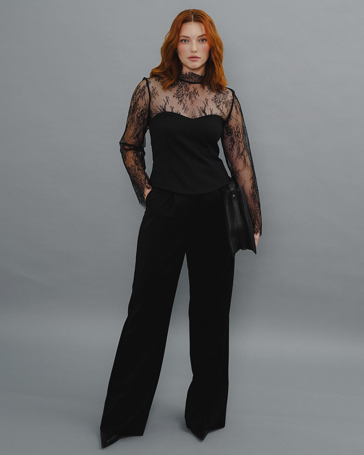 Стильный образ Marella total black состоит из топа-бандо с застежкой на молнию сзади, из водолазки в изящное кружево, а также из прямых брюк на защипах.