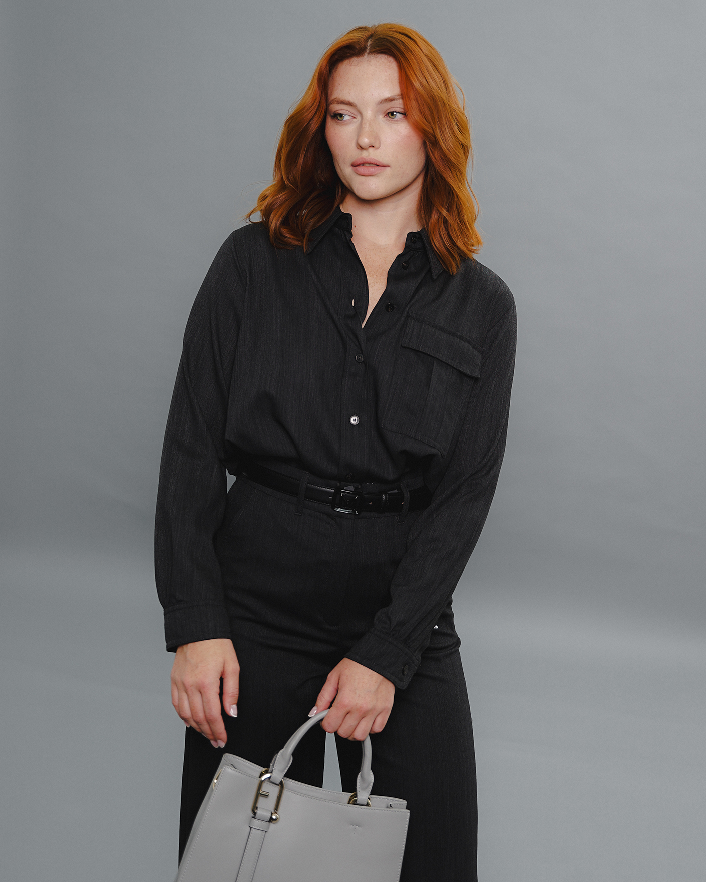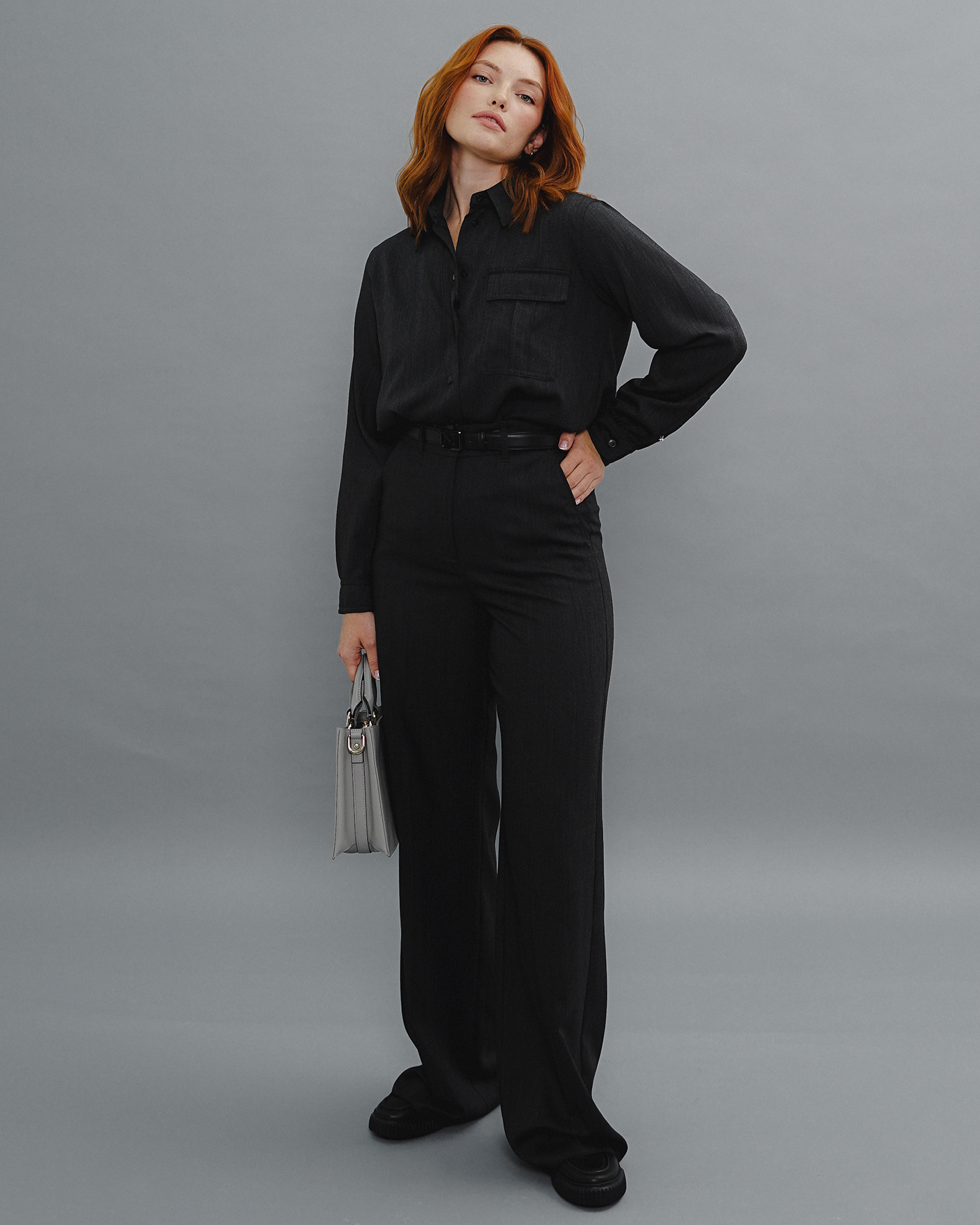 Стильный образ Marella total grey для работы в офисе состоит из свободной рубашки в строчный рисунок и из классических брюк прямого кроя.