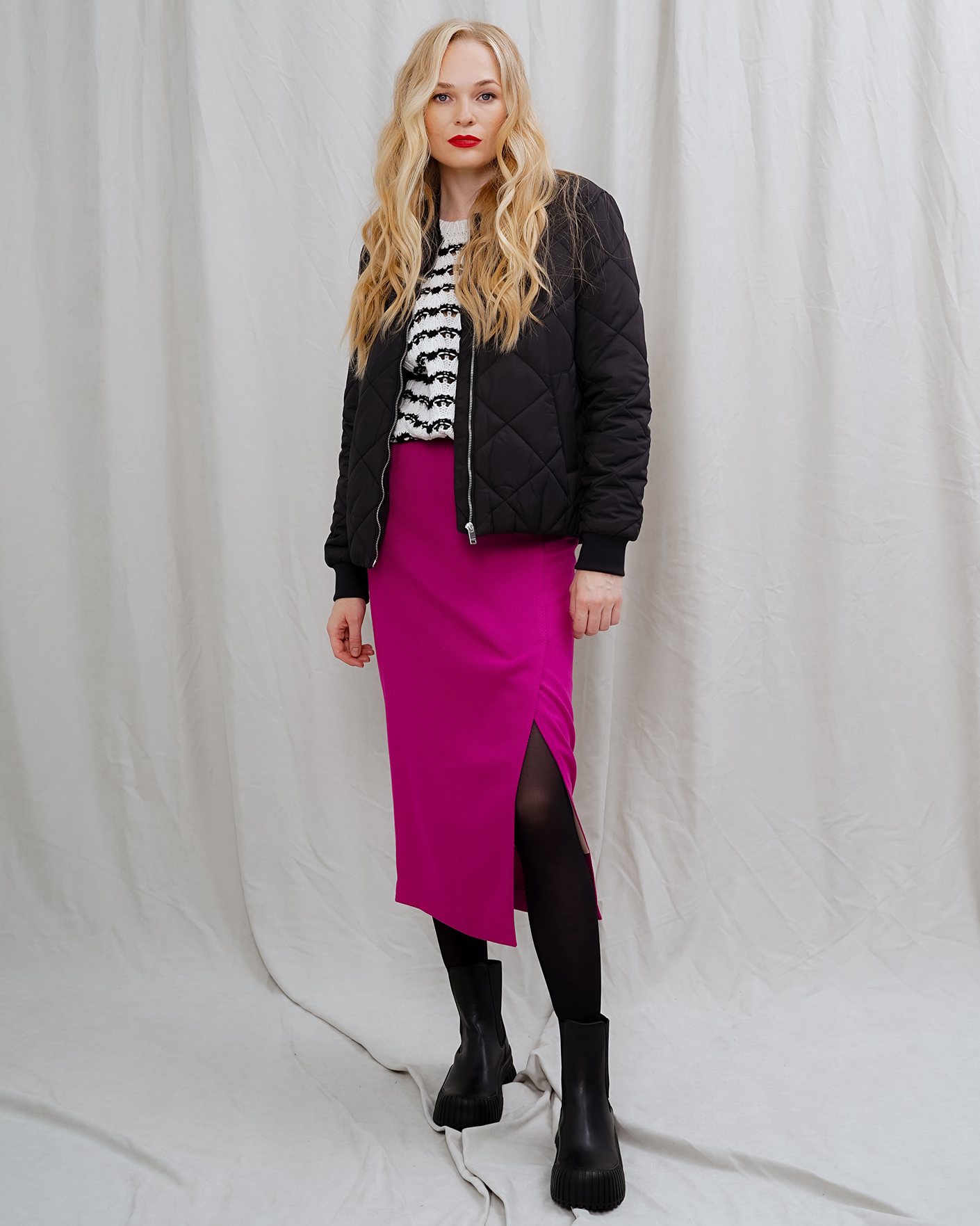 Стильный образ на каждый день и для работы в офисе состоит из стеганой куртки-бомбер черного цвета на молнии, из ажурного джемпера бело-черного цвета в горизонтальную полосу, а также из яркой юбки-карандаш цвета фуксии с эффектным разрезом.