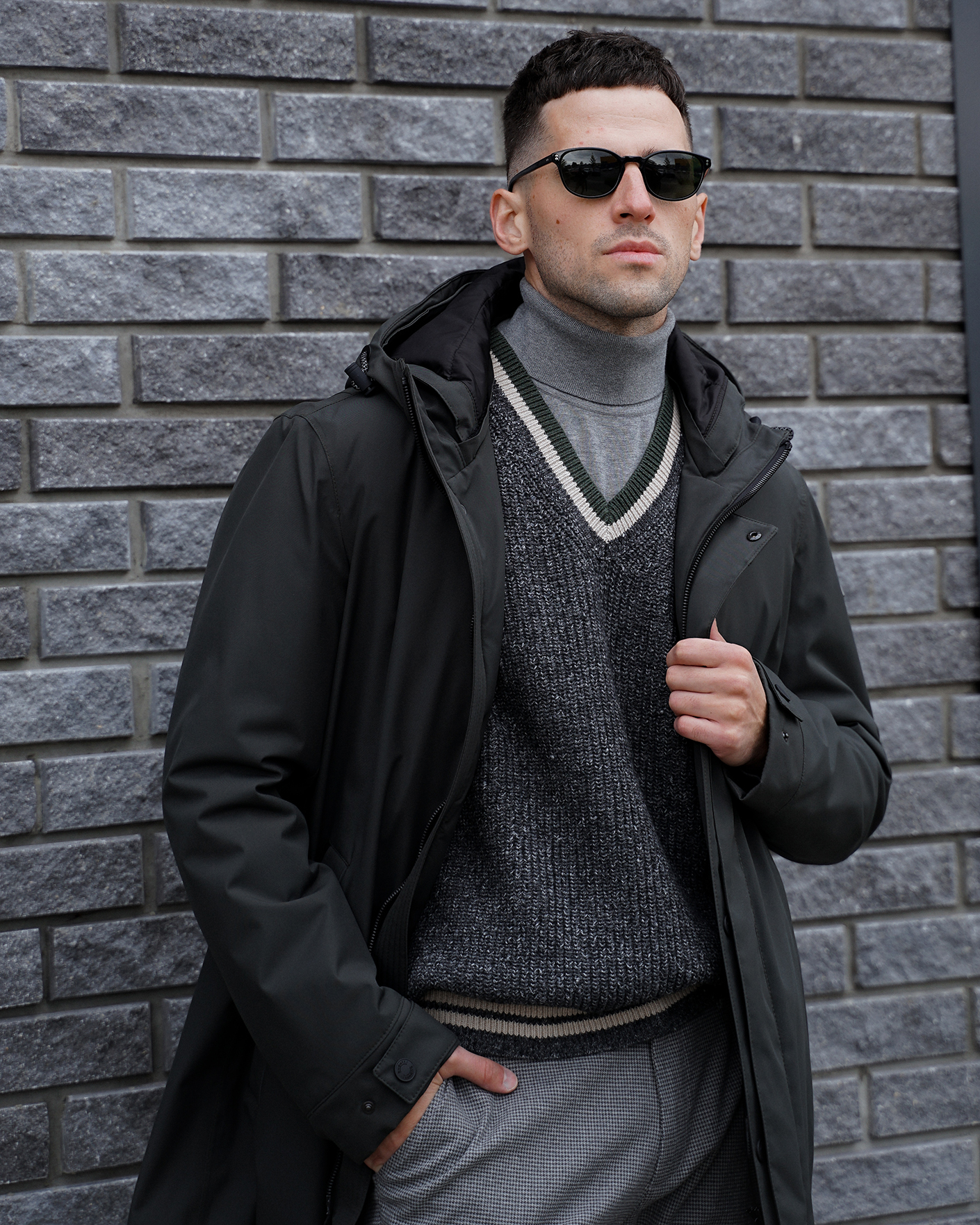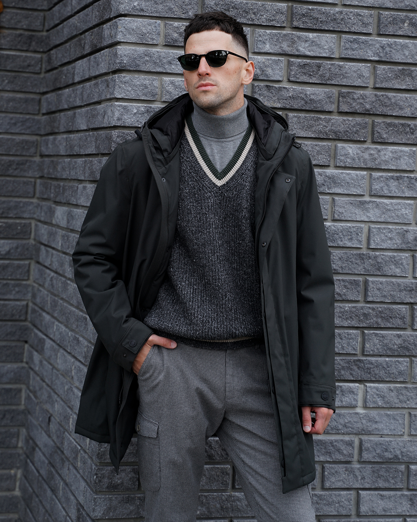 Стильный образ на каждый день и для работы в офисе состоит из утепленной куртки-парка черного цвета с капюшоном, из вязаного жилета серого цвета с V-вырезом, из свитера в мелкий строчный рисунок из 100% хлопка, а также из хлопковых брюк-карго серого цвета в мелкий рисунок гусиные лапки.
