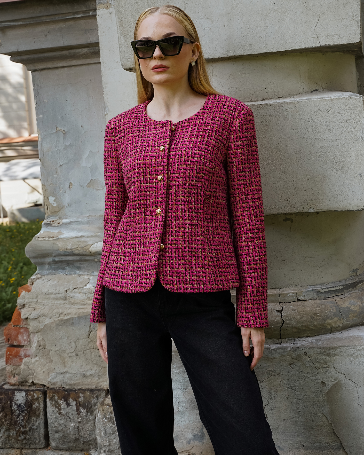 Стильный образ на каждый день от Emka состоит из укороченного твидового жакета в бежево-розовом цвете и из широких хлопковых джинс черного цвета.