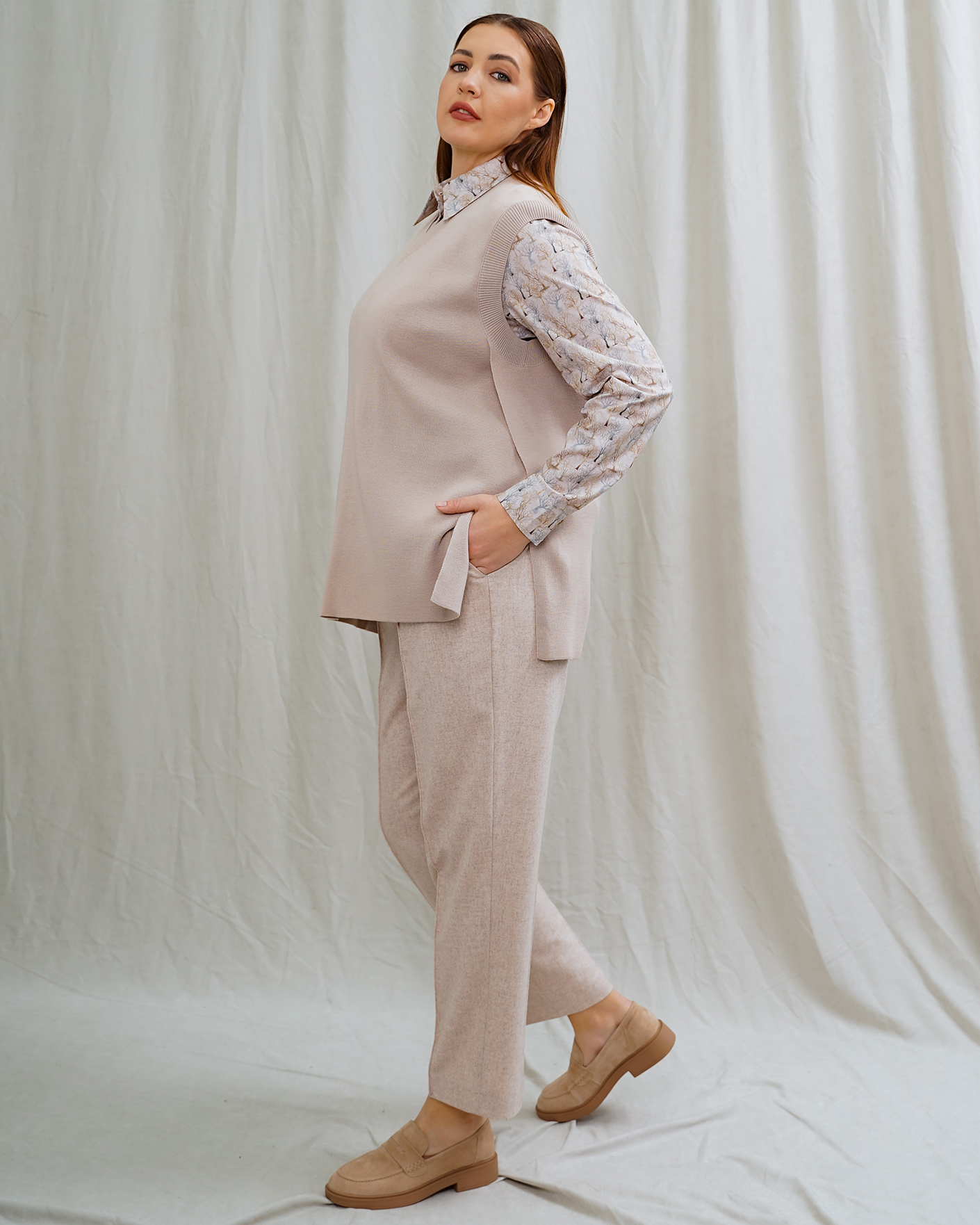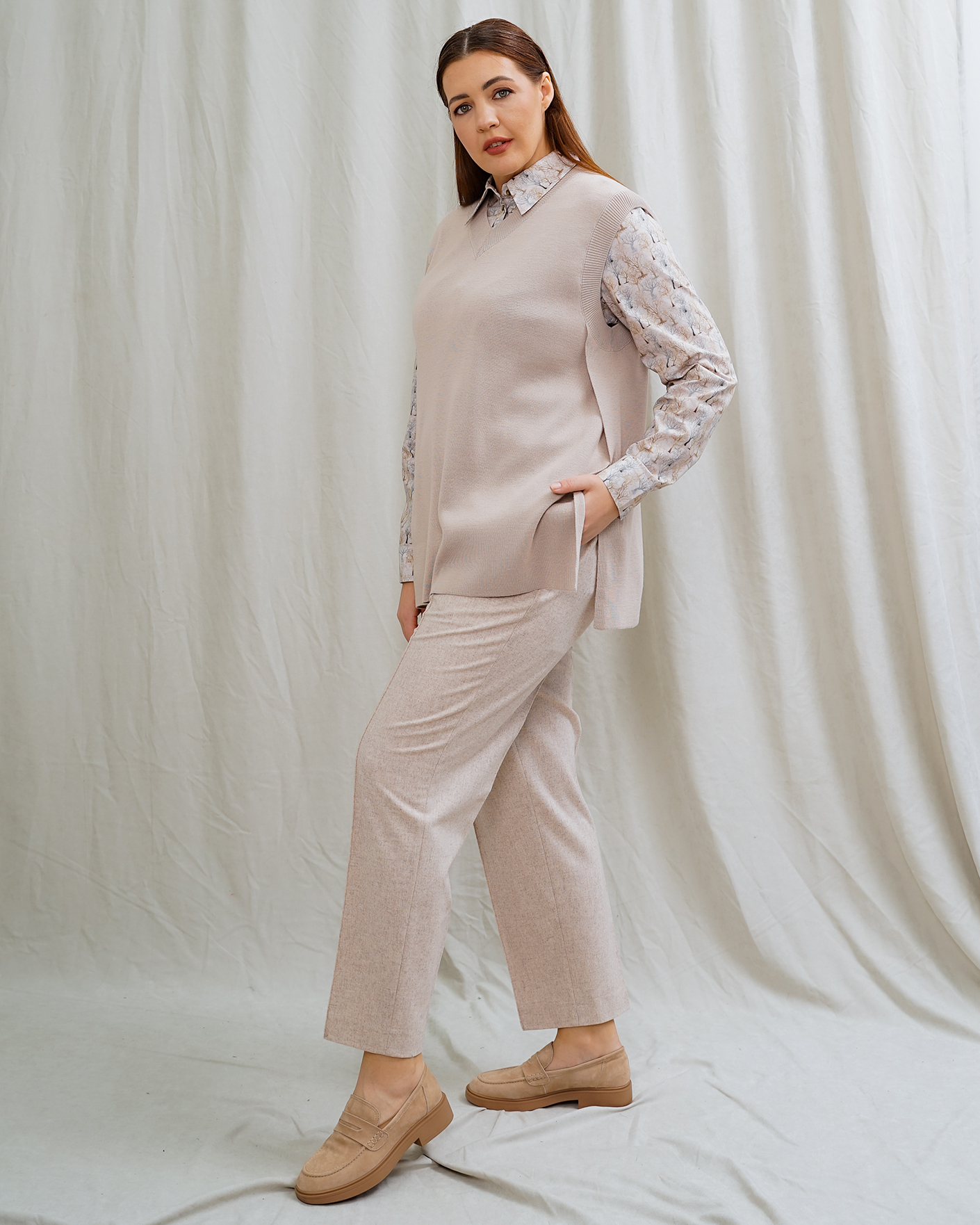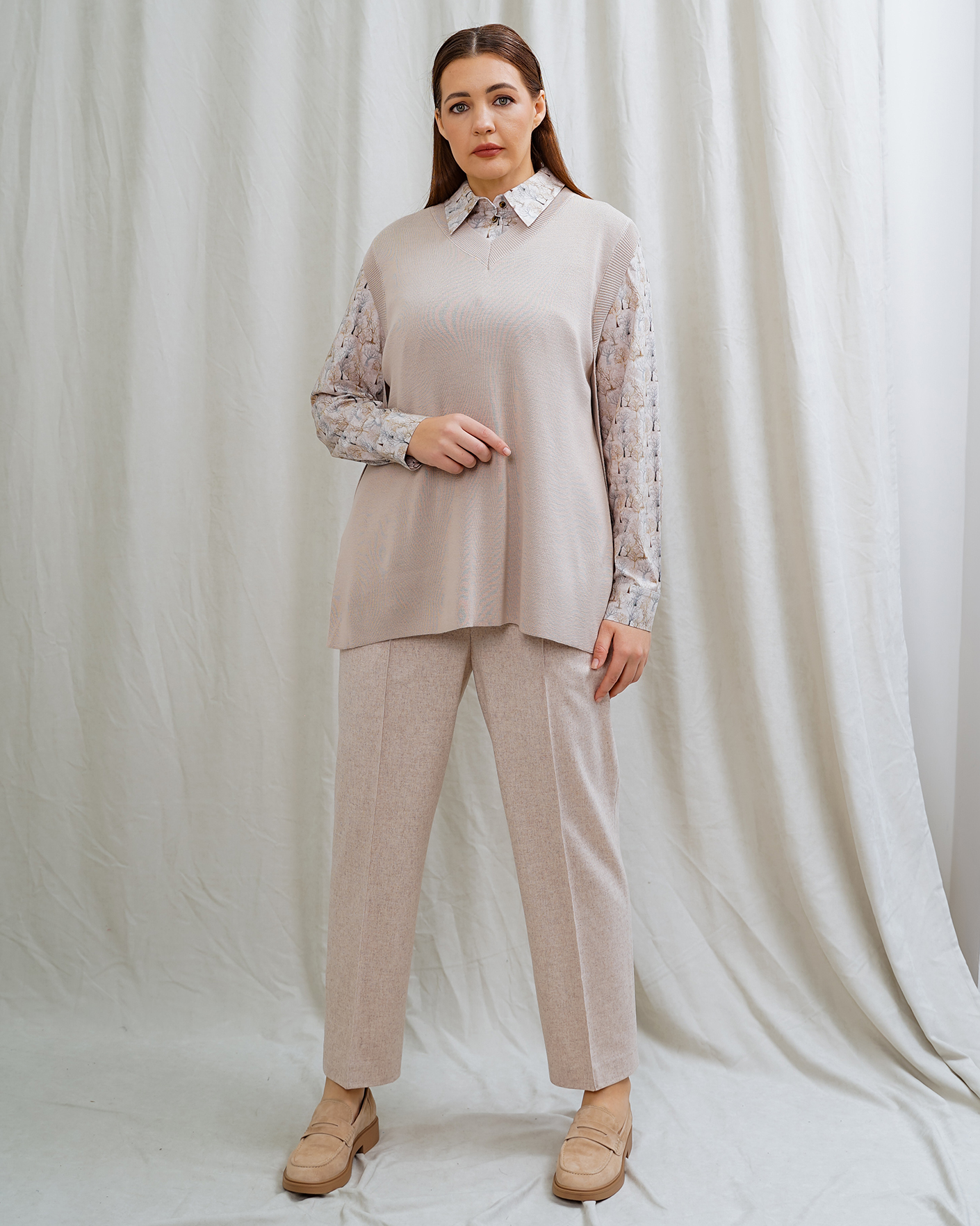 Стильный образ на каждый день от Nelva состоит из жилета розово-бежевого цвета в строчный рисунок с V-образным вырезом и боковыми разрезами, хлопковой светло-бежевой рубашки в рисунок в виде деревьев, а также из зауженных джоггеров розово-бежевого цвета со стрелками и на эластичном поясе.