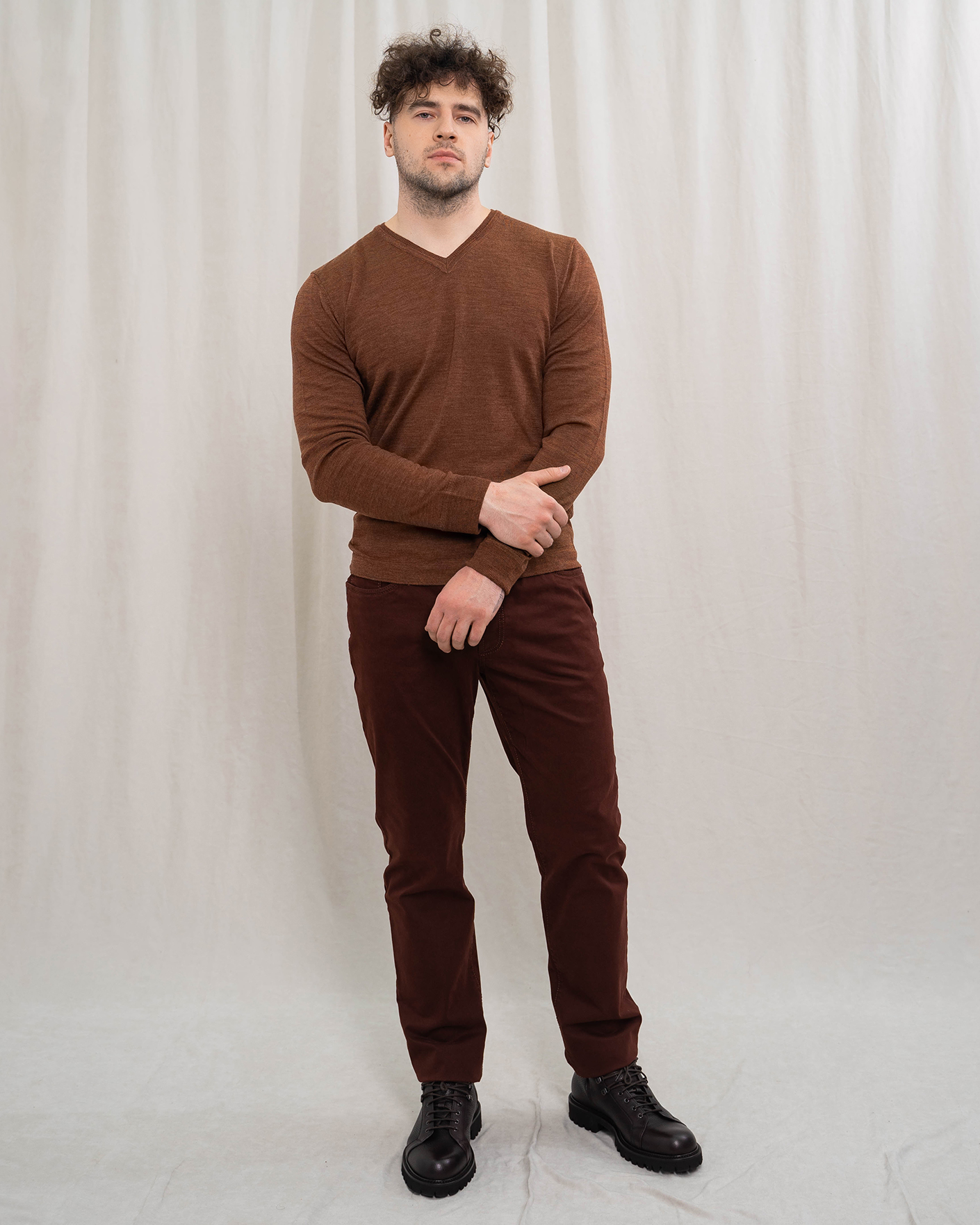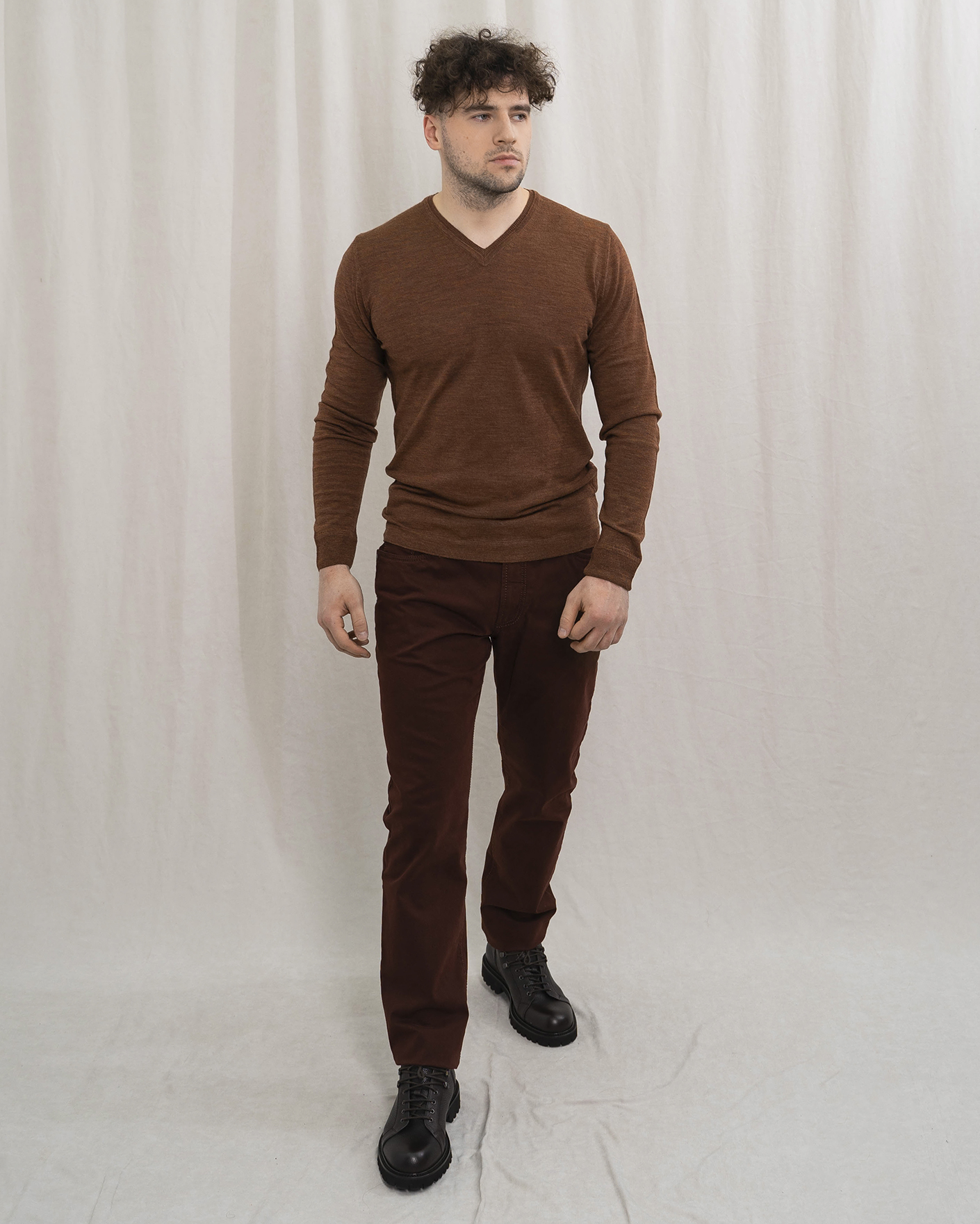 Стильный образ на каждый день и для деловых встреч состоит из пуловера из 100% шерсти и из хлопоквых джинс кирпичного цвета.