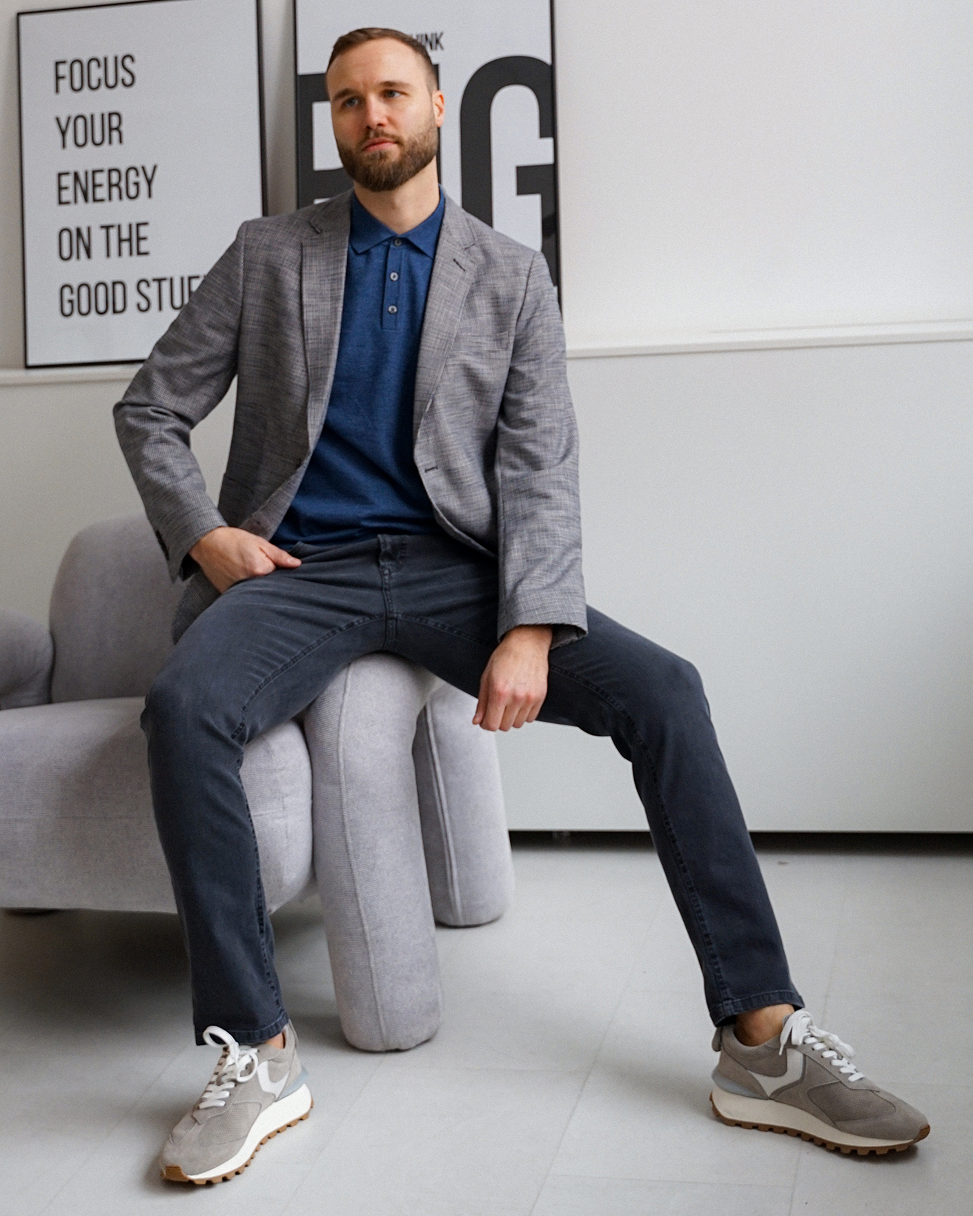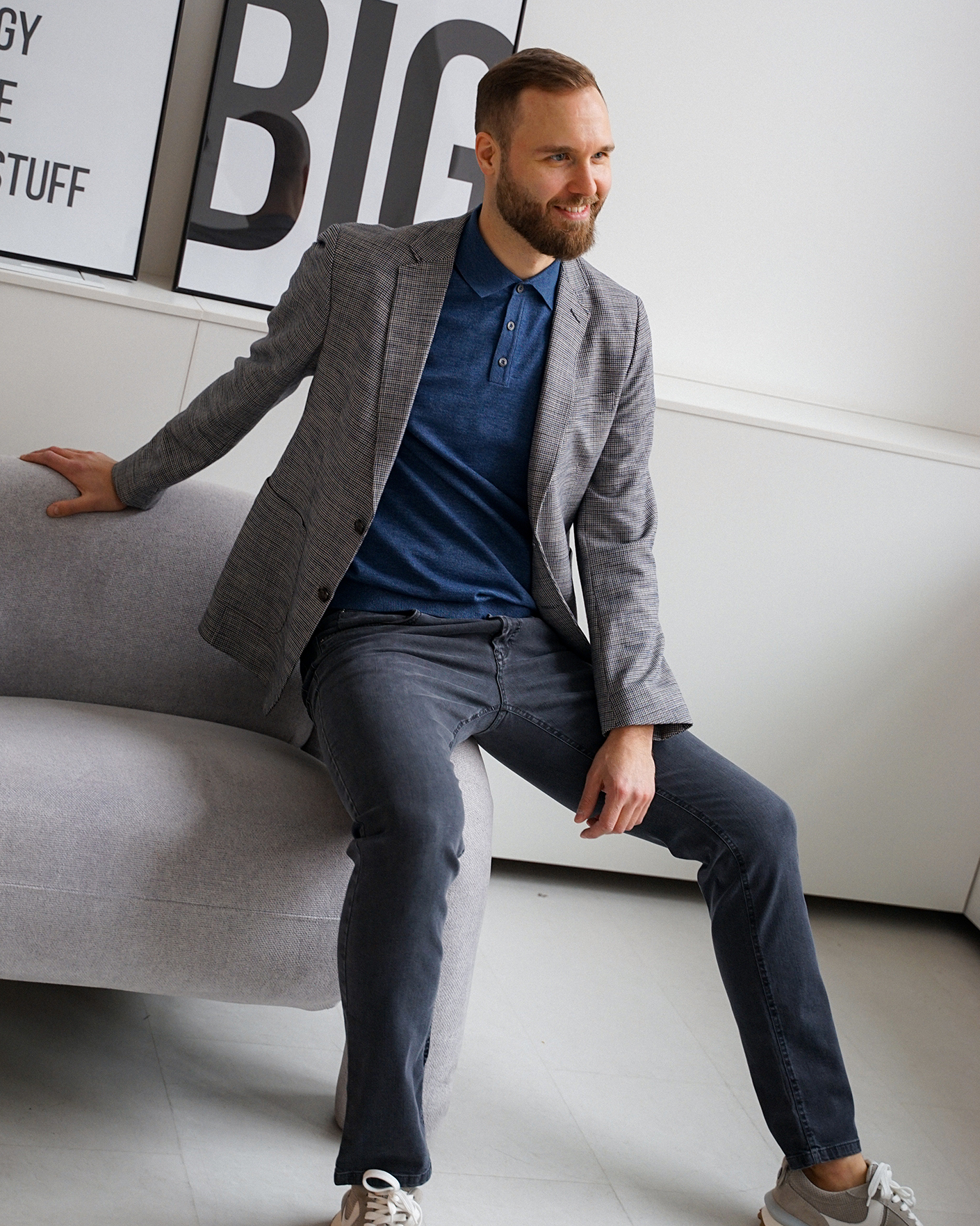 Стильный образ на каждый день и для работы в офисе состоит из пиджака в мелкий строчный рисунок, из хлопкового джемпера-поло с короткими рукавами серо-синего цвета в строчный рисунок, а также из базовых джинс серого цвета.
