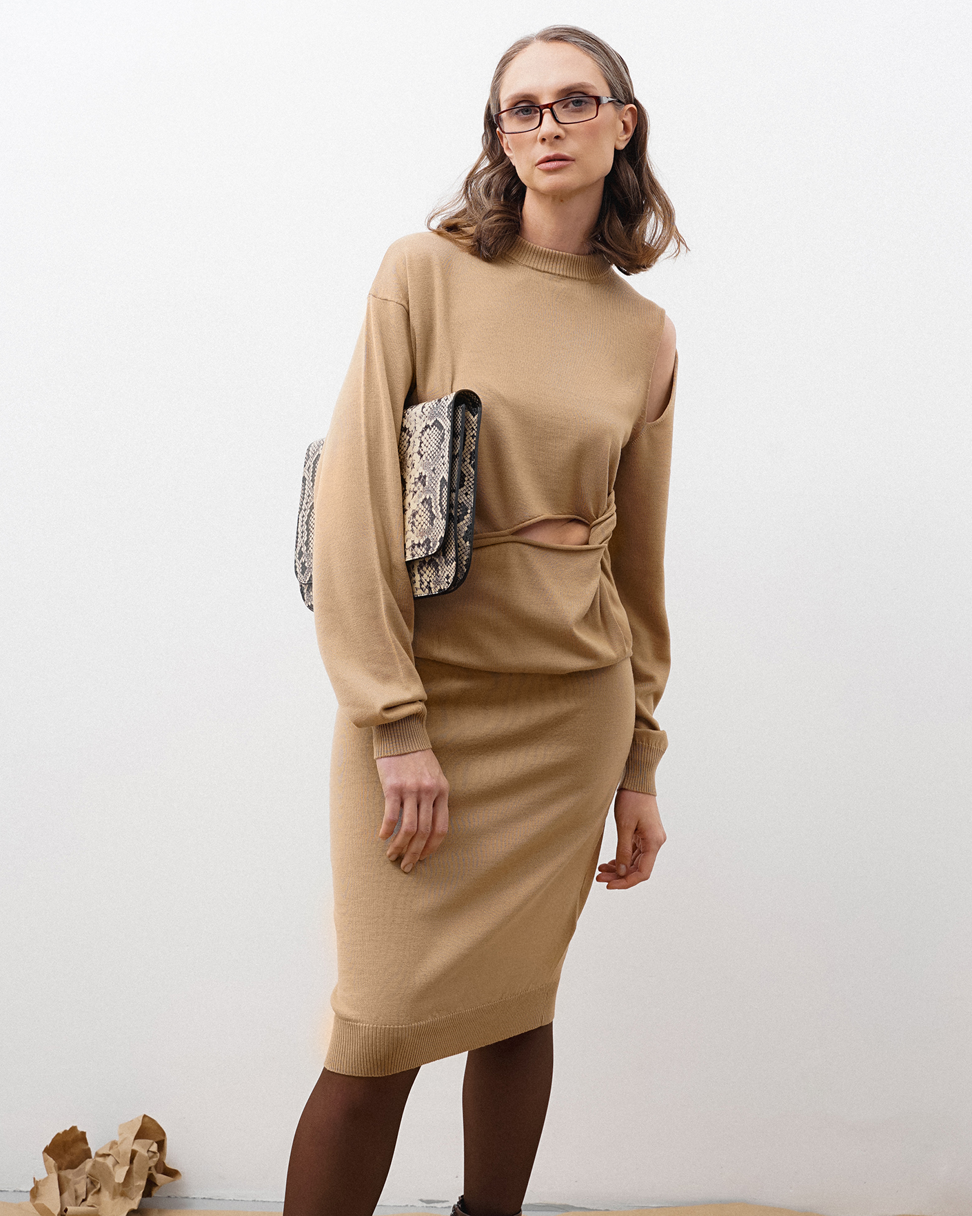Стильный образ Sportmax на каждый день и для работы в офисе состоит из свободного джемпера бежевого цвета с перекрещенными разрезами, также из юбки-карандаш бежевого цвета в строчный рисунок на эластичном поясе.