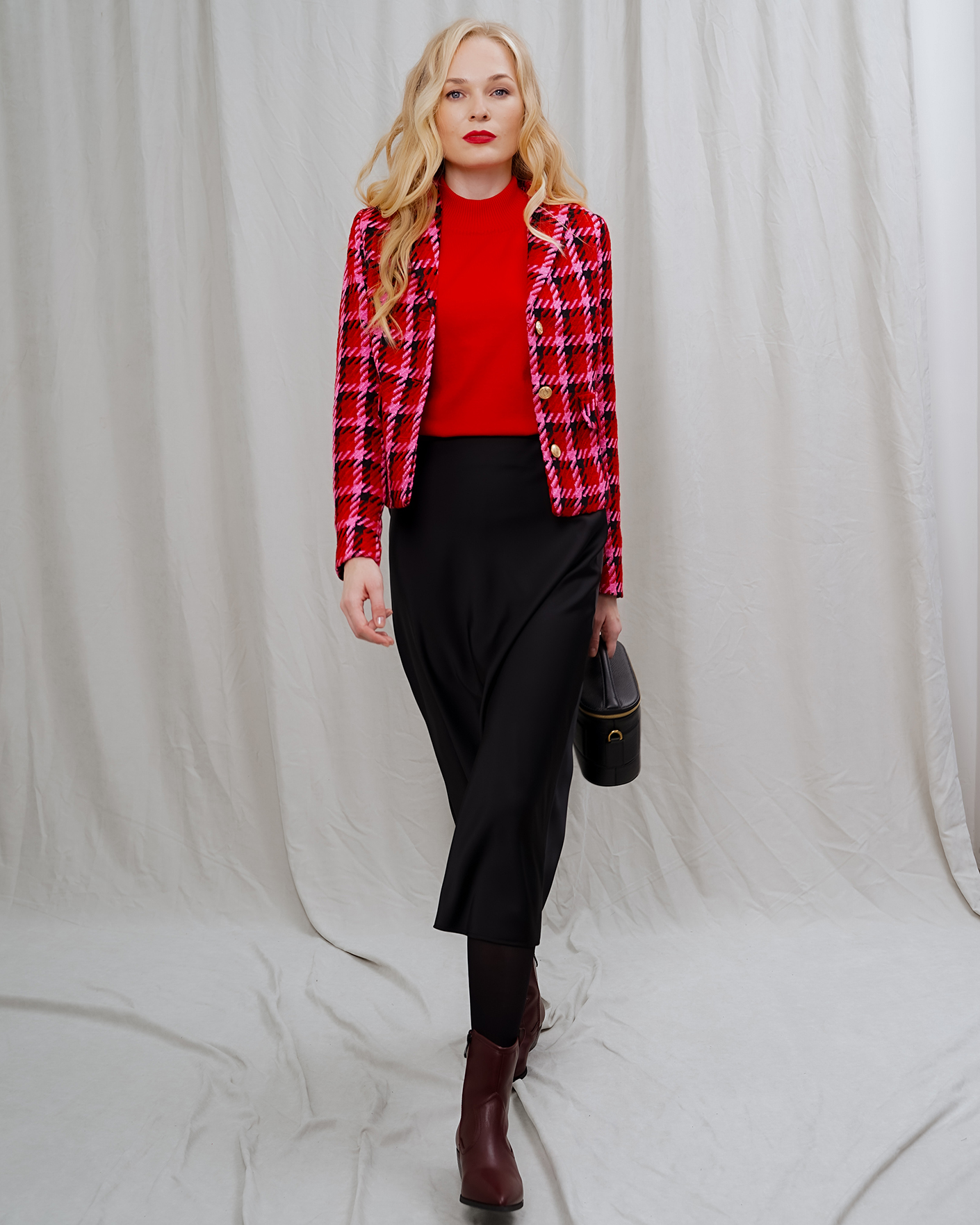 Стильный образ на каждый день и на деловую встречу состоит из укороченного жакета розово-красного цвета в строчный геометрический рисунок, из полуприталенного красного топ-жилета, а также из черной юбки-трапеции в А-силуэте и длины миди.