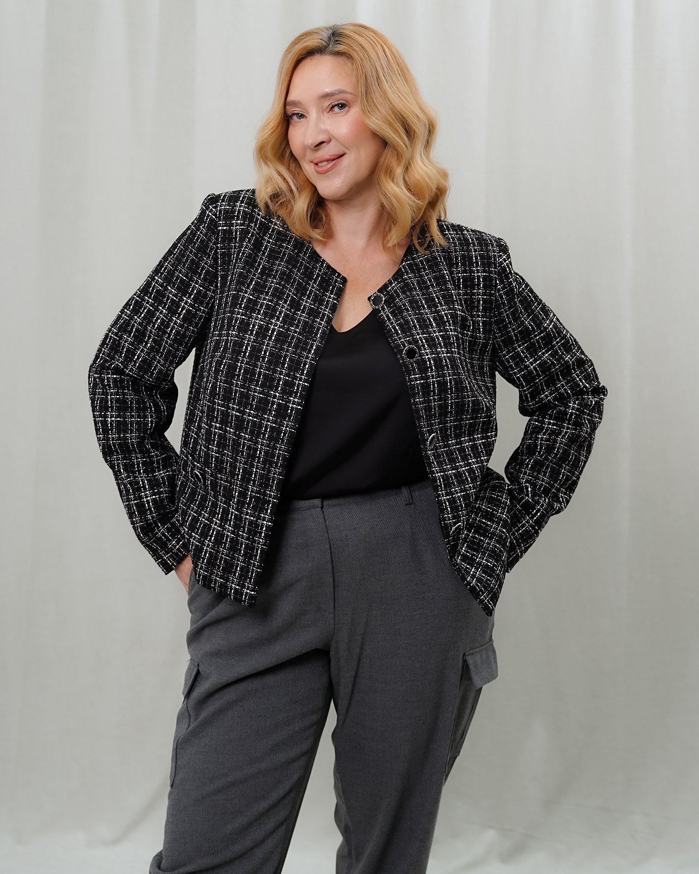 Строгий деловой образ на каждый день состоит из твидового полуприталенного жакета бело-черного цвета в клетчатый рисунок, из черного топа с V-образным вырезом, также из брюк-карго-банан серого цвета в диагональную строчную полосу.