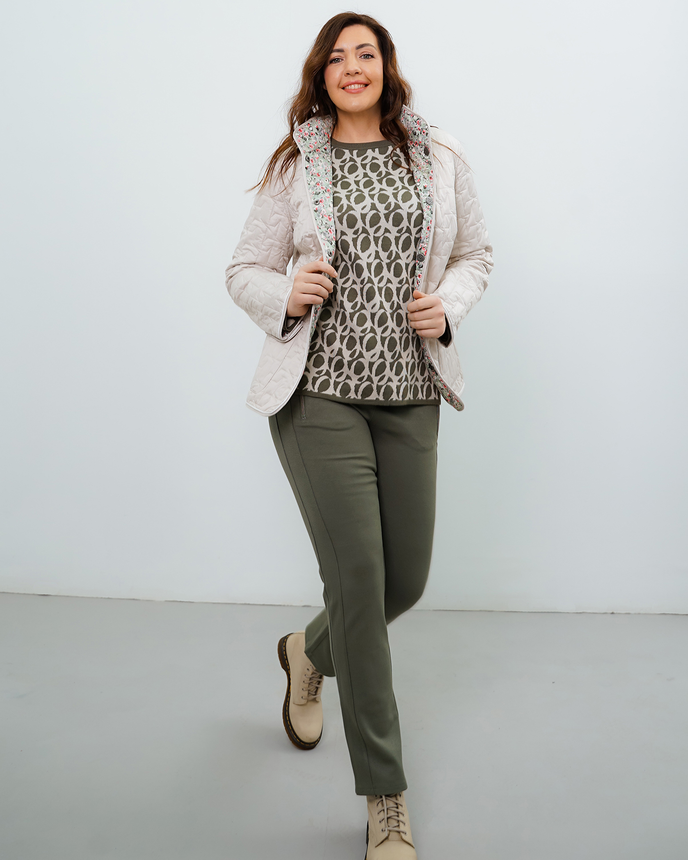 Универсальный образ на каждый день и для комфортных прогулок состоит из двусторонней куртки на клепках и в геометрическую стежку, из полуприталенного джемпера бежево-зеленого цвета в абстрактный и строчный рисунок, а также из зауженных джоггеров зеленого цвета в диагональную строчную полосу.