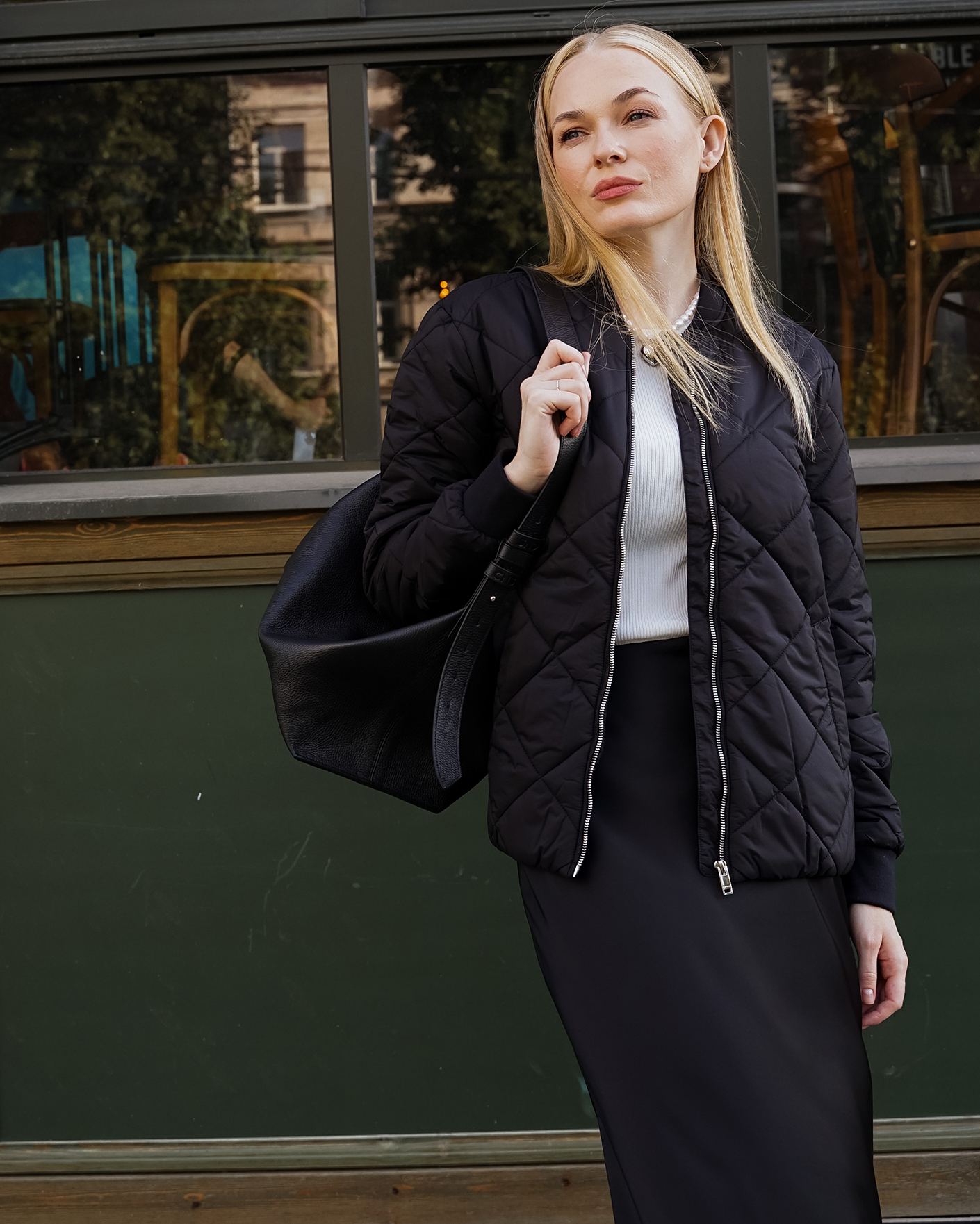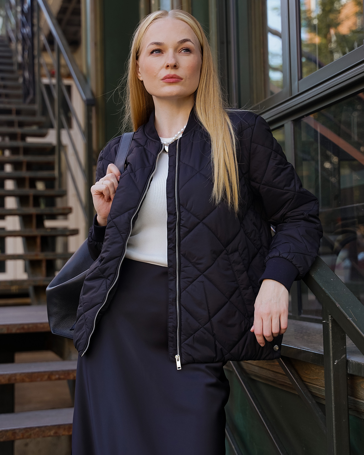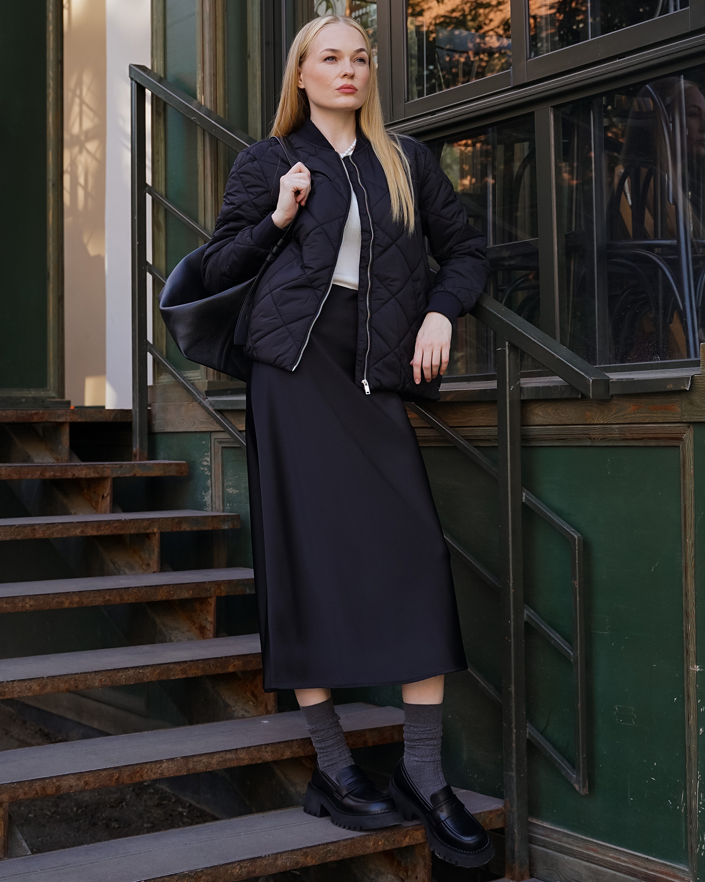 Универсальный и стильный образ от Emka на каждый день состоит из стеганой куртки-бомбер черного цвета в ромбическую стежку на молнии, из приталенной майки молочного цвета в узкую вертикальную текстуру, а также из черной юбки-трапеции А-силуэта.