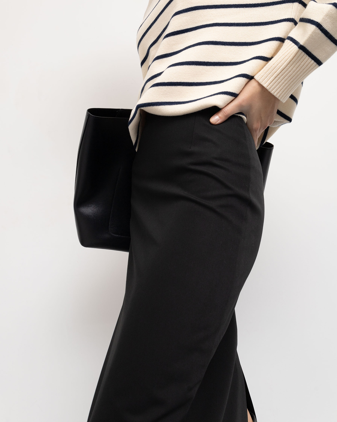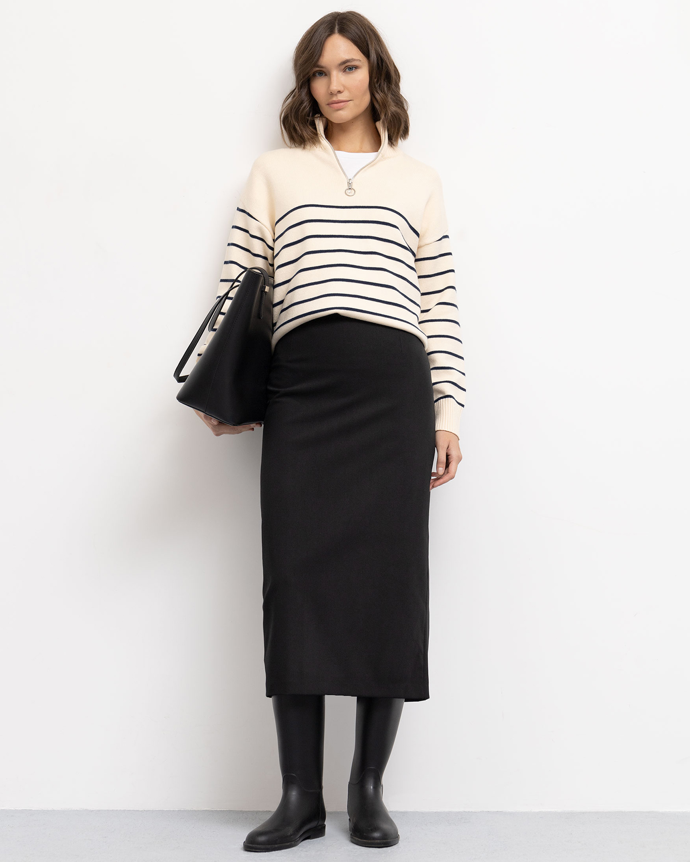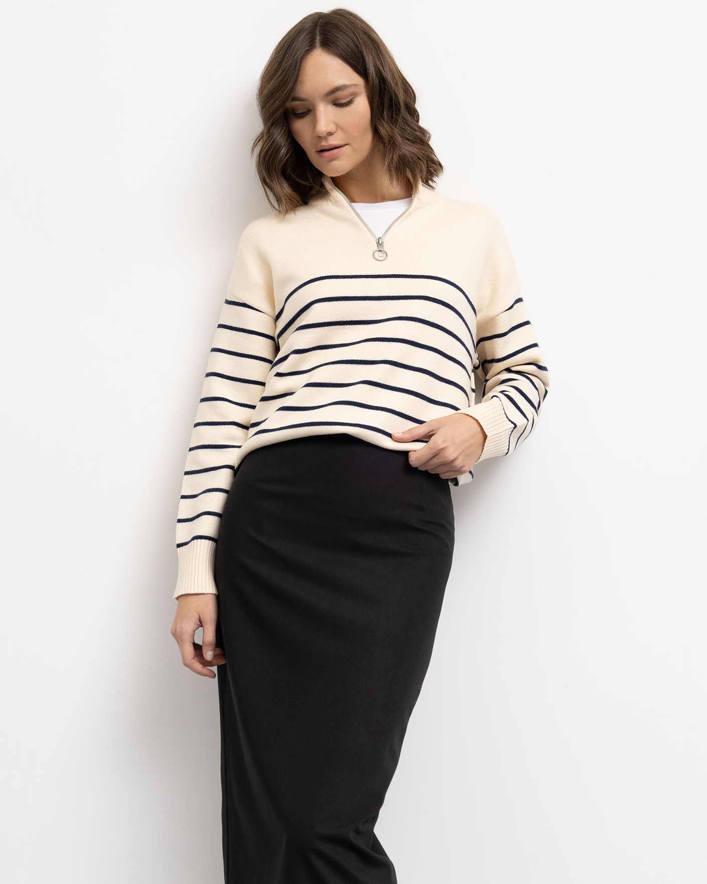 Универсальный образ Emka на каждый день состоит из свободного джемпера в горизонтальную полосу с воротником-стойка на молнии и из идеальной юбки-карандаш черного цвета длины миди.