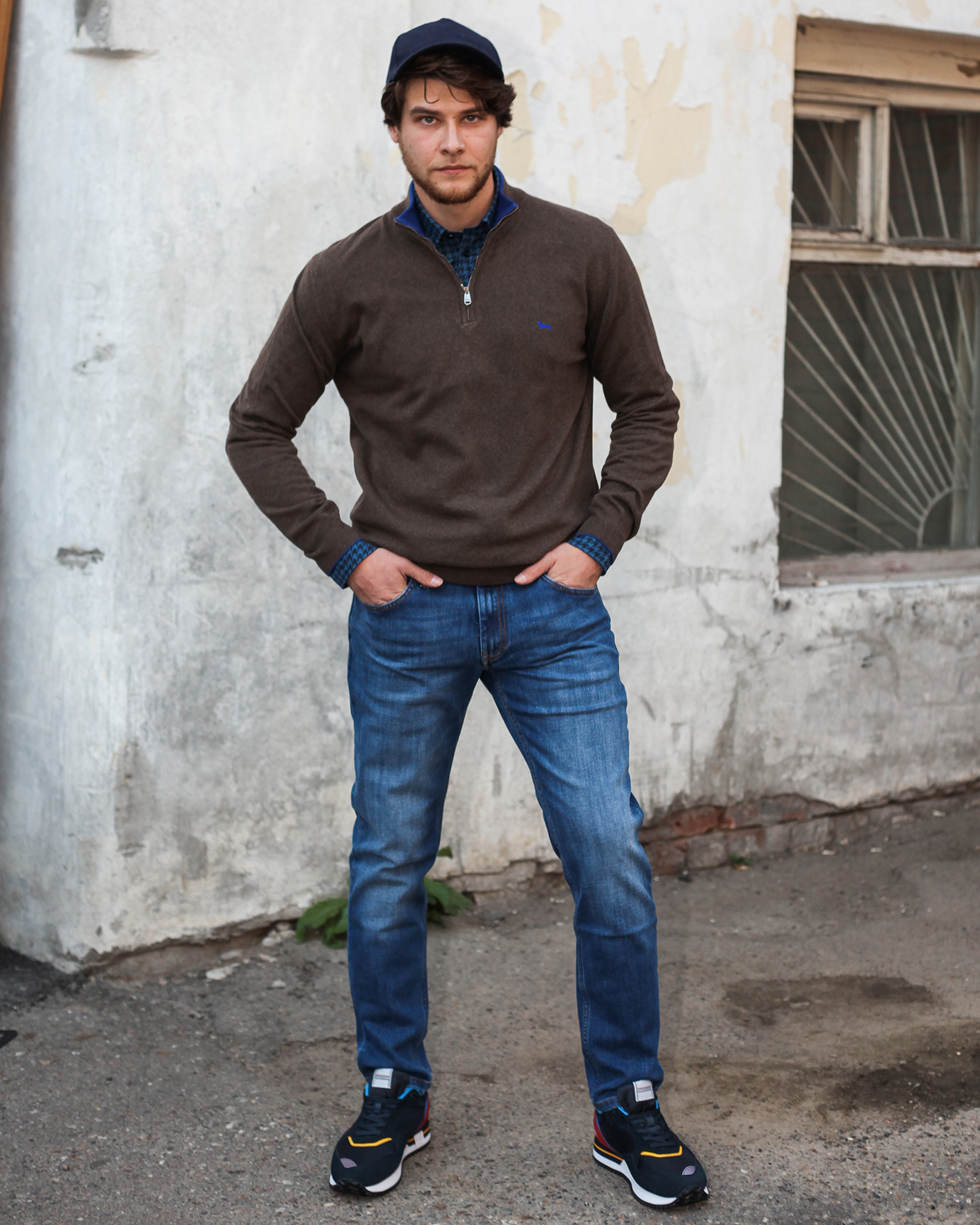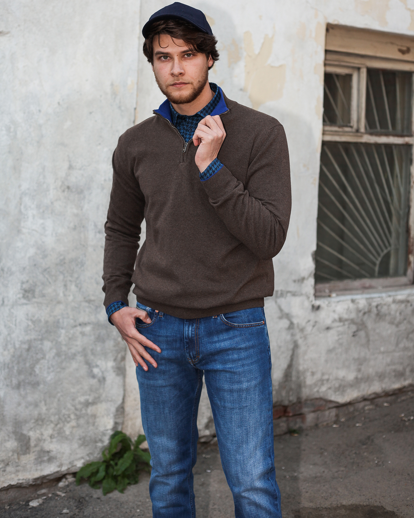 Универсальный образ Harmont&Blaine на каждый день состоит из джемпера серо-коричневого цвета с воротником-стойка на молнии, из хлопковой рубашки синего цвета в мелкий рисунок гусиные лапки и из базовых джинс синего цвета.