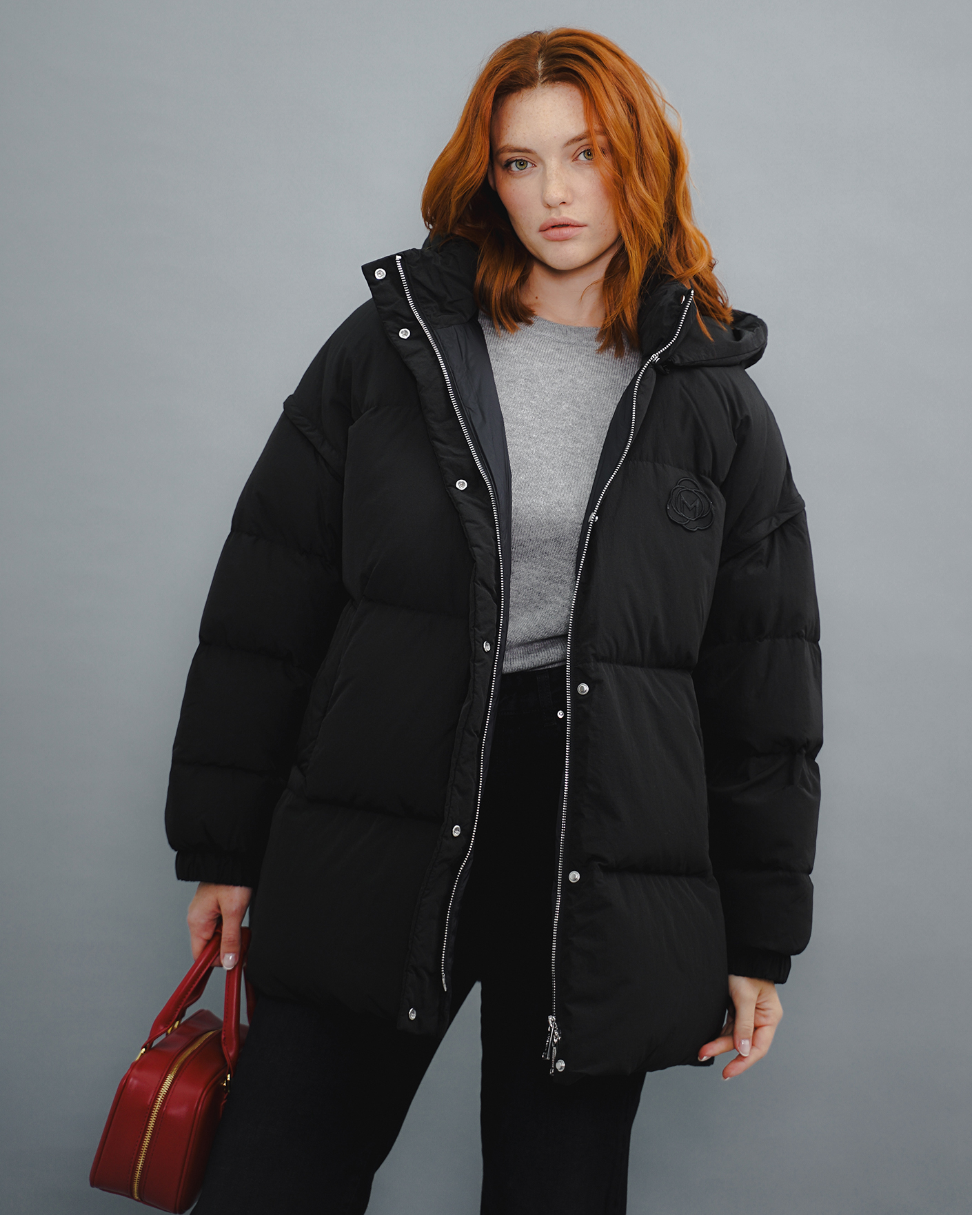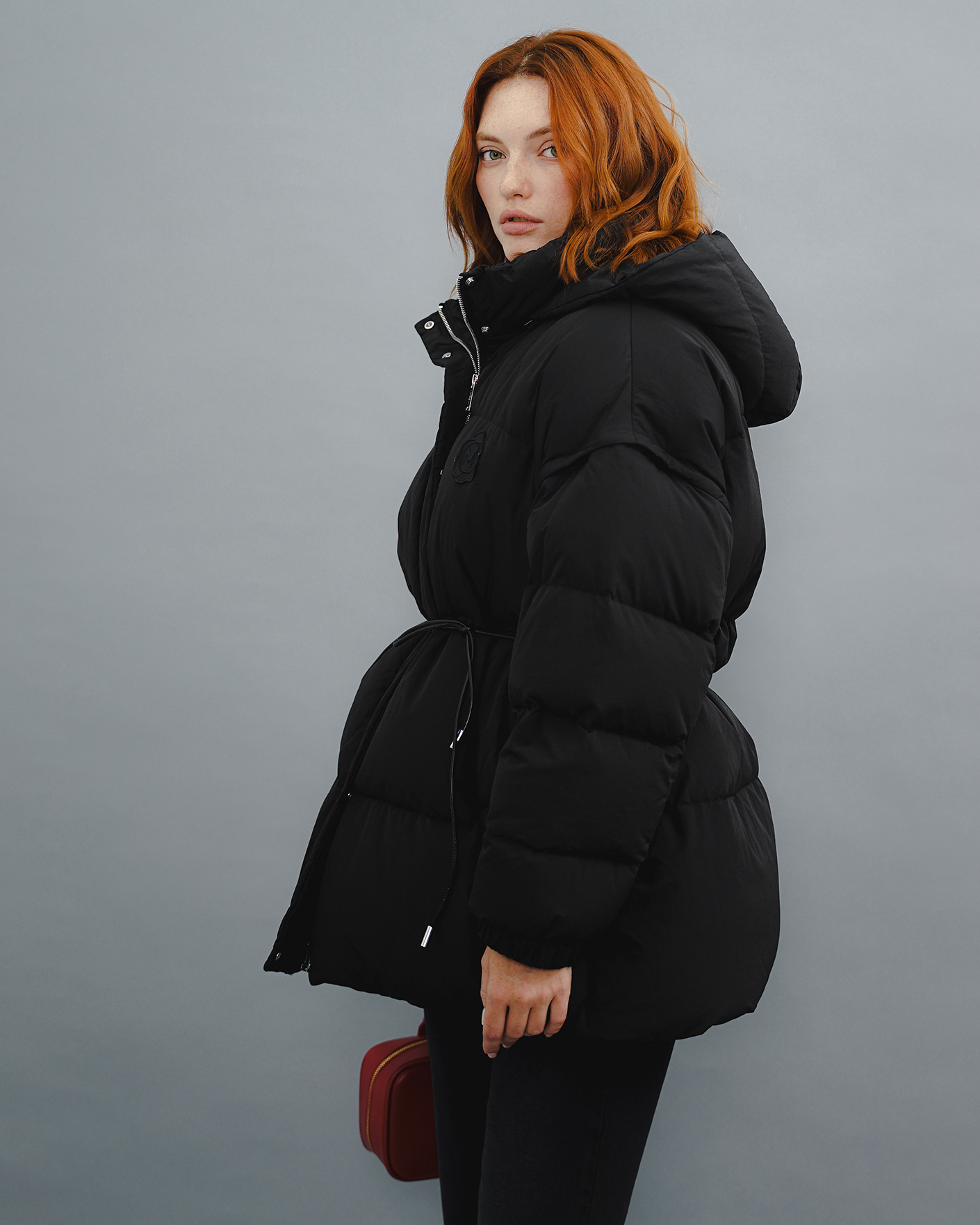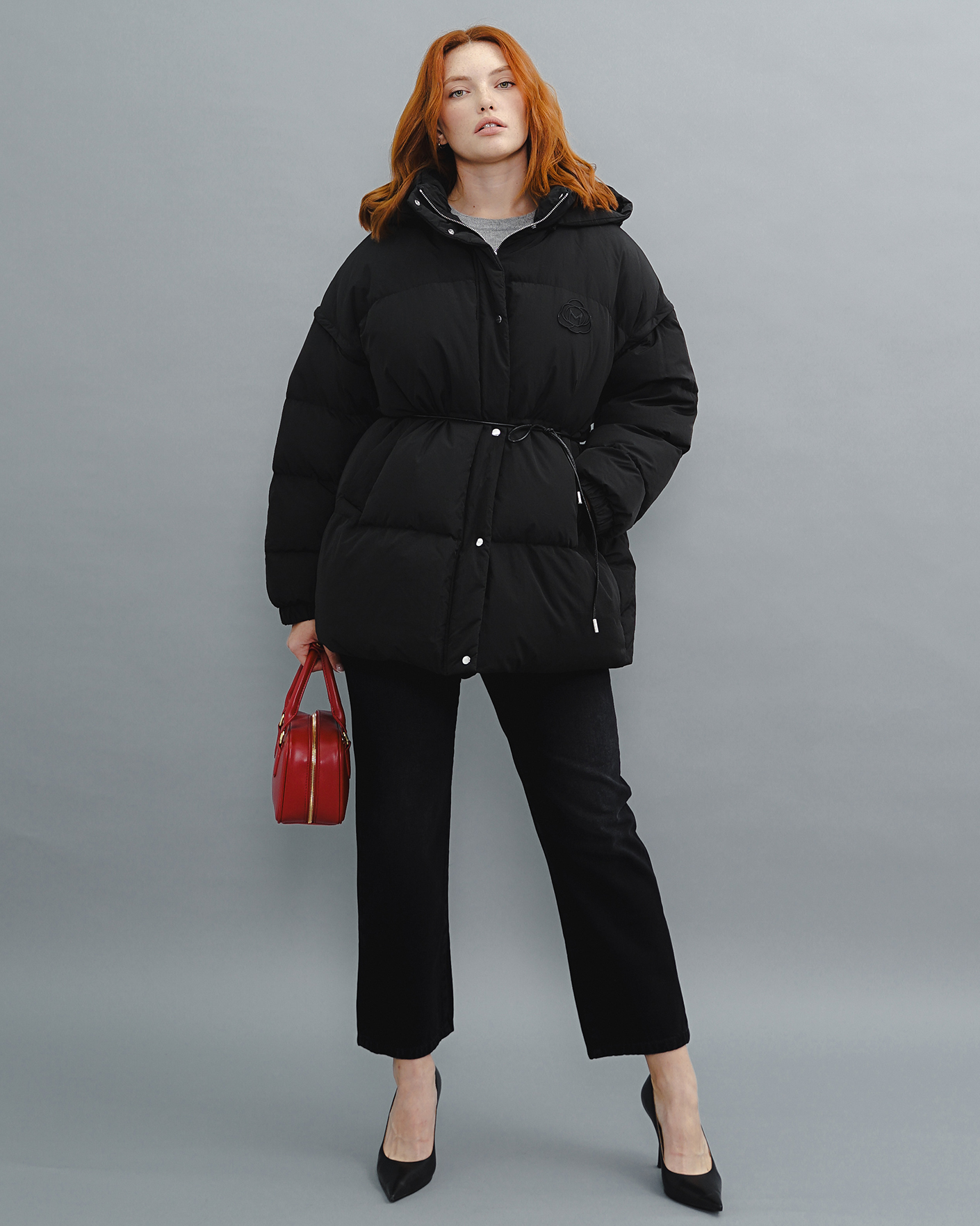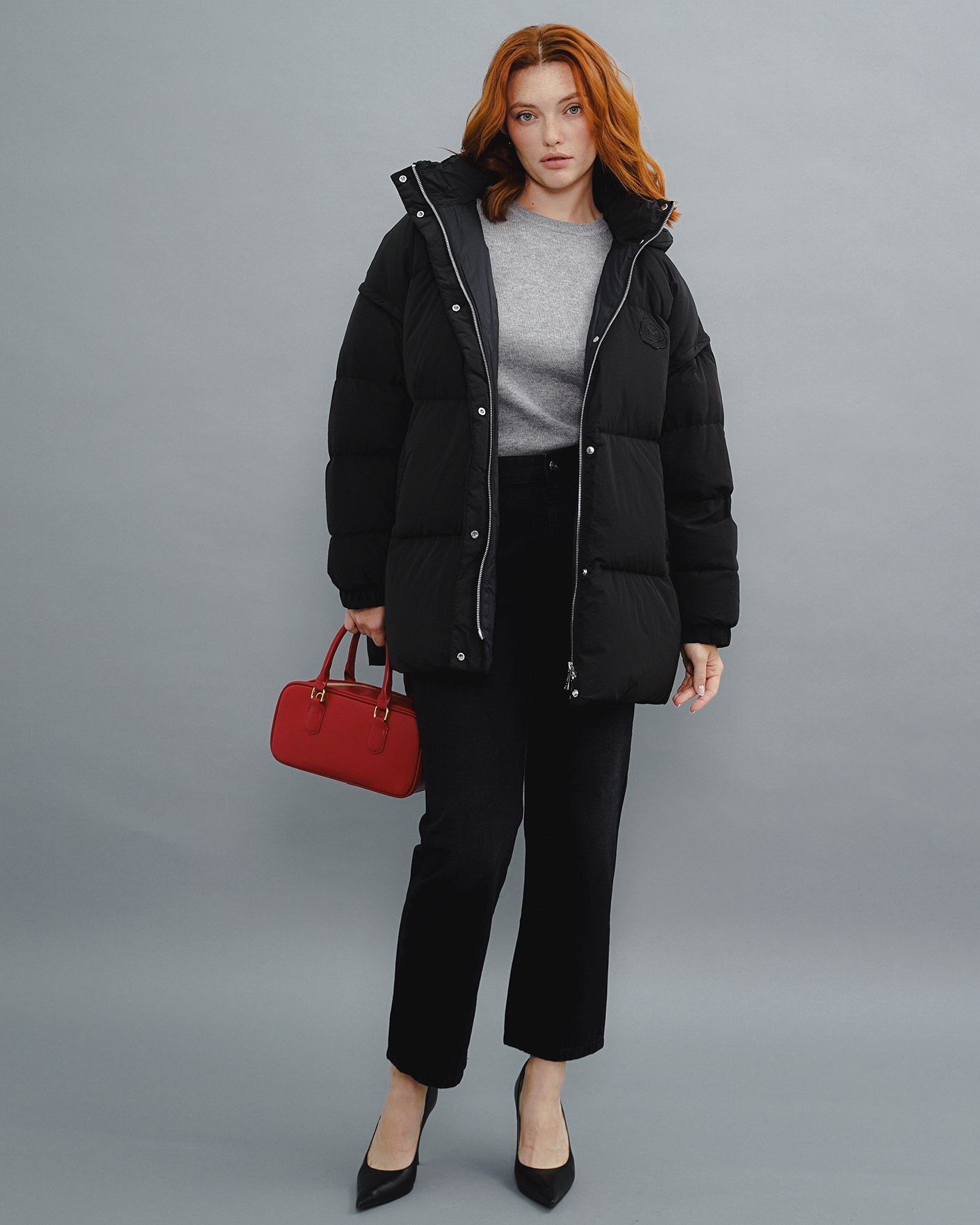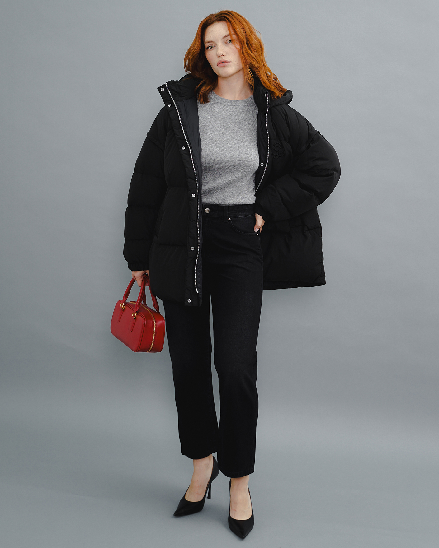 Универсальный образ на каждый день состоит из теплого пуховика в черном цвете с капюшоном, из приталенного джемпера серого цвета с короткими рукавами, а также из хлопковых джинс в черном цвете.