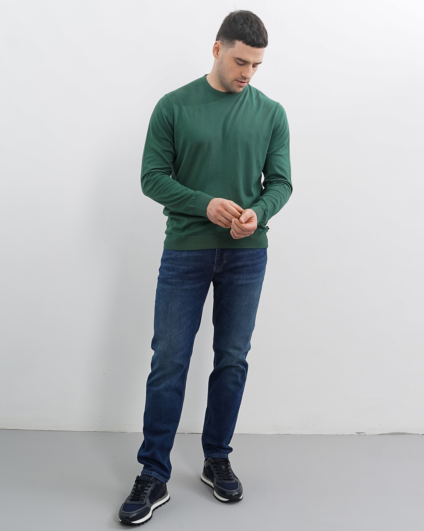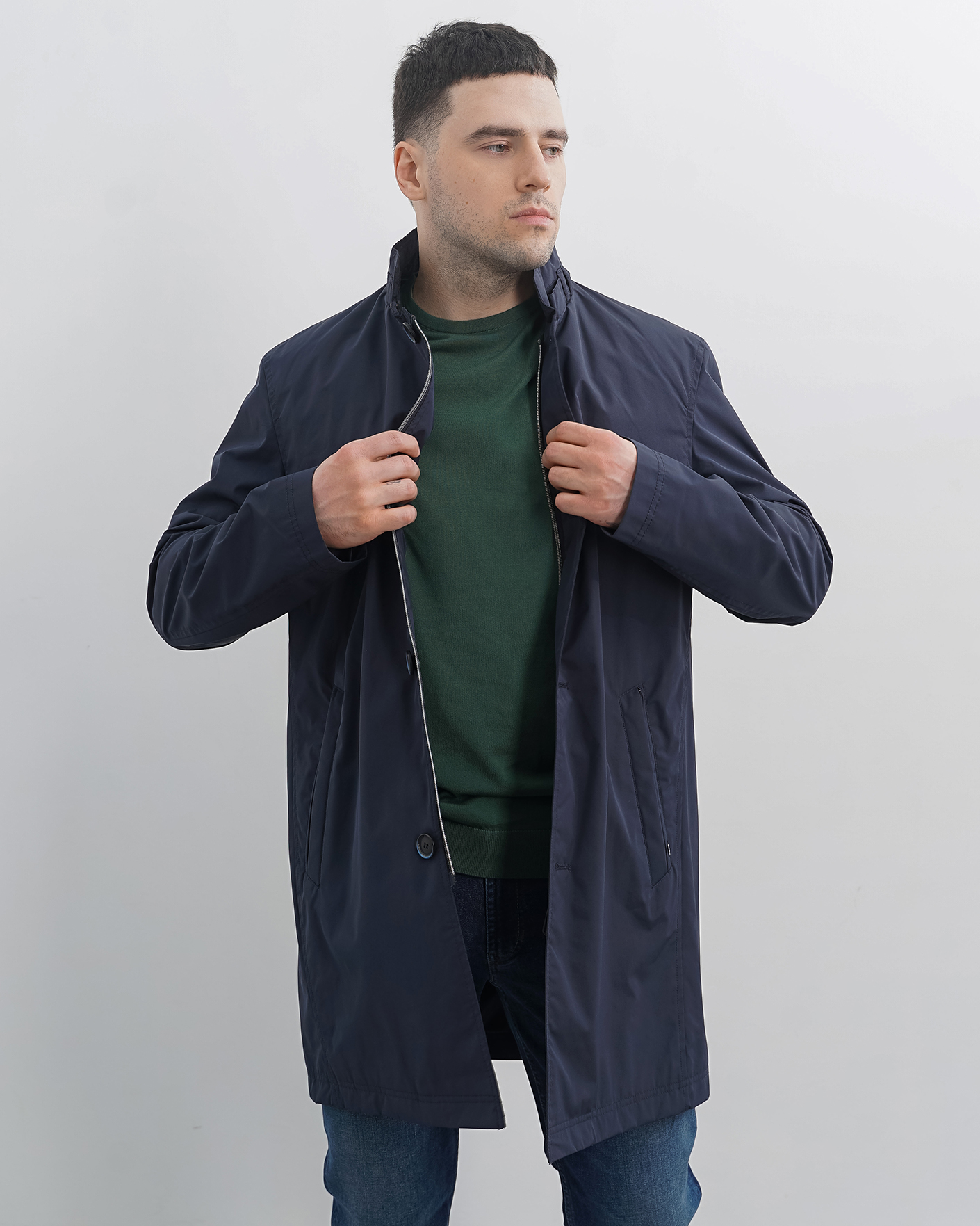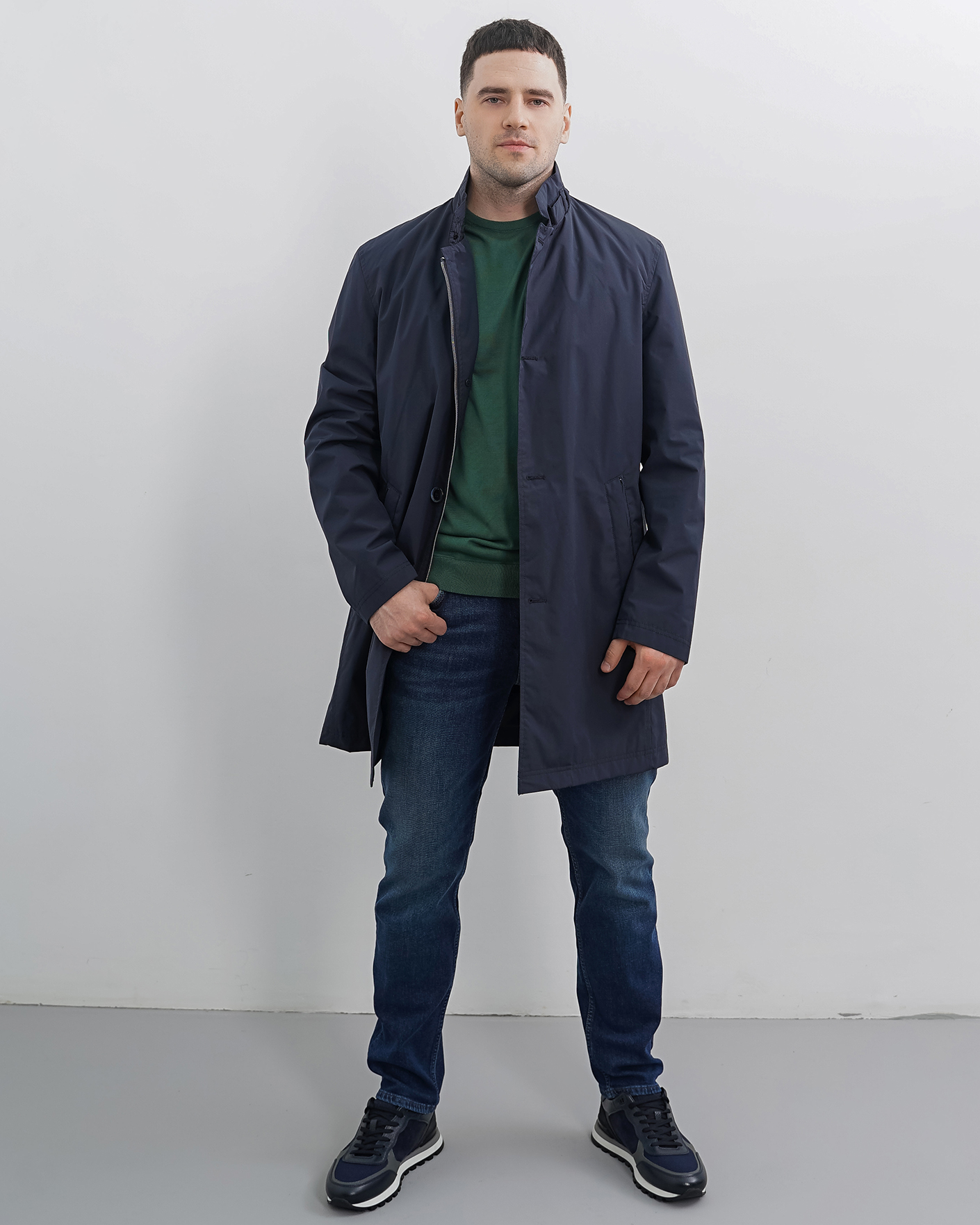 Универсальный образ от Digel на каждый день и для прогулок состоит из темно-синего плаща с застежкой на скрытую молнию и планку на пуговицы, из хлопкового джемпера серо-зеленого цвета, а также из базовых джинс синего цвета.