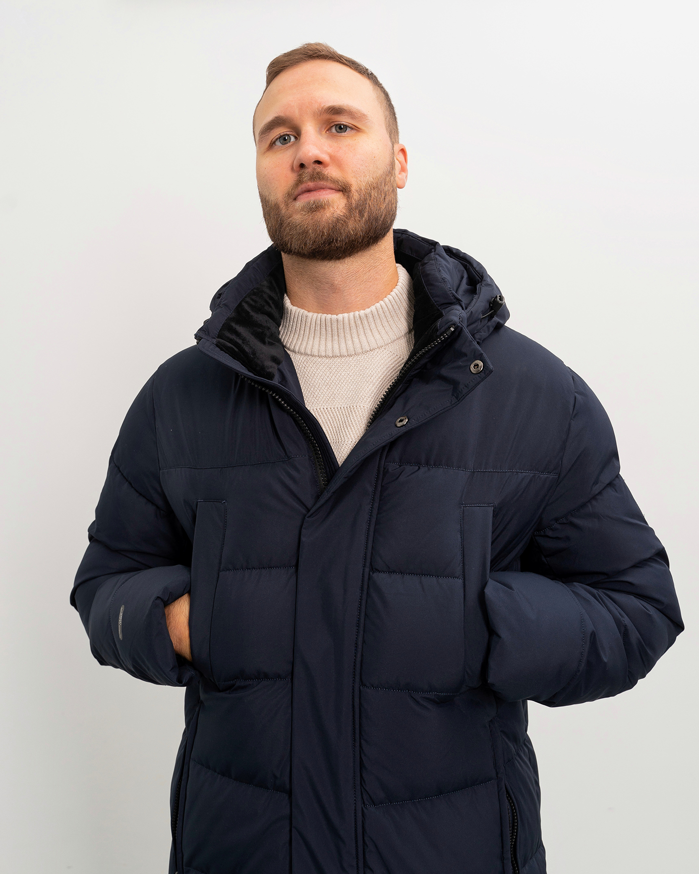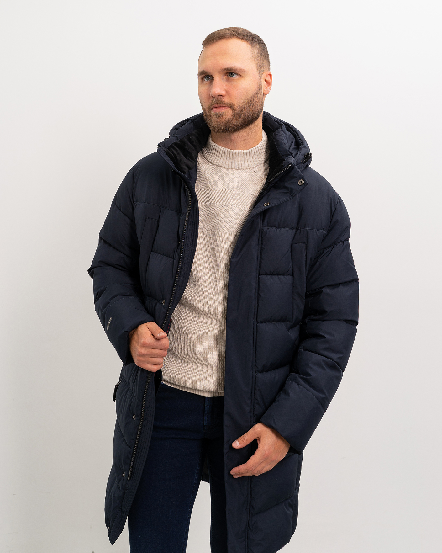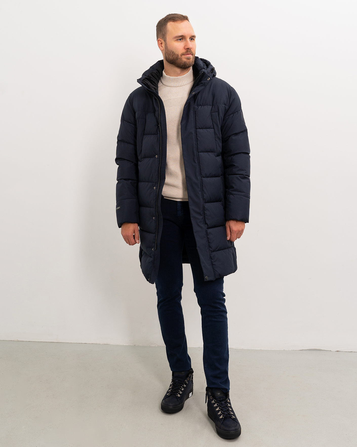 Универсальный осенний образ на каждый день и для работы в офисе состоит из утепленного пальто с капюшоном, из хлопкового джемпера в строчный геометрический рисунок и из баховых джинс фиолетово-синего цвета.