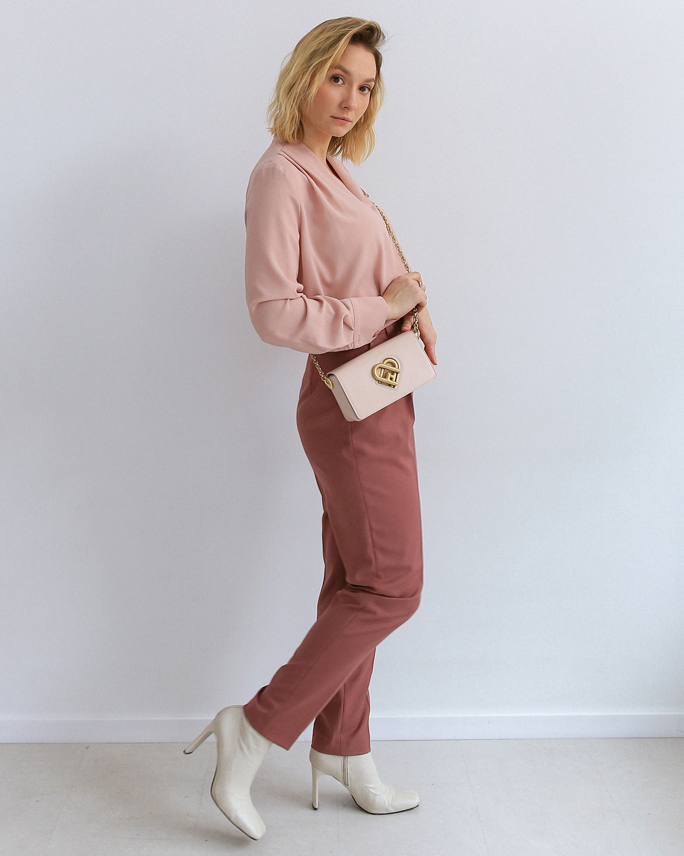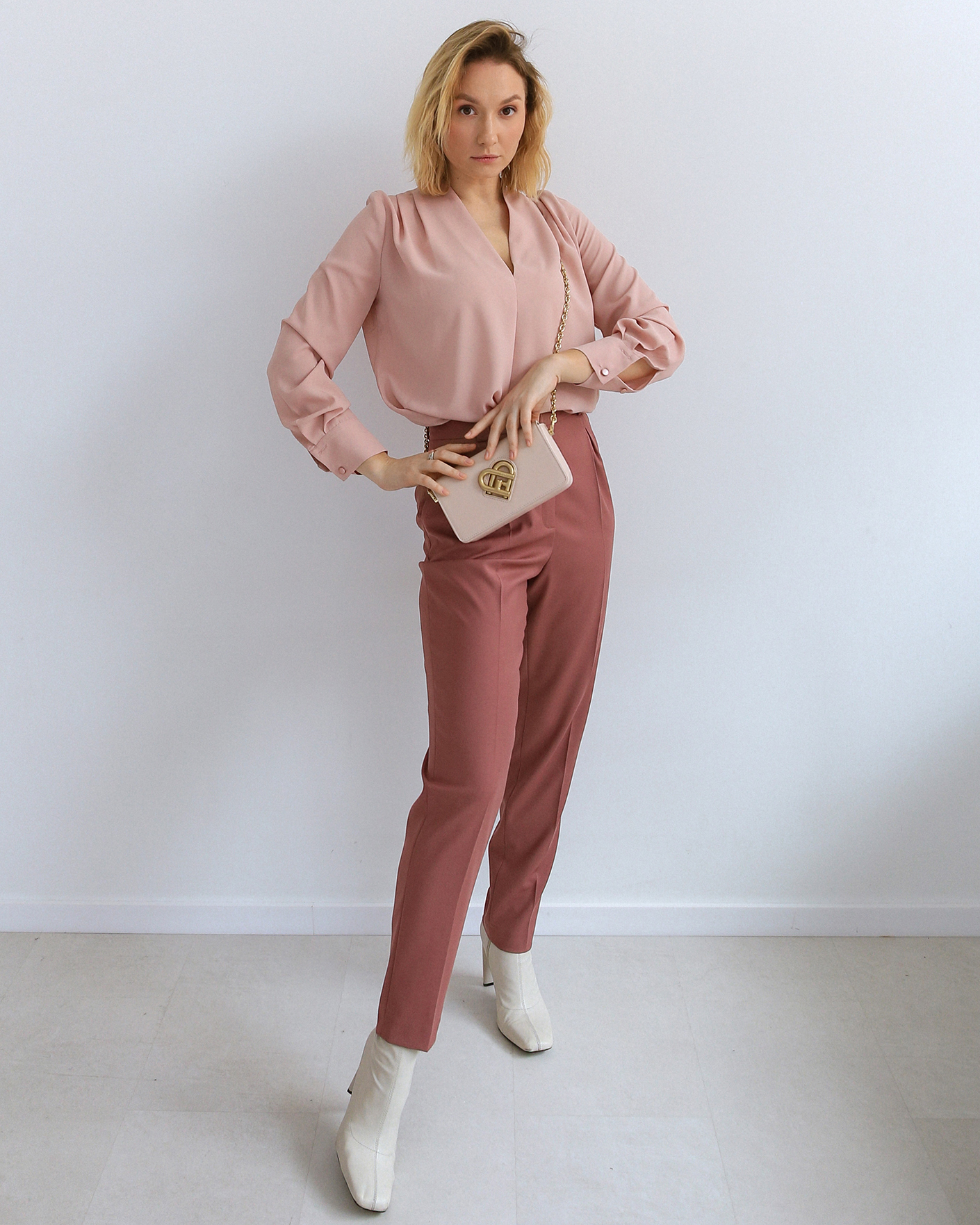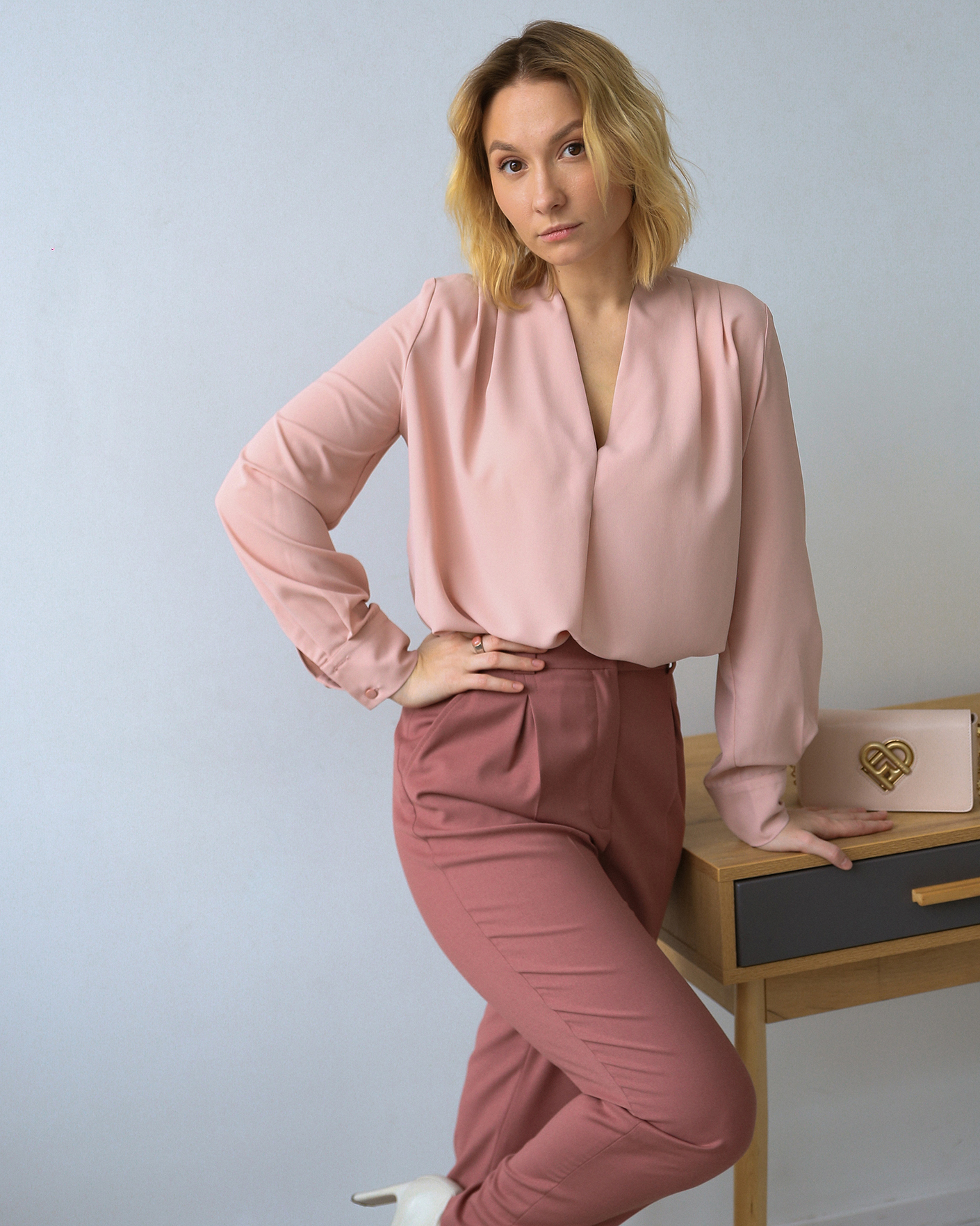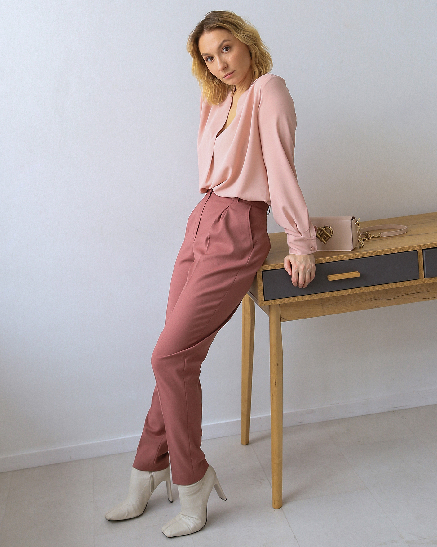 Женственный деловой образ на каждый день состоит из свободной блузы серо-розового цвета с V-образным вырезом и из зауженных брюк с аккуратными складками и стрелками.