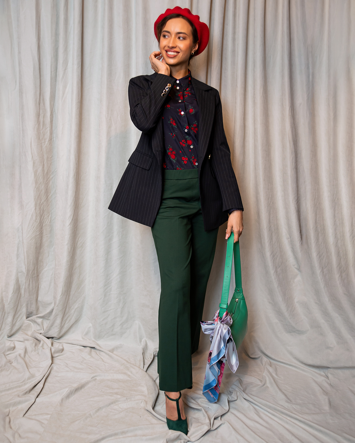 Женственный романтичный образ на каждый день состоит из приталенного жакета темно-синего цвета в узкую вертикальную полосу, из свободной блузы из 100% шелка красно-фиолетового цвета в цветочный принт, а также из зауженных брюк зеленого цвета со стрелками.