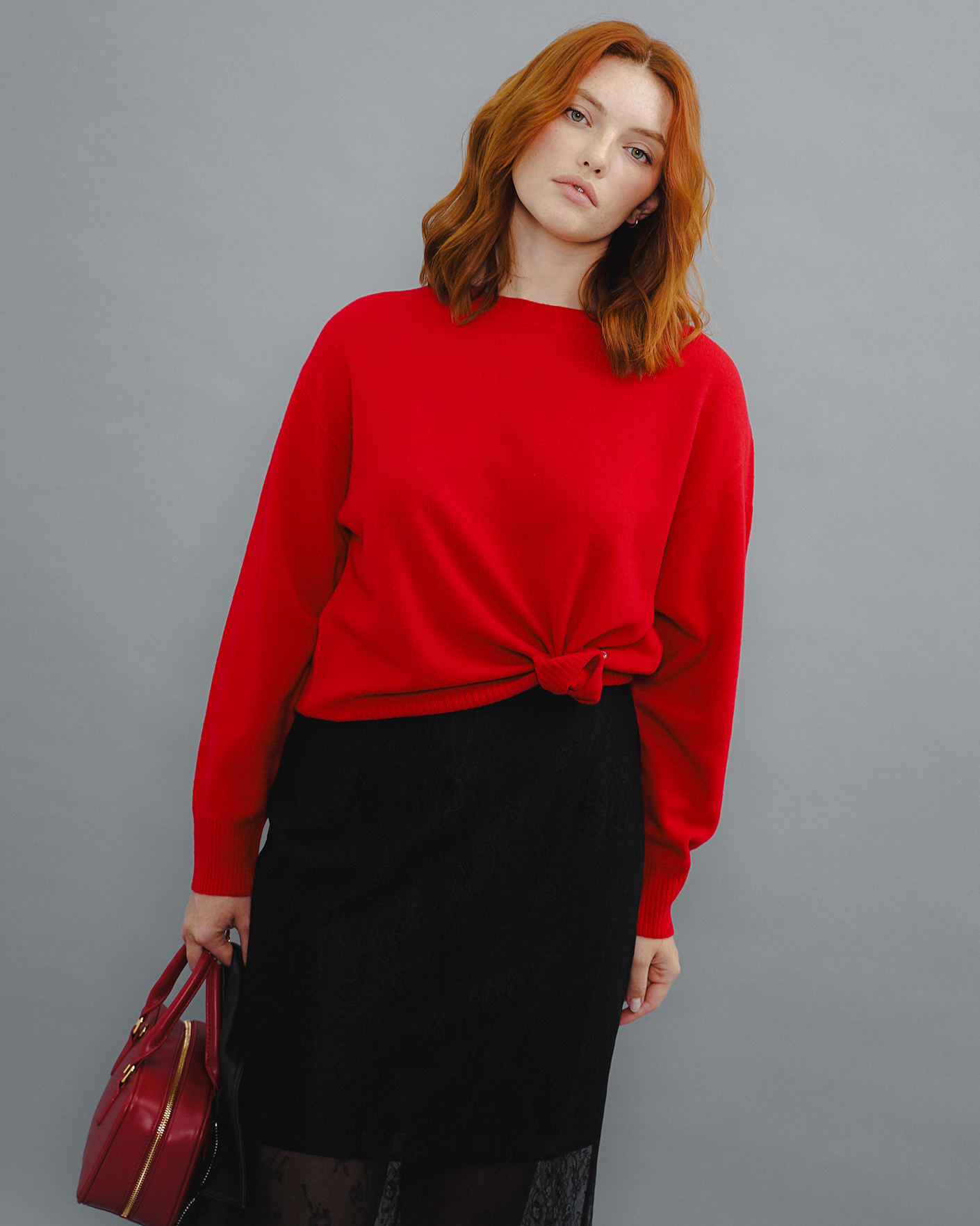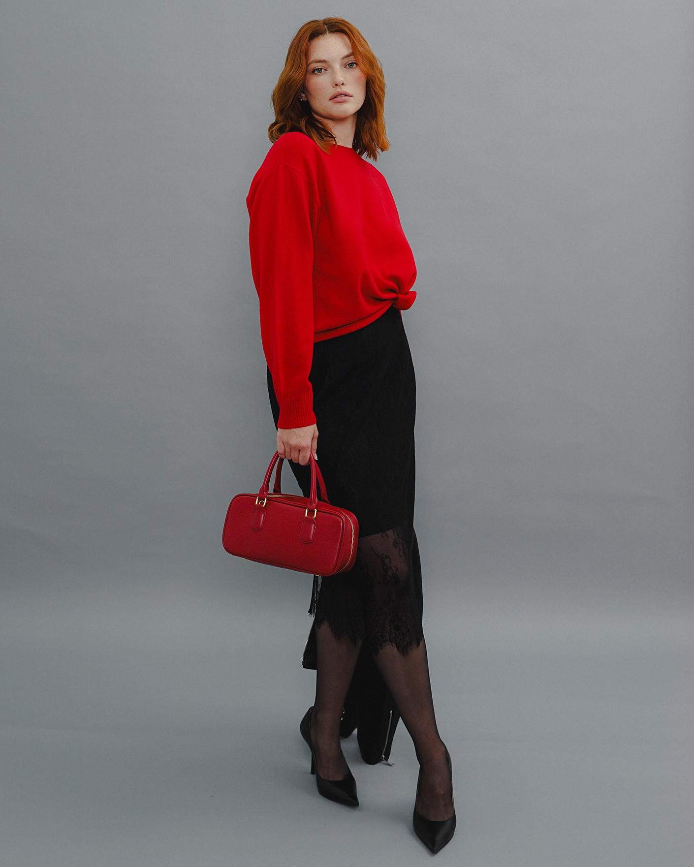 Женственный яркий образ от Marella для стильных прогулок состоит из кожаной куртки на молнии в черном цвете, из свободного джемпера красного цвета в строчный рисунок и из кружевной юбки черного цвета с подкладом.