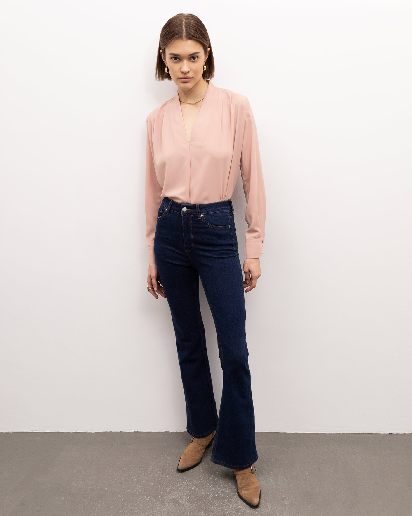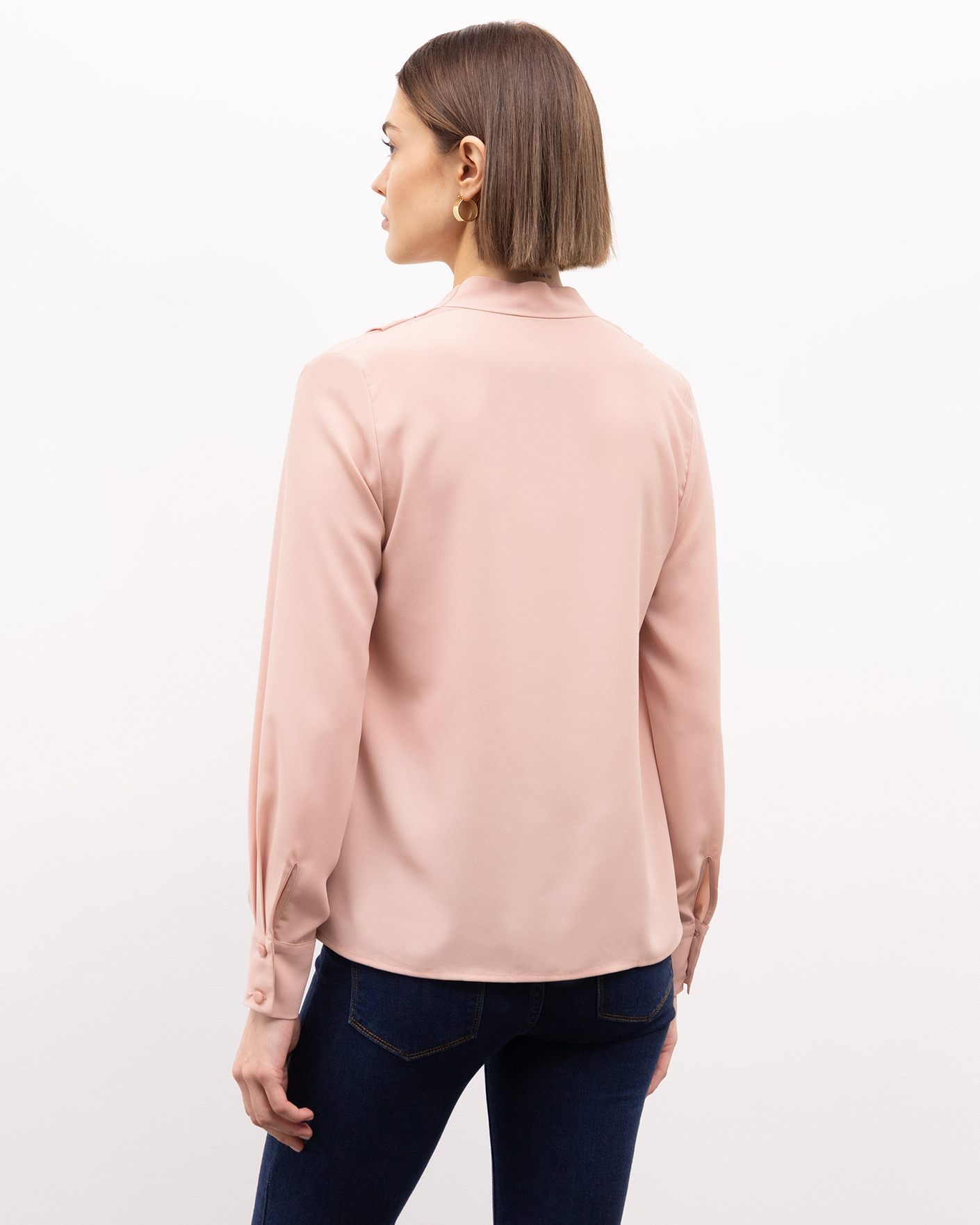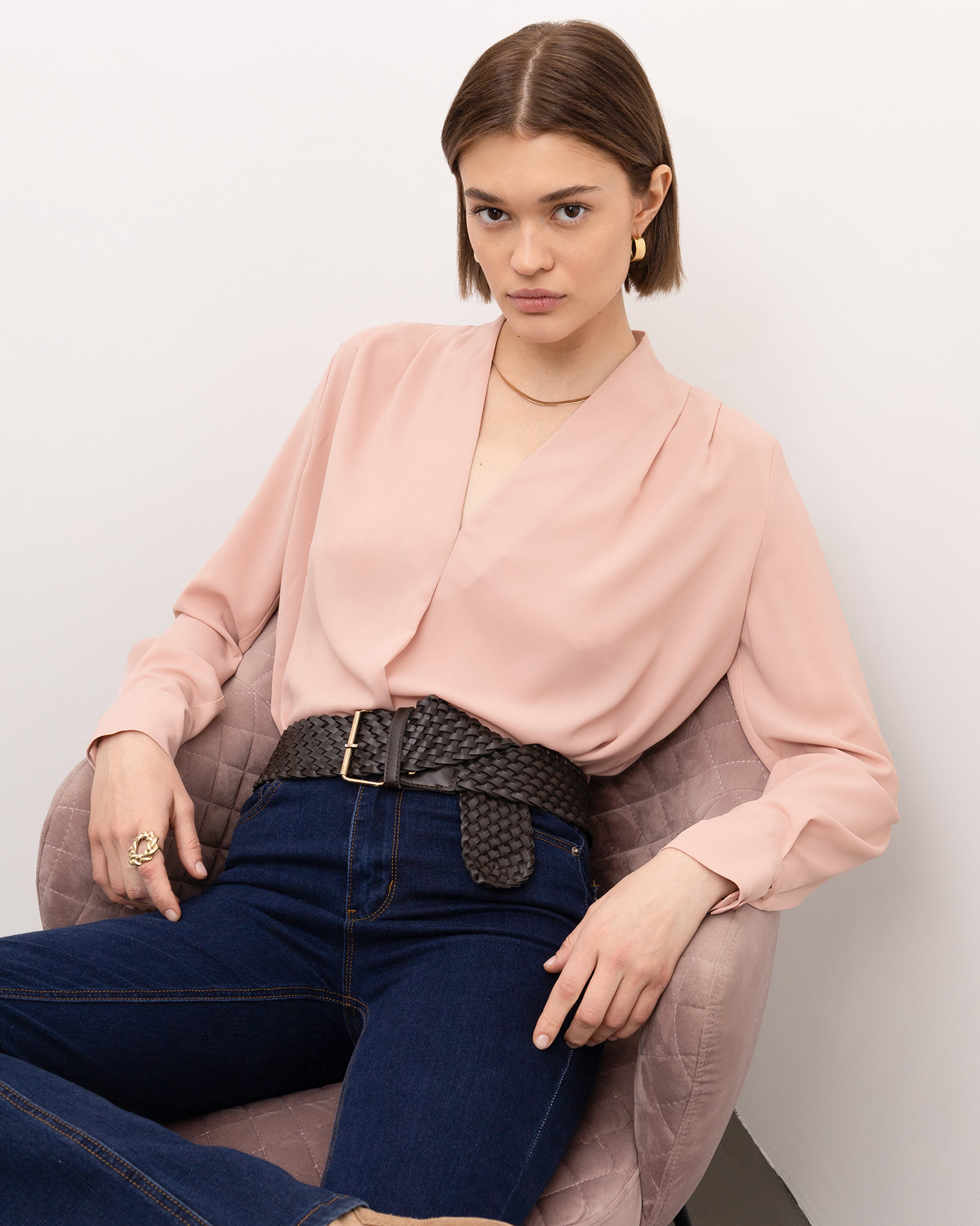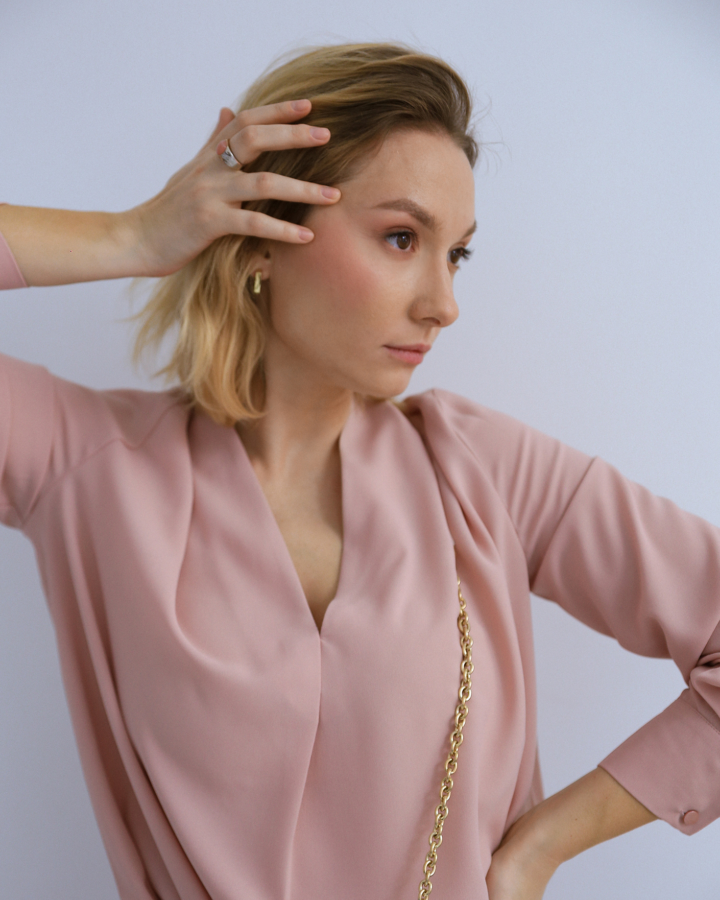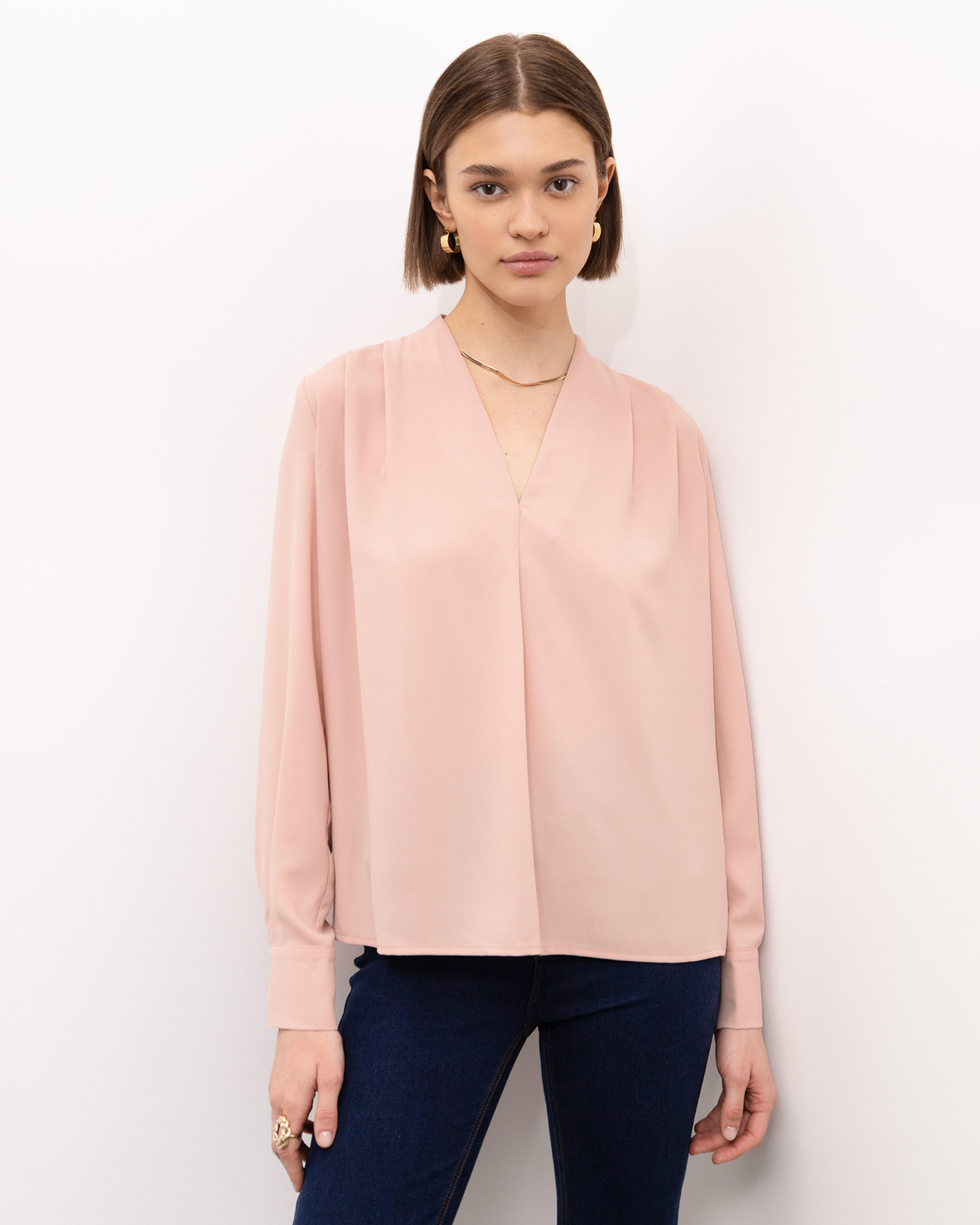 Стильная блуза Emka серо-розового цвета. Свободная модель с глубоким V-образным вырезом со складкой, длинные рукава с манжетами. Блуза станет незаменимой вещью вашего гардероба.