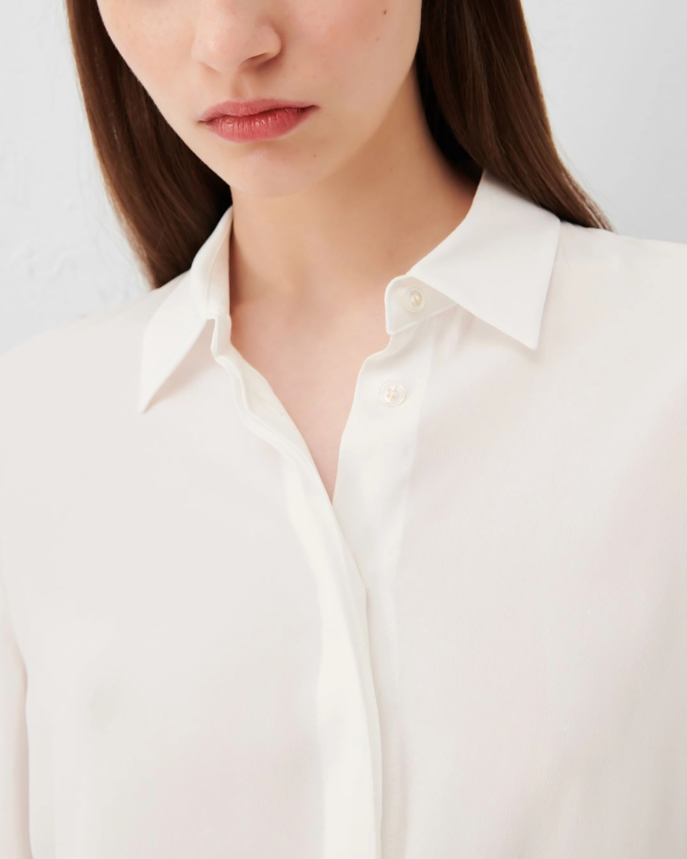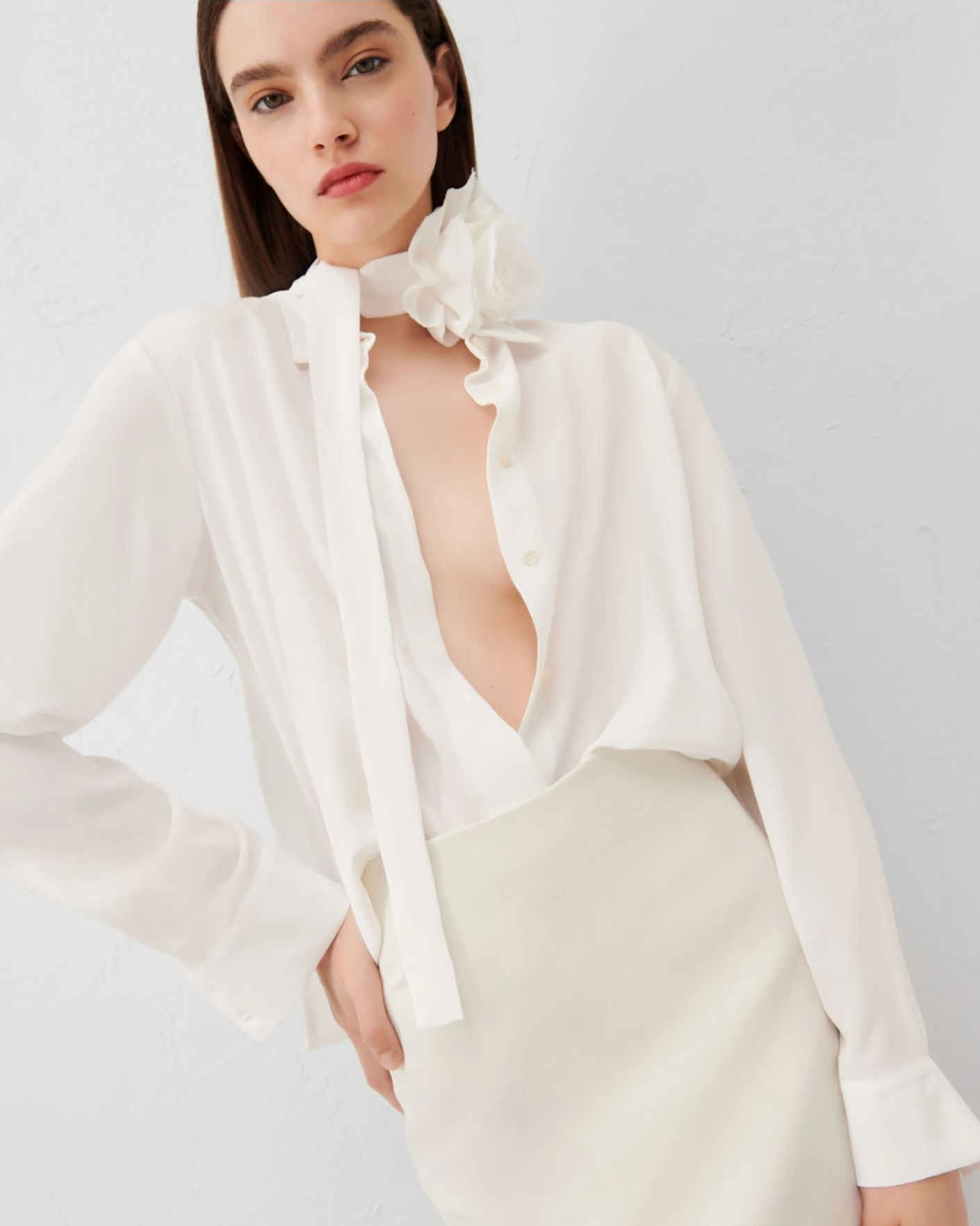 Стильная блуза Marella белого цвета. Модель с отложным воротником и застежкой на скрытые пуговицы. Изюминка изделия - съемная лента с декором в виде цветка. Блуза станет фаворитом вашего гардероба.