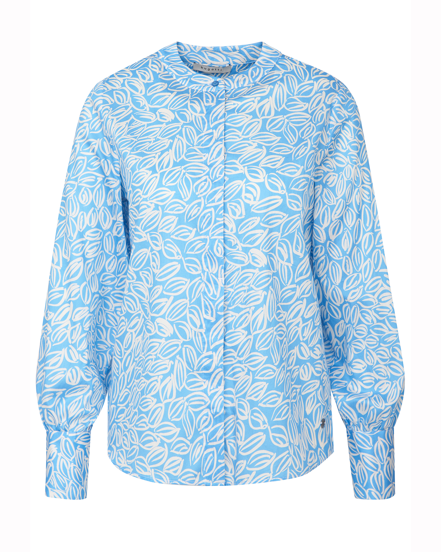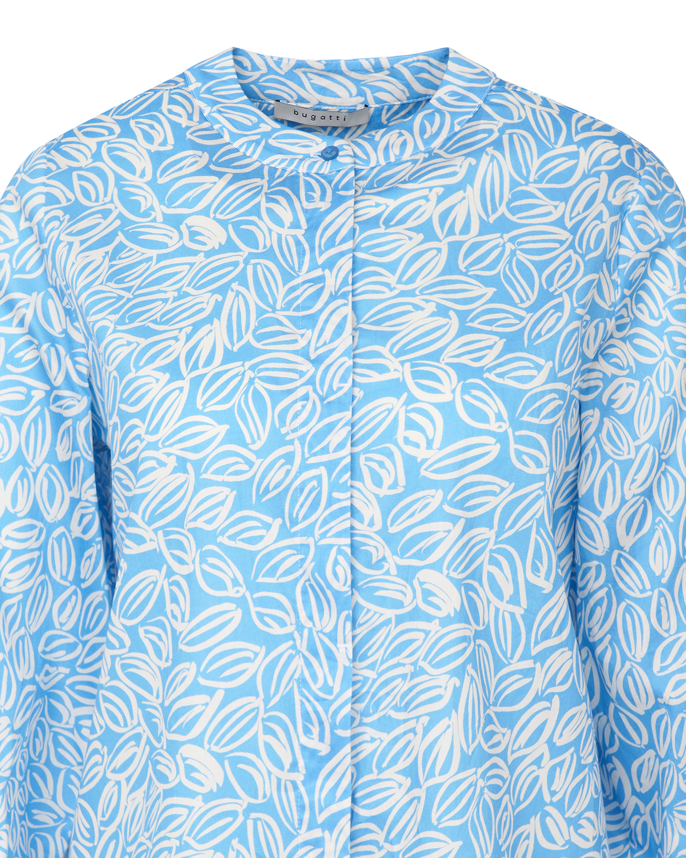 Свободная блуза Bugatti бело-голубого цвета в абстрактный принт. Модель из 100% хлопка с круглым вырезом, застежка на скрытые пуговицы, широкие рукава присборены у высоких манжет. Блузу можно сочетать с жилетом, жакетом, кардиганом, юбкой и брюками.