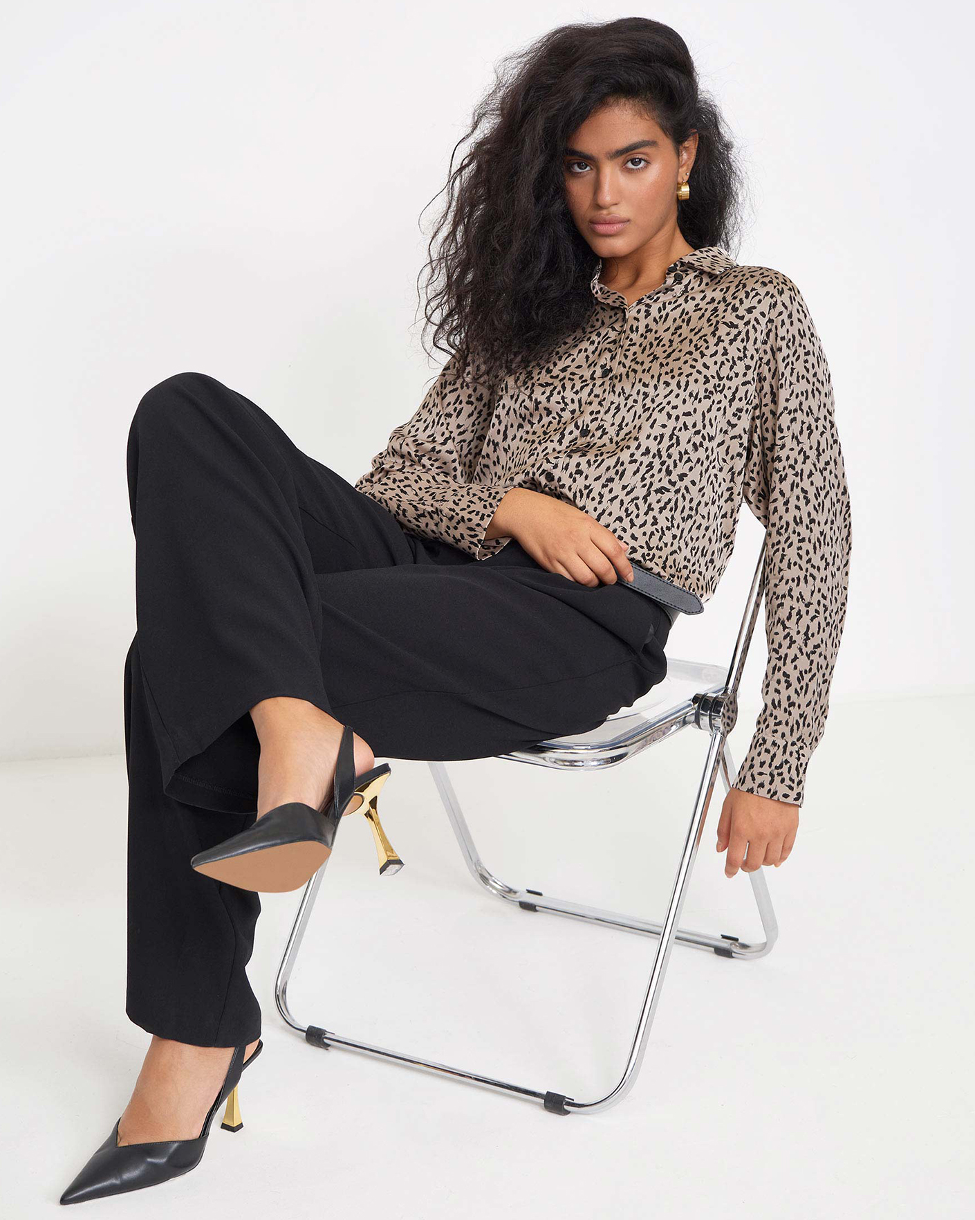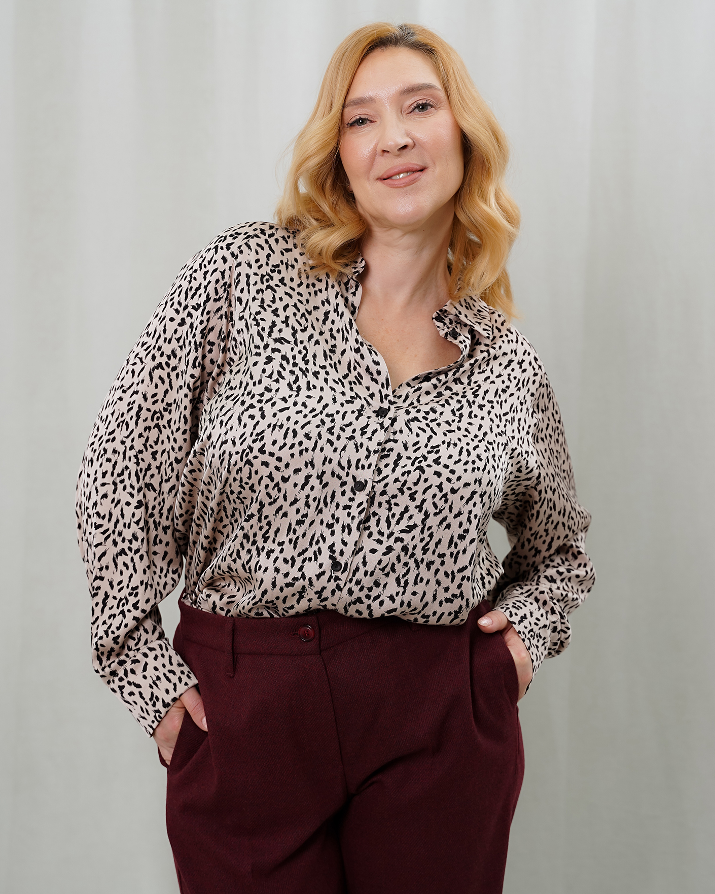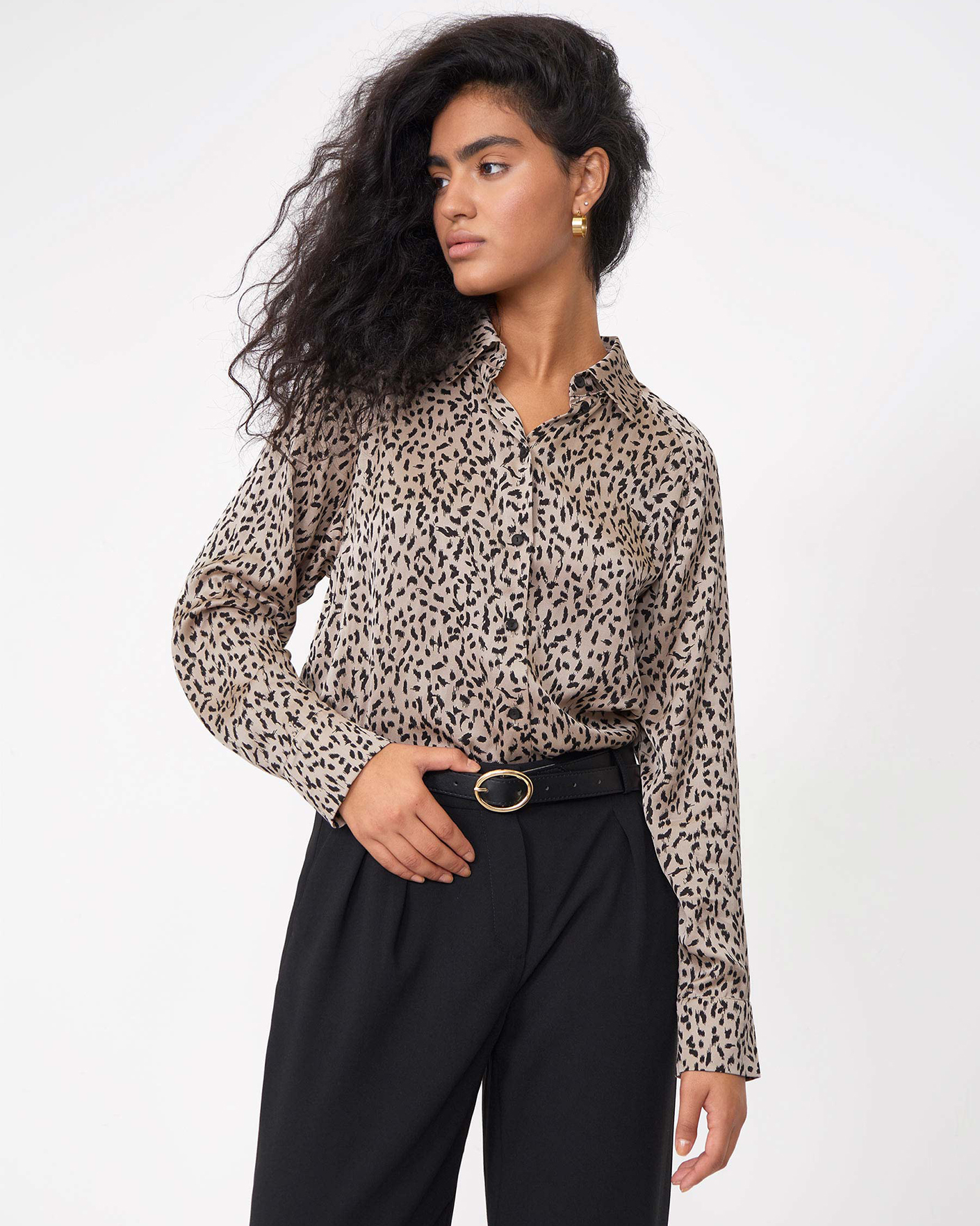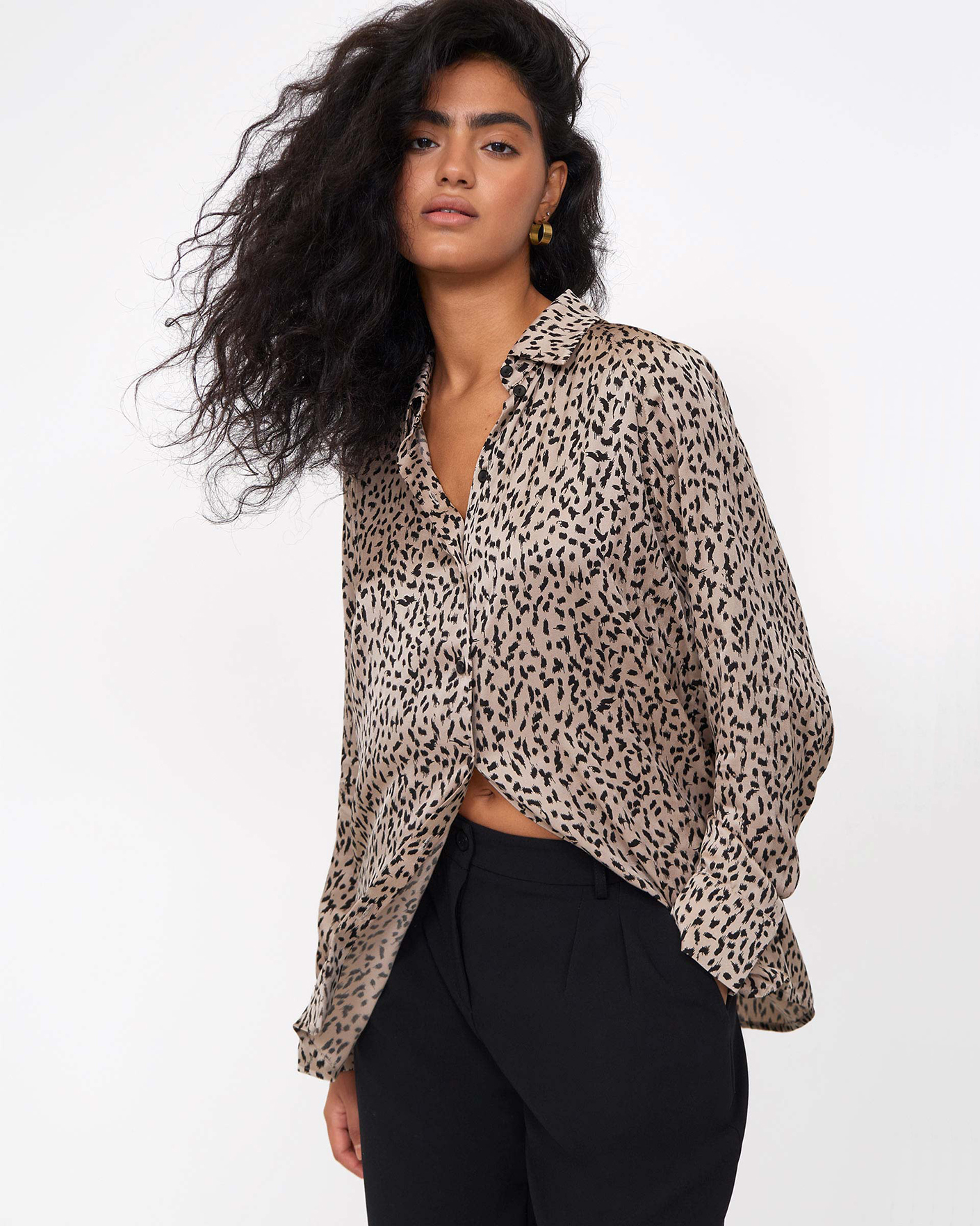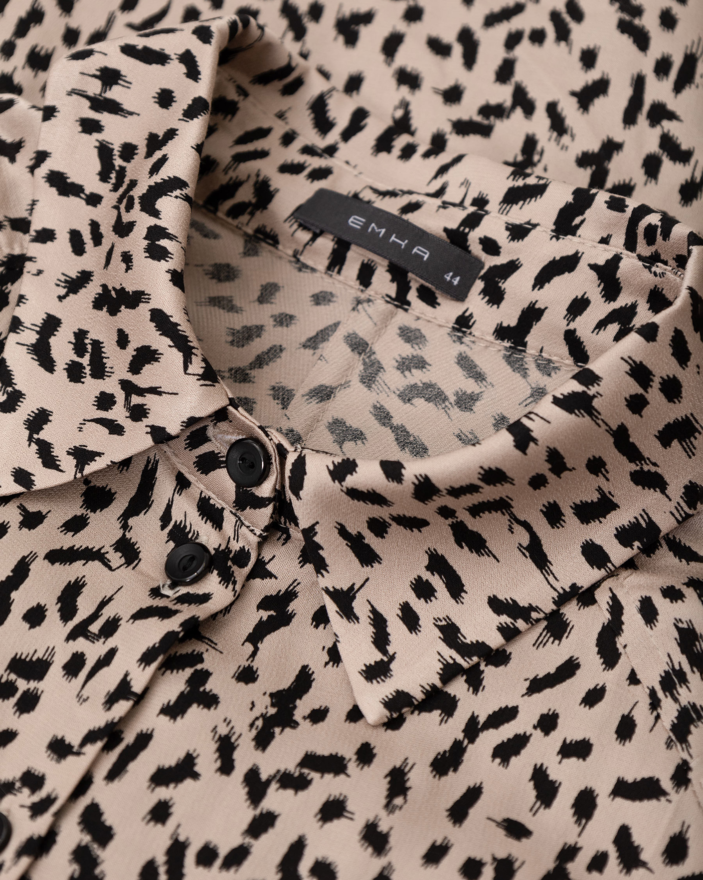 Свободная блуза Emka черно-бежевого цвета в анималистичный рисунок по всему изделию. Модель с отложным воротником и застежкой на пуговицы. Блуза отлично сочетается с жилетом, жакетом, кардиганом, джемпером, юбкой и брюками.