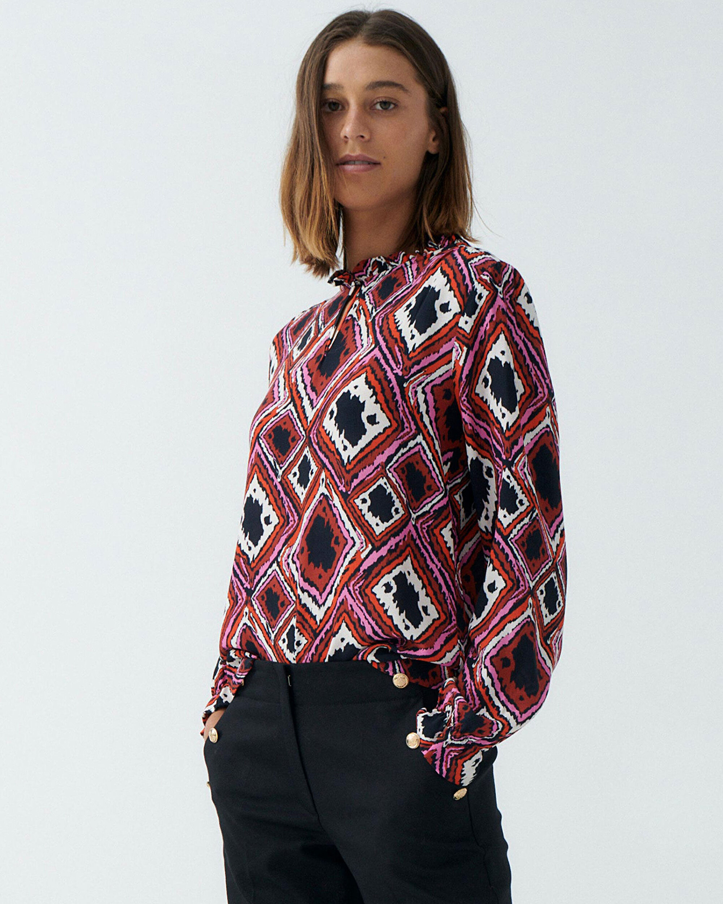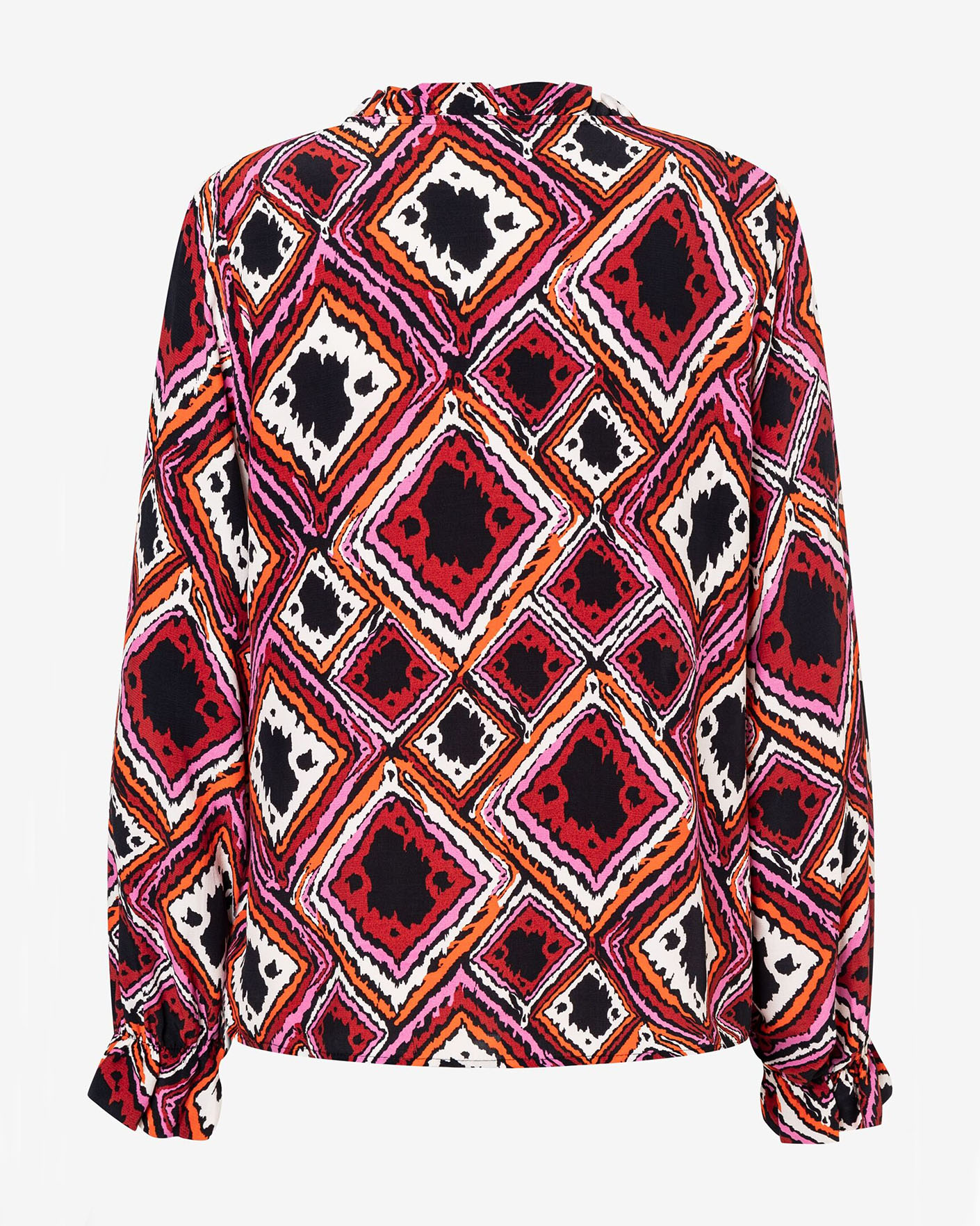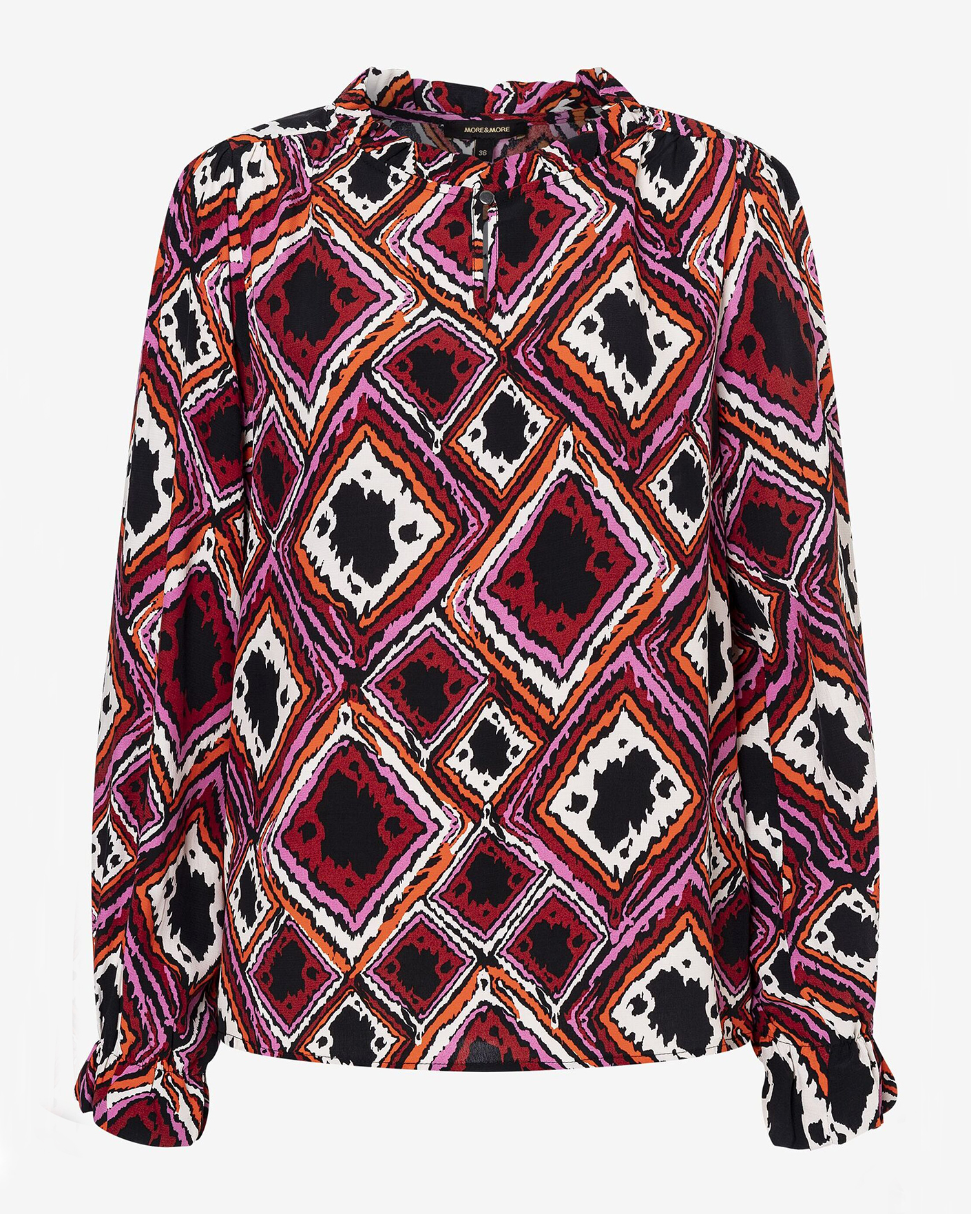 Свободнаяблуза More&More розово-красного цвета с графическим ромбовидным принтом. Круглый вырез горловины с рюшами по краю, длинные рукава с резинкой на концах. Блузу можно сочетать с люыбм гардеробом на каждый день.