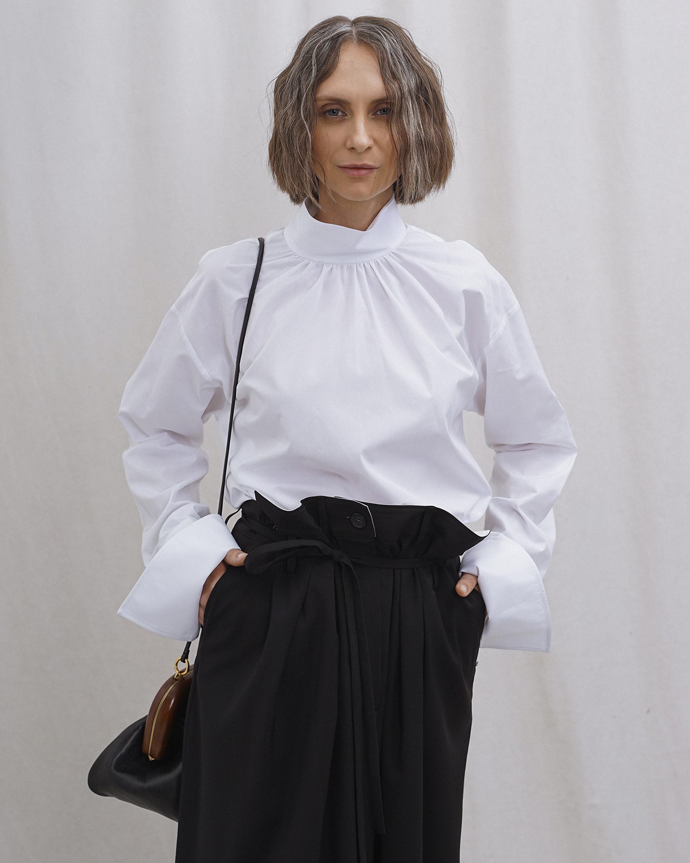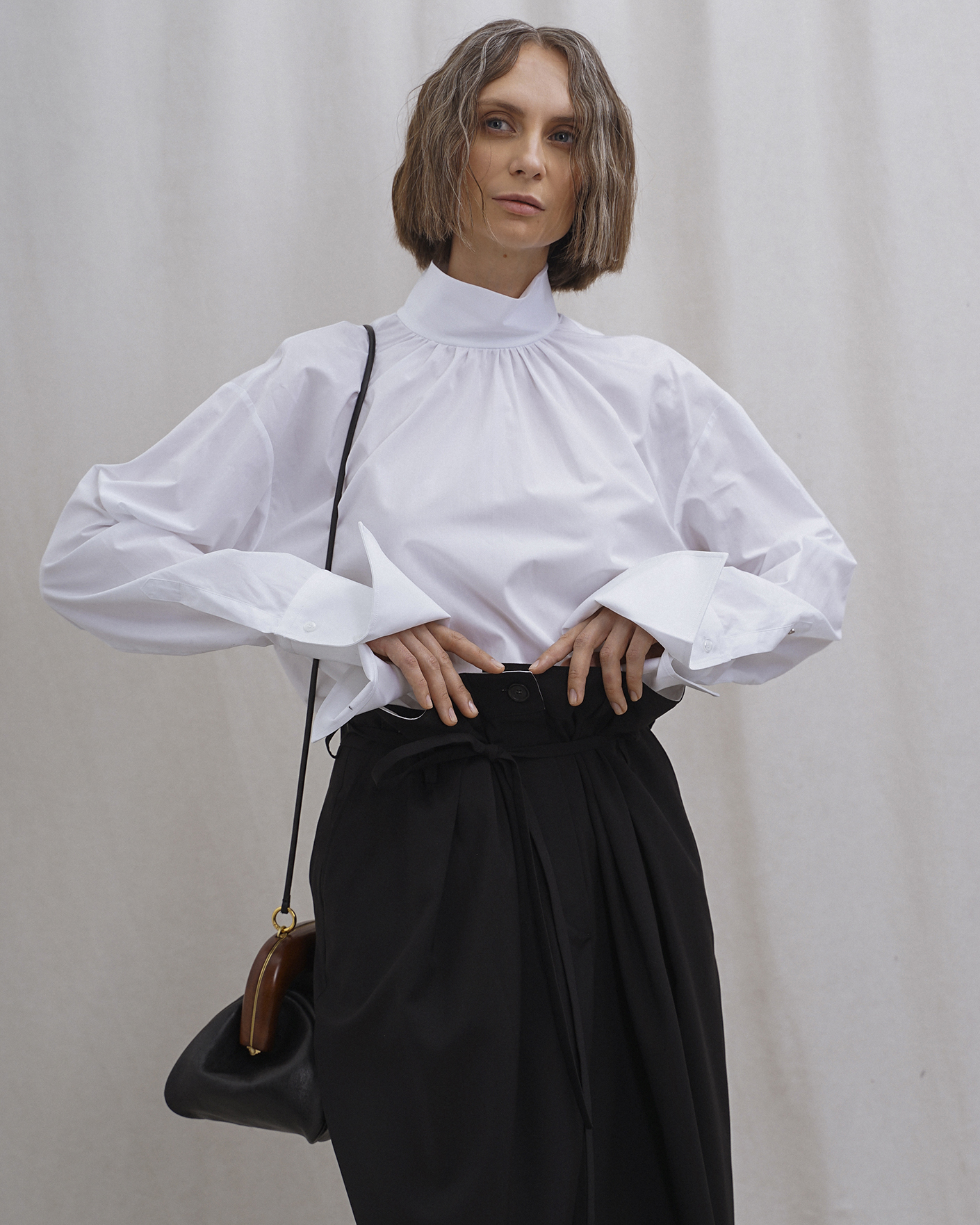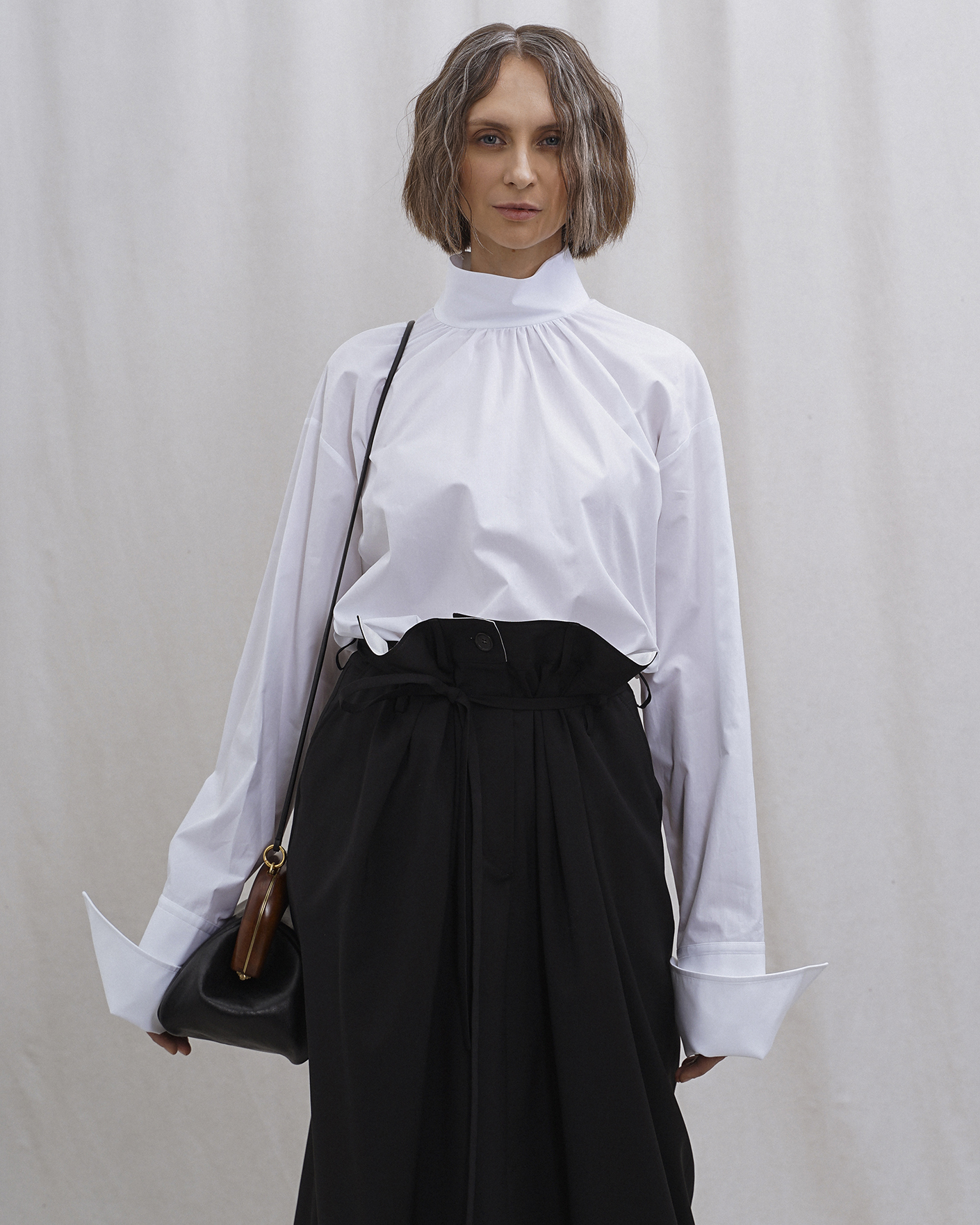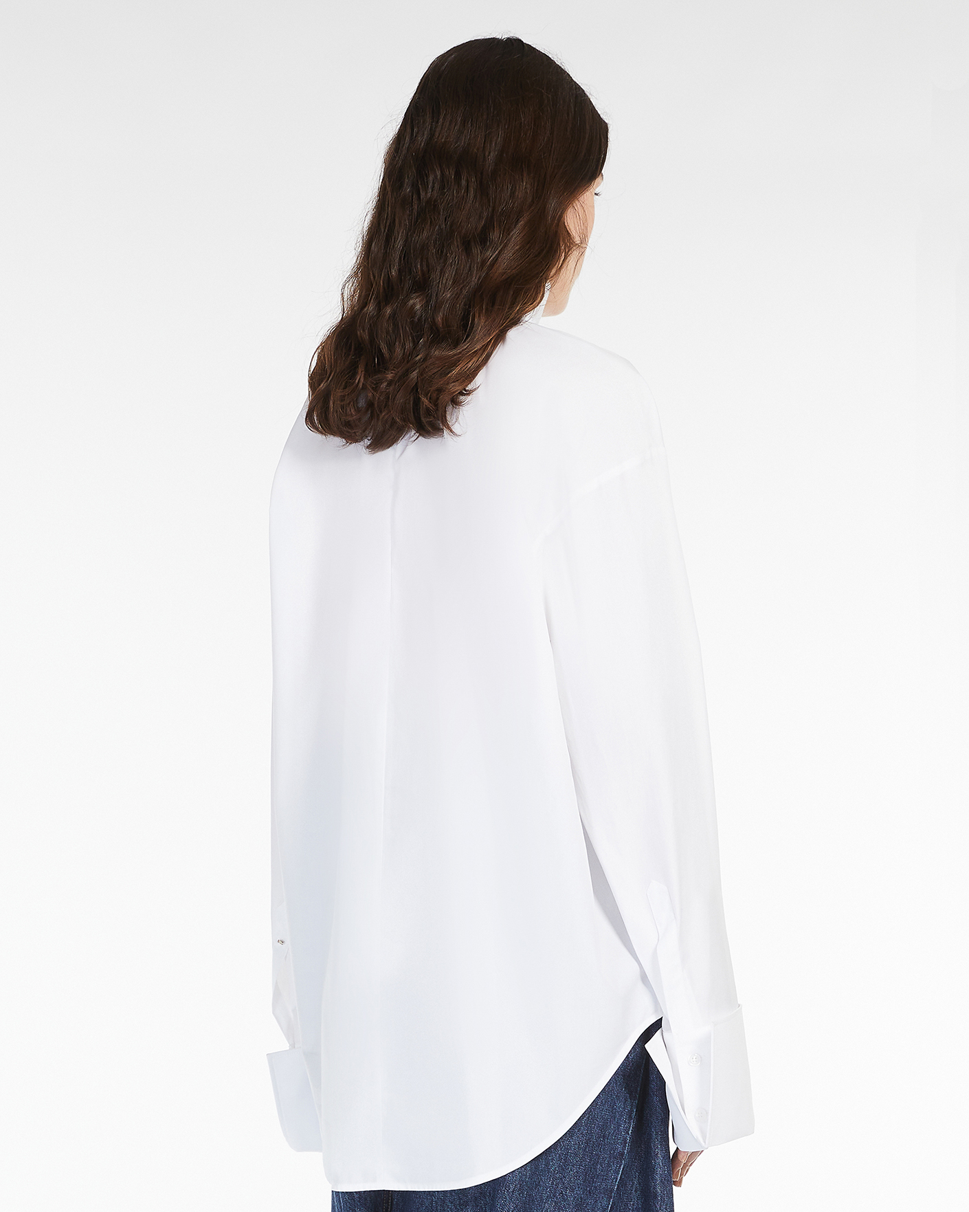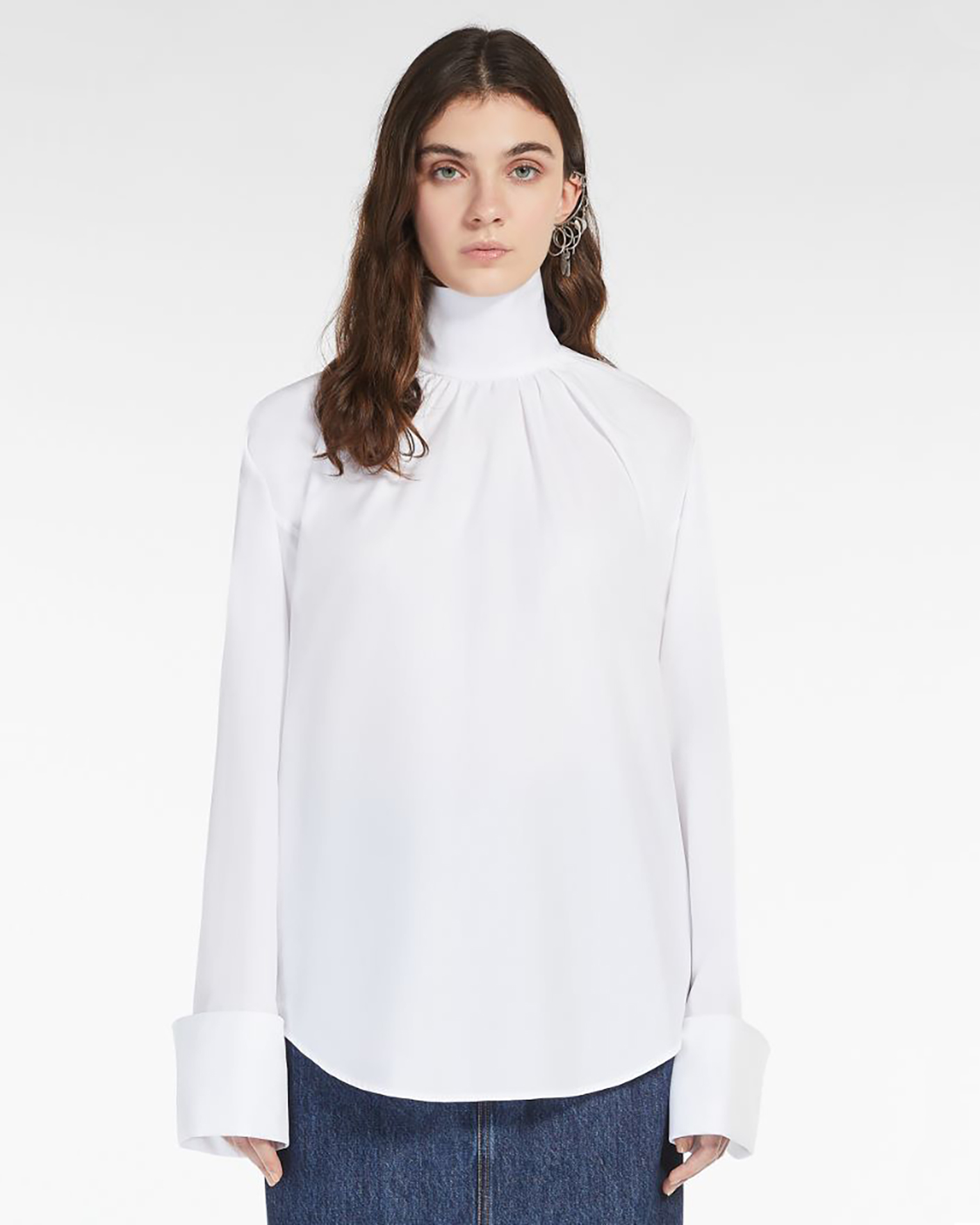 Свободная блуза Sportmax белого цвета выполнена из 100% хлопка. Модель с воротником-стойка с аккуратной сборкой по шву. Широкие манжеты с двумя пуговицами, которые также можно носить подвернутыми, асимметричный закругленный низ, а также удобная посадка благодаря потайной молнии сзади. Блуза отлично впишется в ваш гардероб.