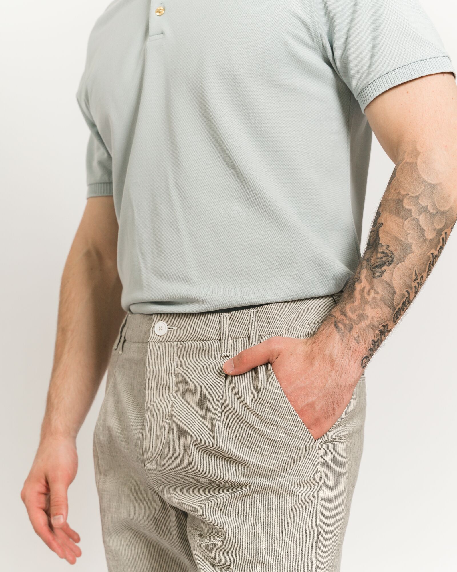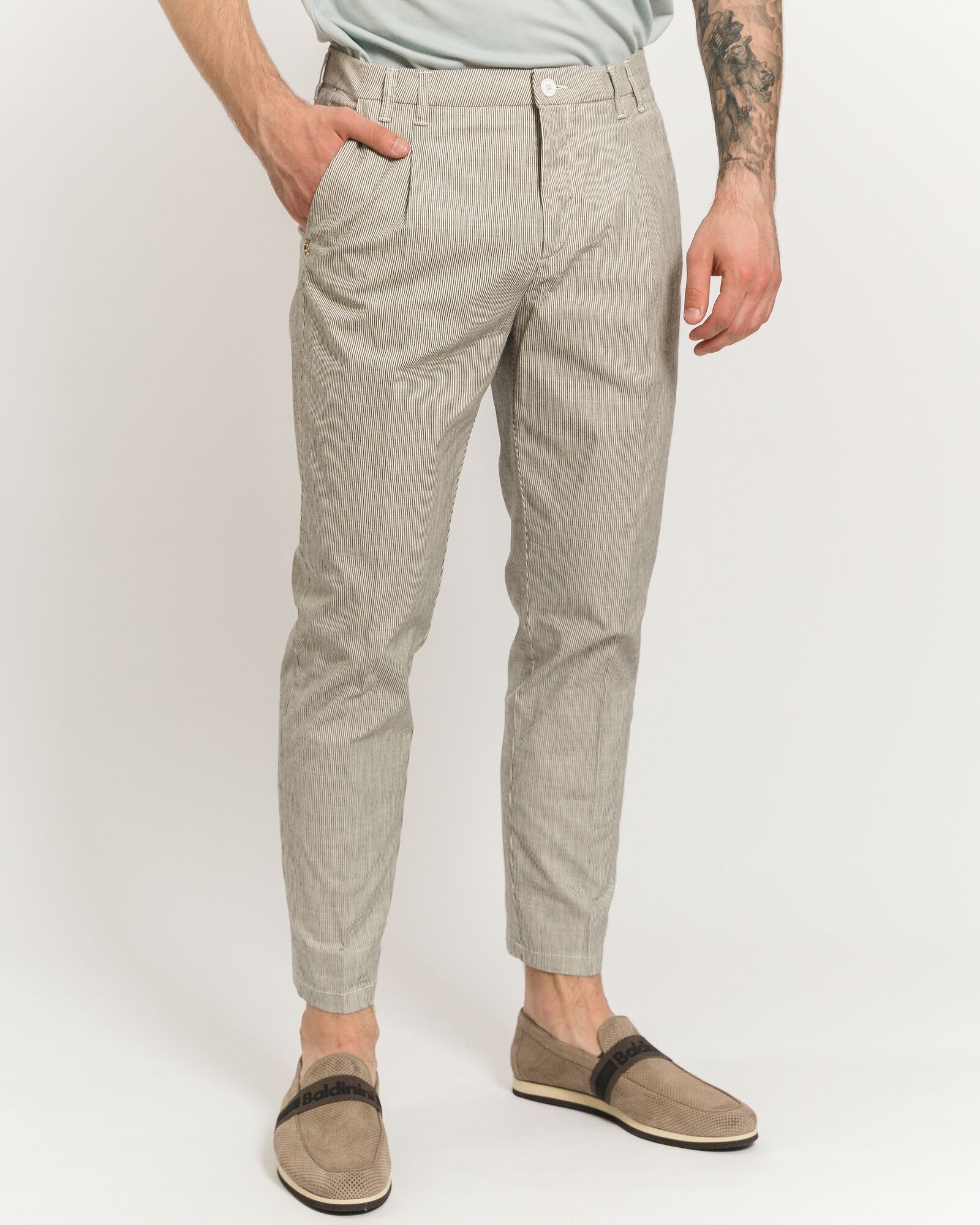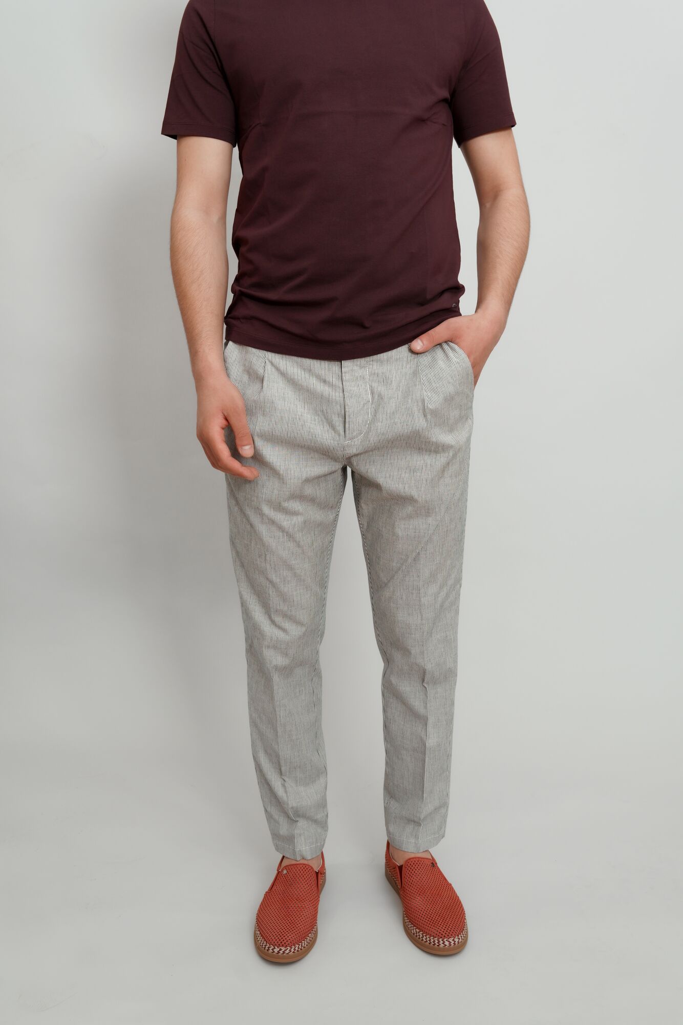 Слаксы бежево-серого оттенка в мелкую вертикальную полосу выполнены из высококачественного хлопка и льна. Укороченная модель на защипах, застежкой на пуговицу и молнию. Слаксы можно сочетать с футболкой, рубашкой и пиджаком в теплых оттенках.