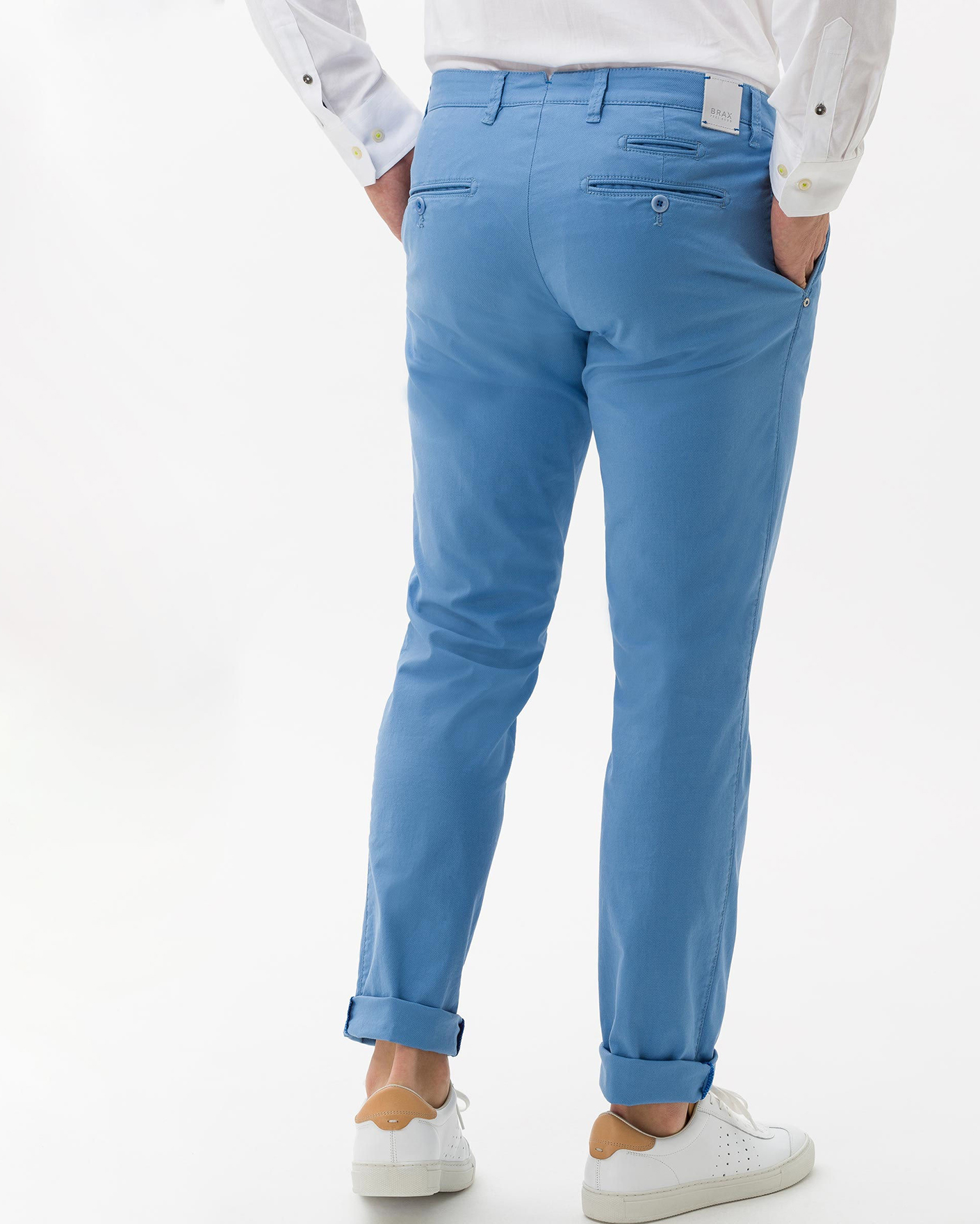 Стильные брюки Brax голубого цвета в мелкий строчный рисунок. Хлопковая модель с врезными диагональными карманами по бокам и сзади. Брюки можно сочетать с футболкой, рубашкой, тонким джемпером, жилетом и кардиганом.