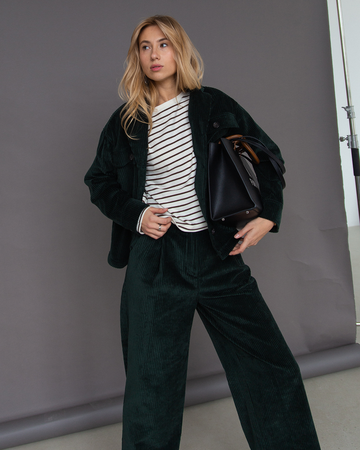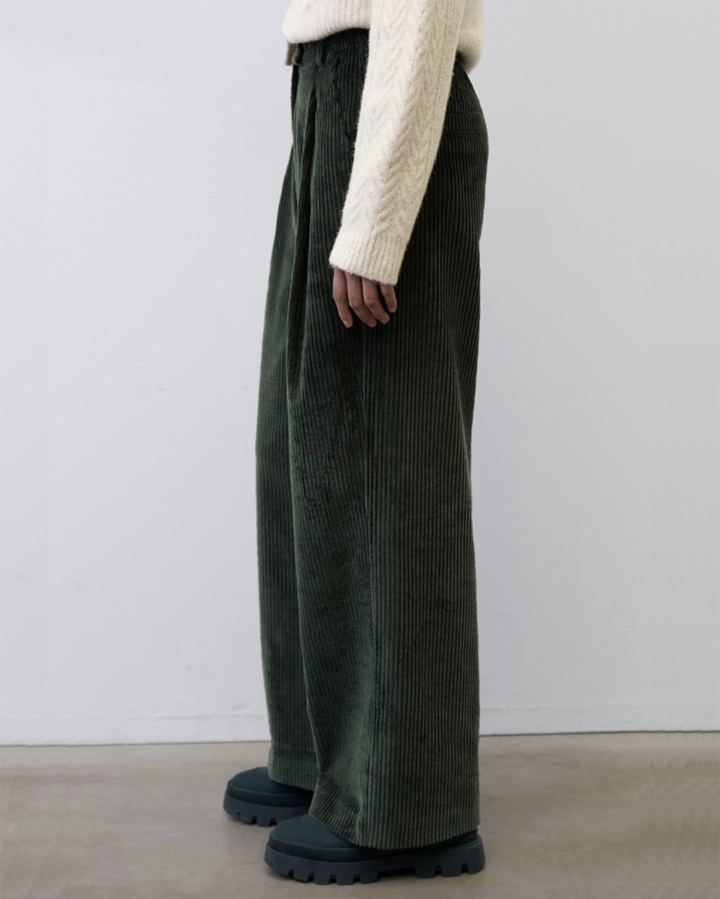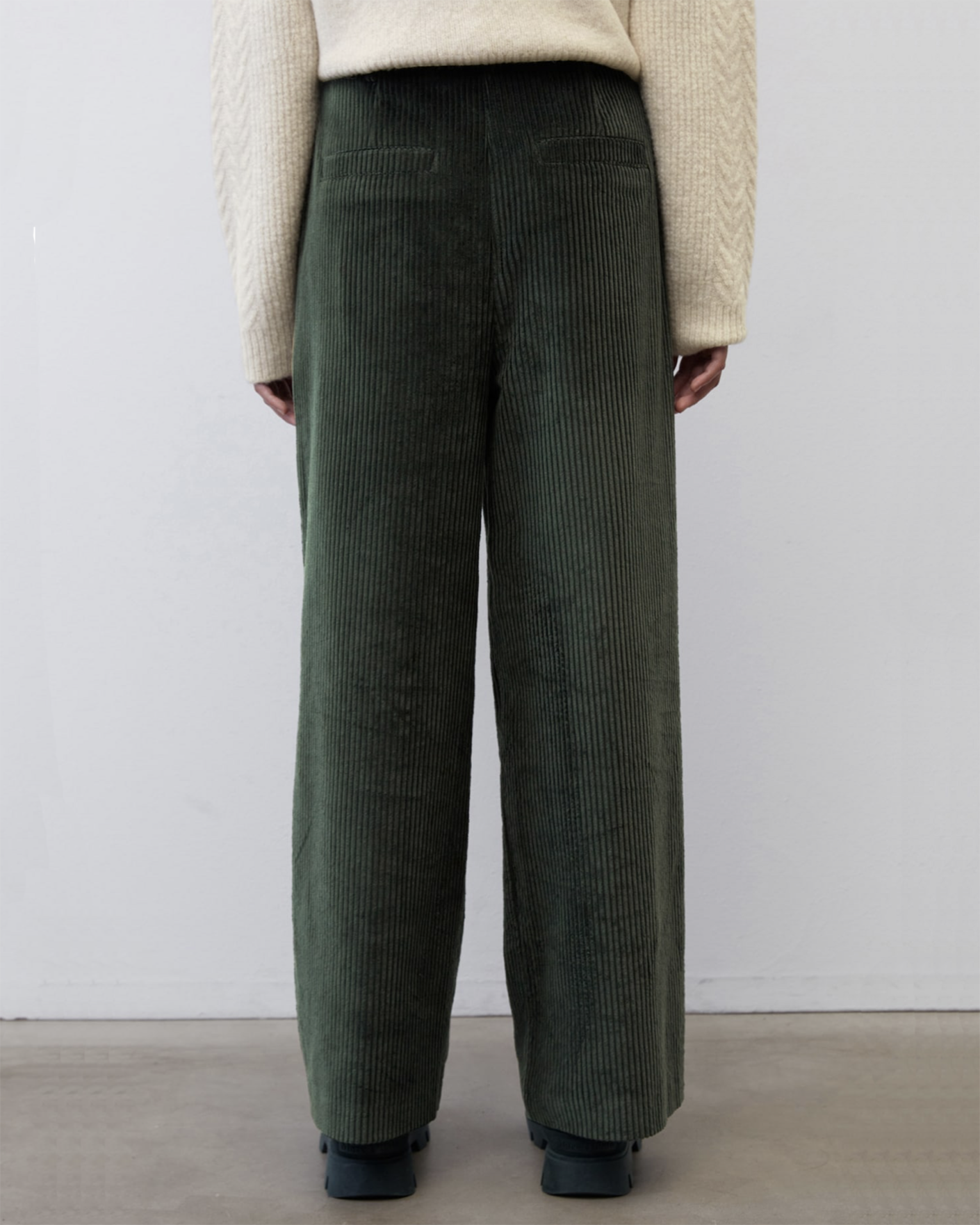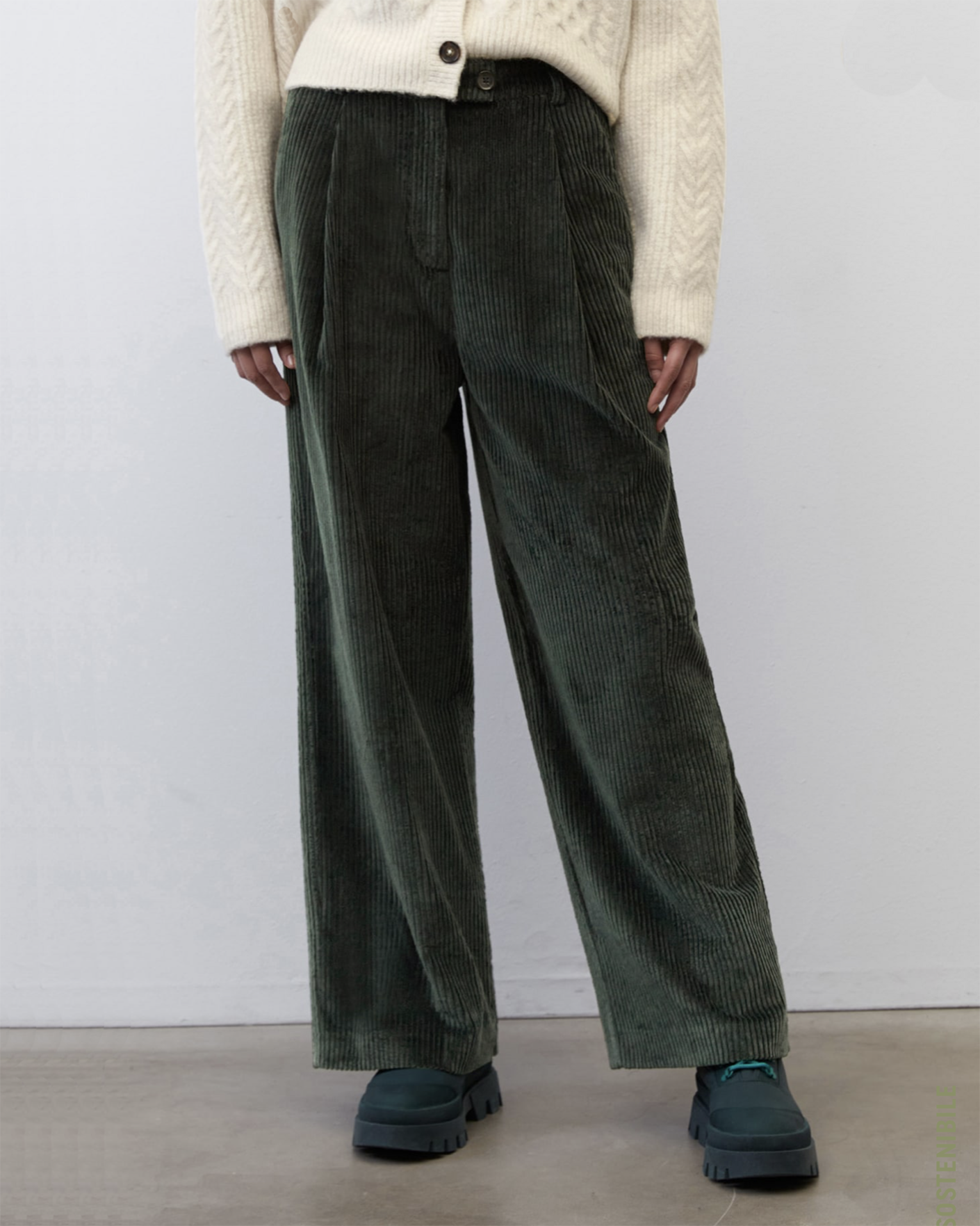 Широкие брюки Marc O'Polo зеленого цвета в узкую вертикальную складку. Бархатная модель с завышенной талией на защипах. Стандартная застежка, врезные карманы по бокам и сзади. Брю отлично впишутся в ваш повседневный гардероб.