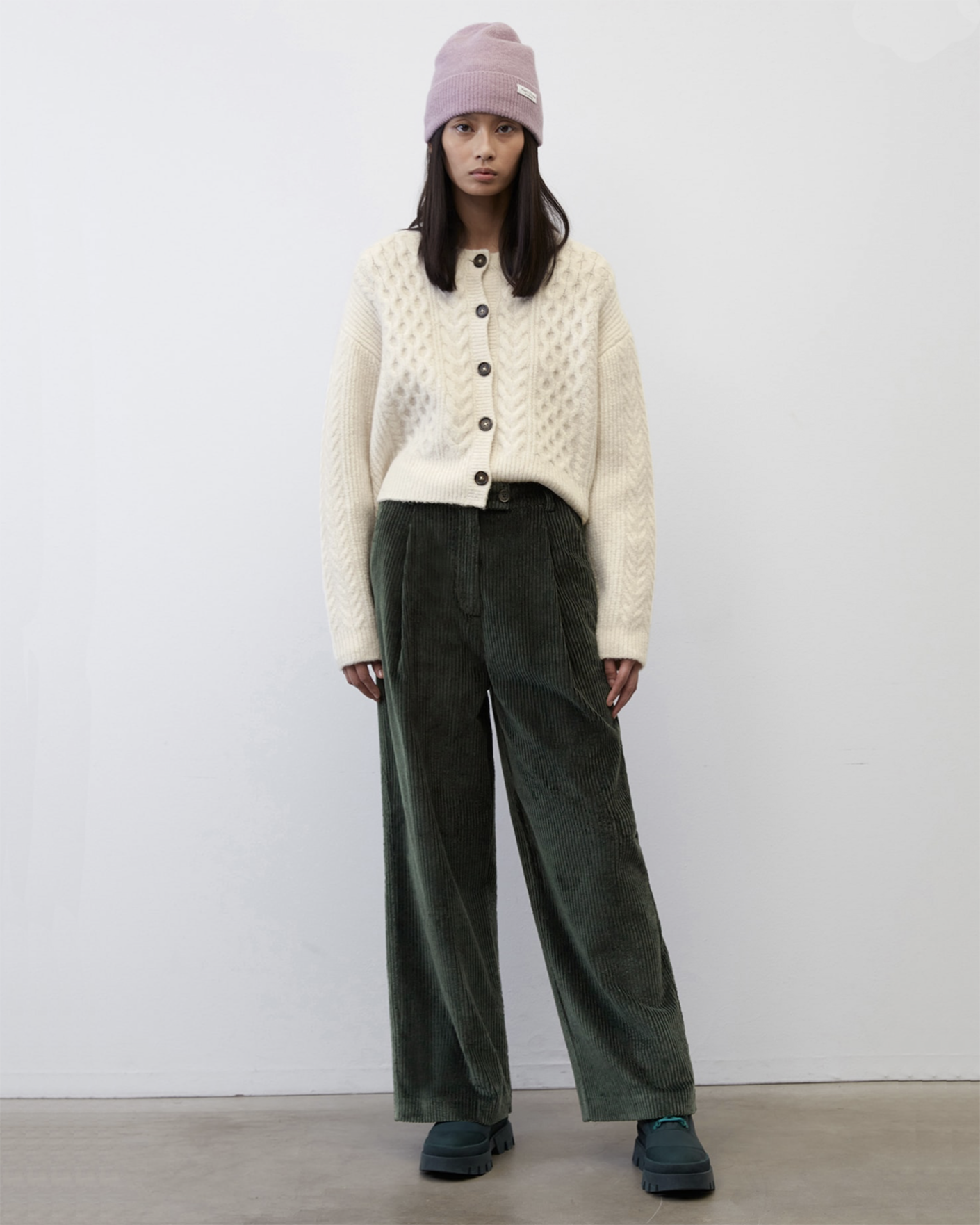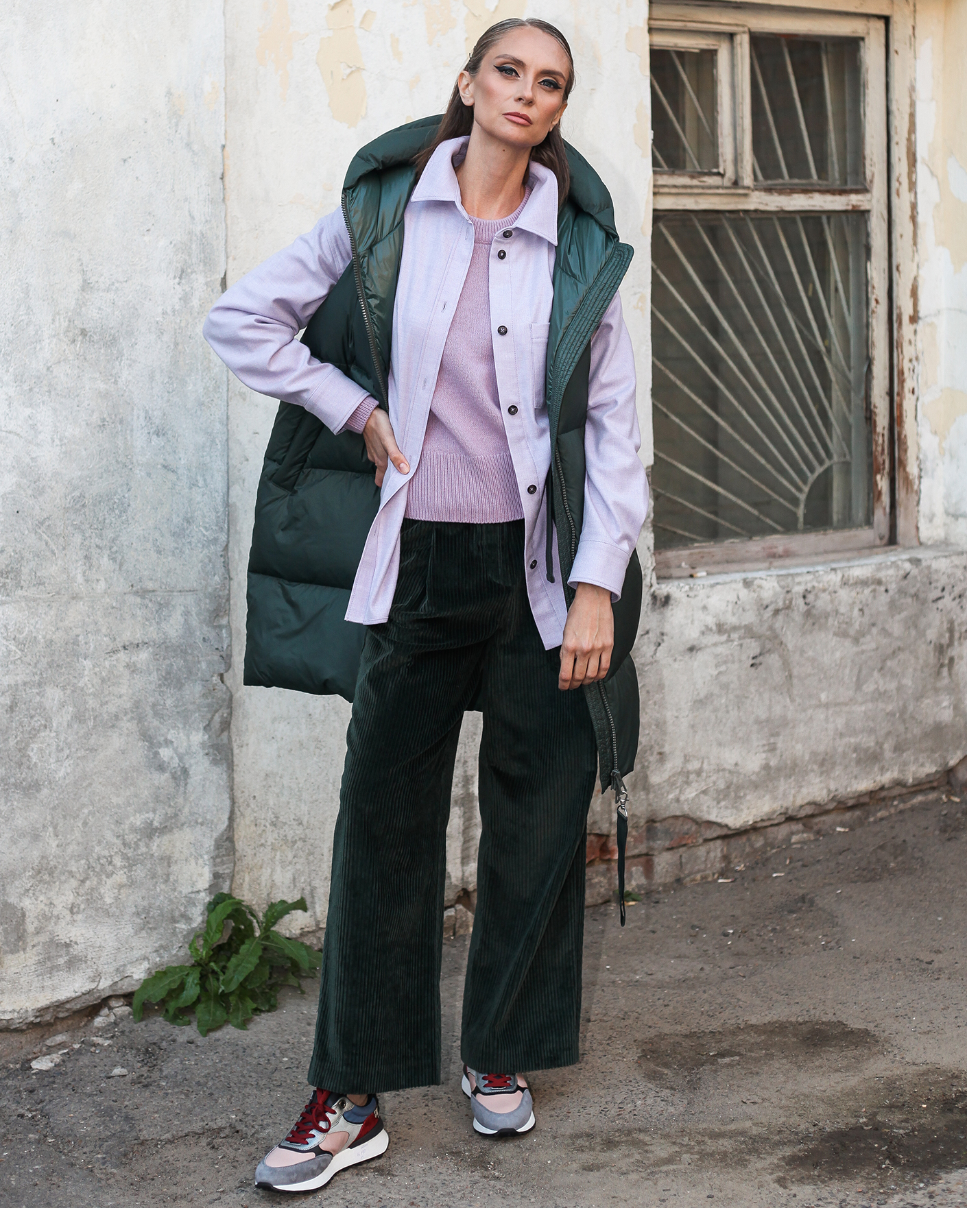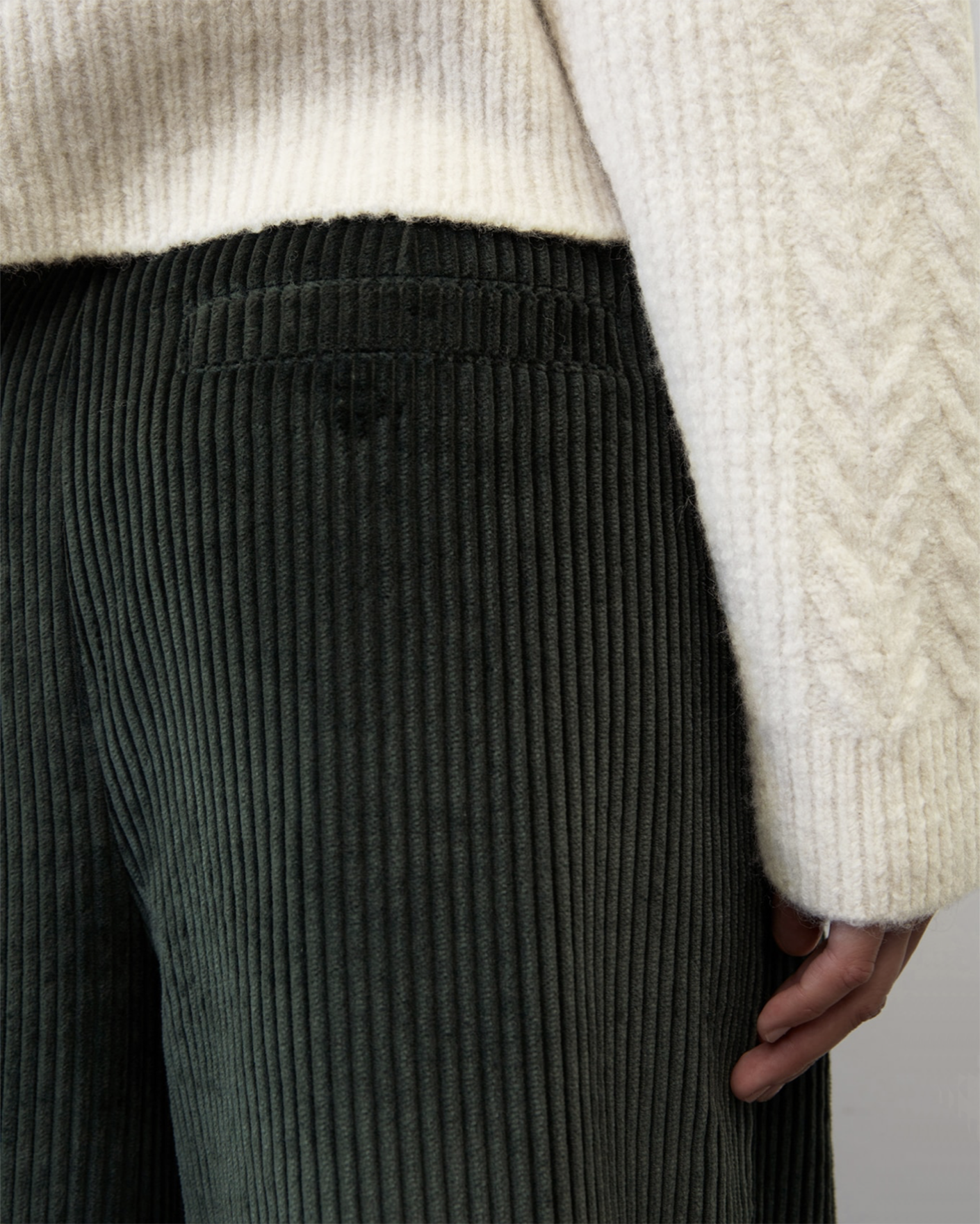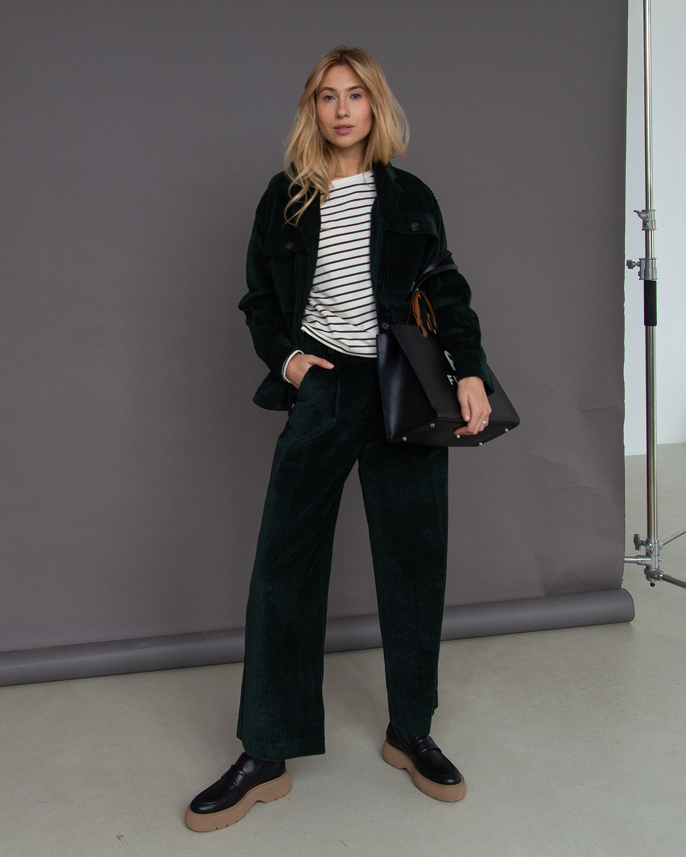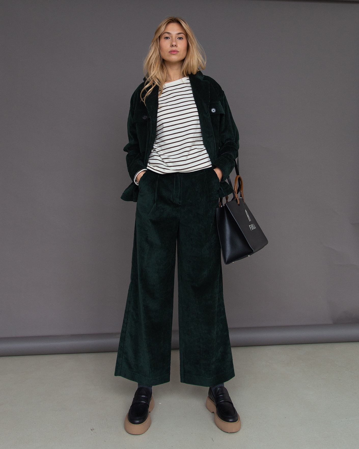 Широкие брюки Marc O'Polo зеленого цвета в узкую вертикальную складку. Бархатная модель с завышенной талией на защипах. Стандартная застежка, врезные карманы по бокам и сзади. Брю отлично впишутся в ваш повседневный гардероб.