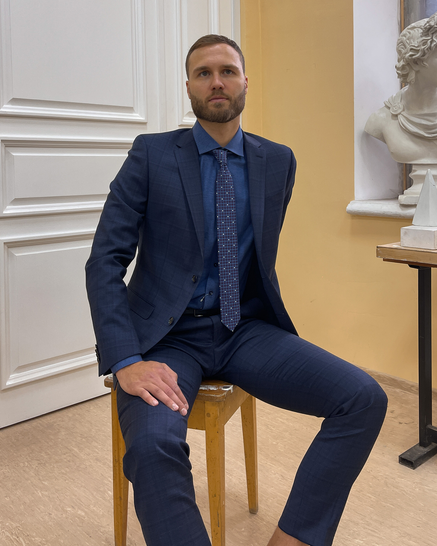 Зауженные брюки Digel фиолетово-синего цвета в оптическую клетку. Шерстяная модель с идеальной и комфортной посадкой. Брюки можно сочетать с рубашкой, водолазкой, джемпером и пиджаком.