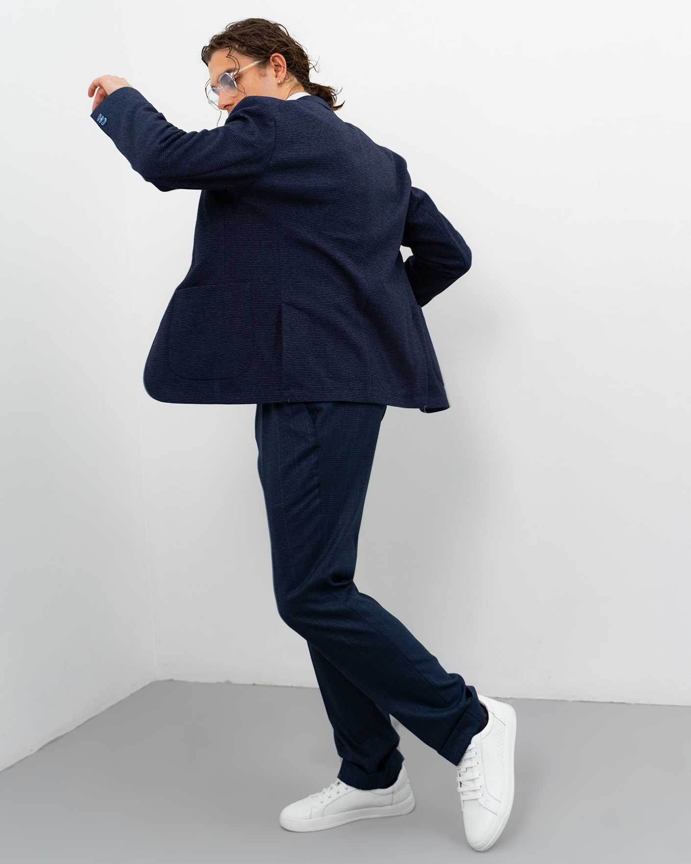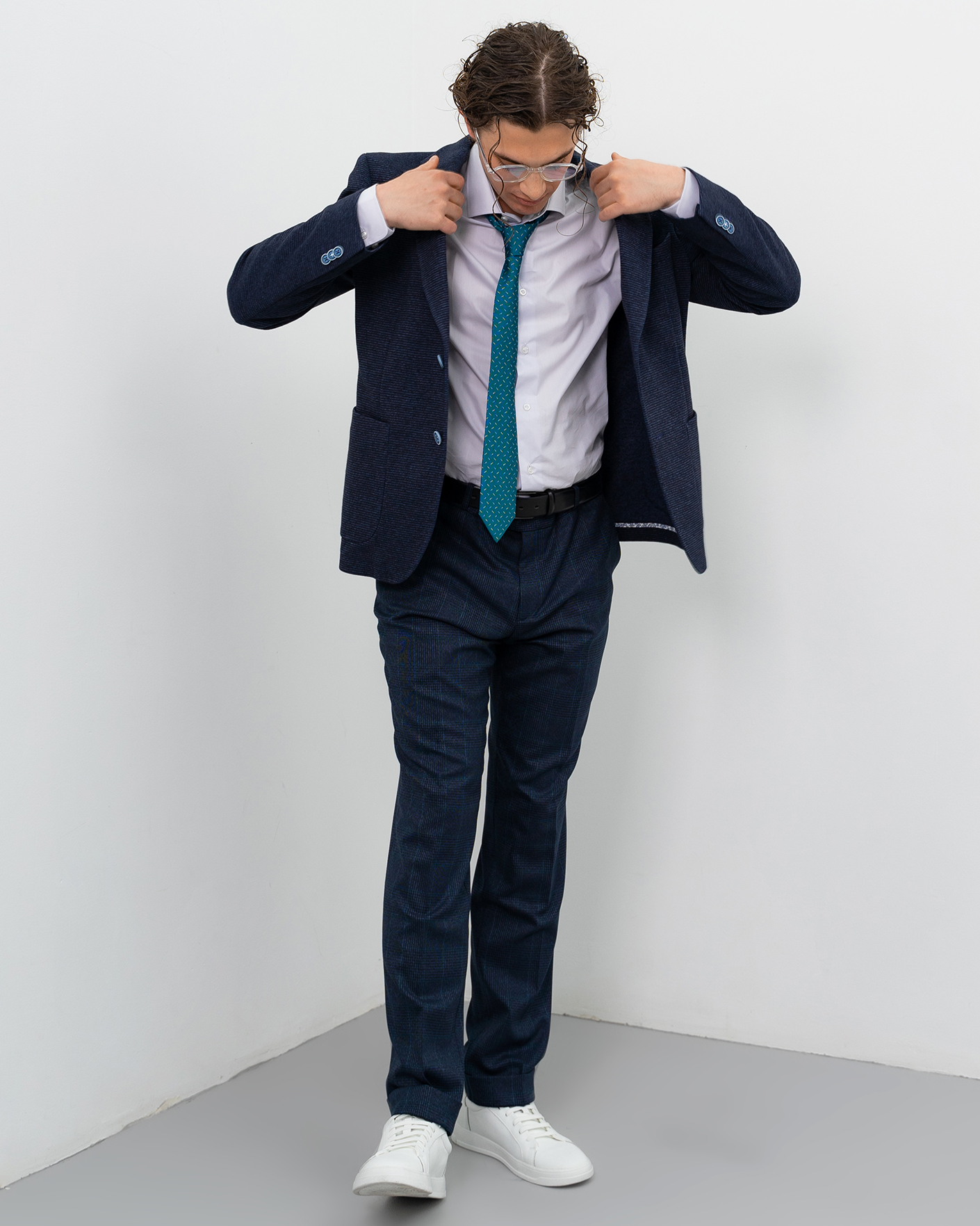 Брюки Truvor серо-синего цвета в мелкий рисунок. Модель со стрелками, стандартная застежка, врезные карманы по бокам и сзади. Брюки можно сочетать с любым гардеробом.