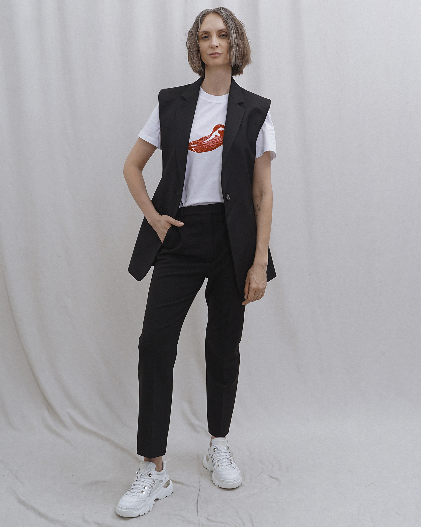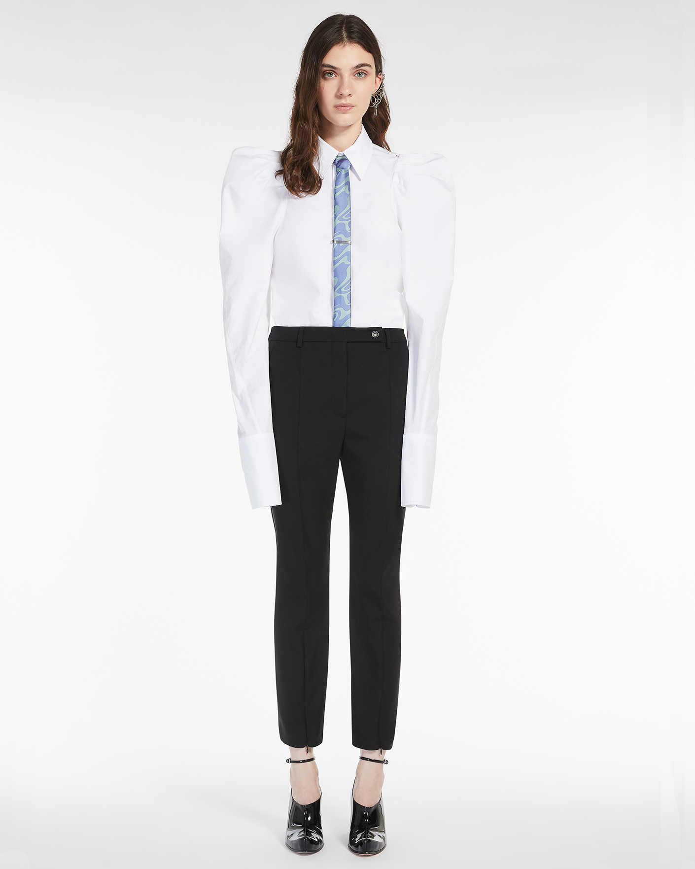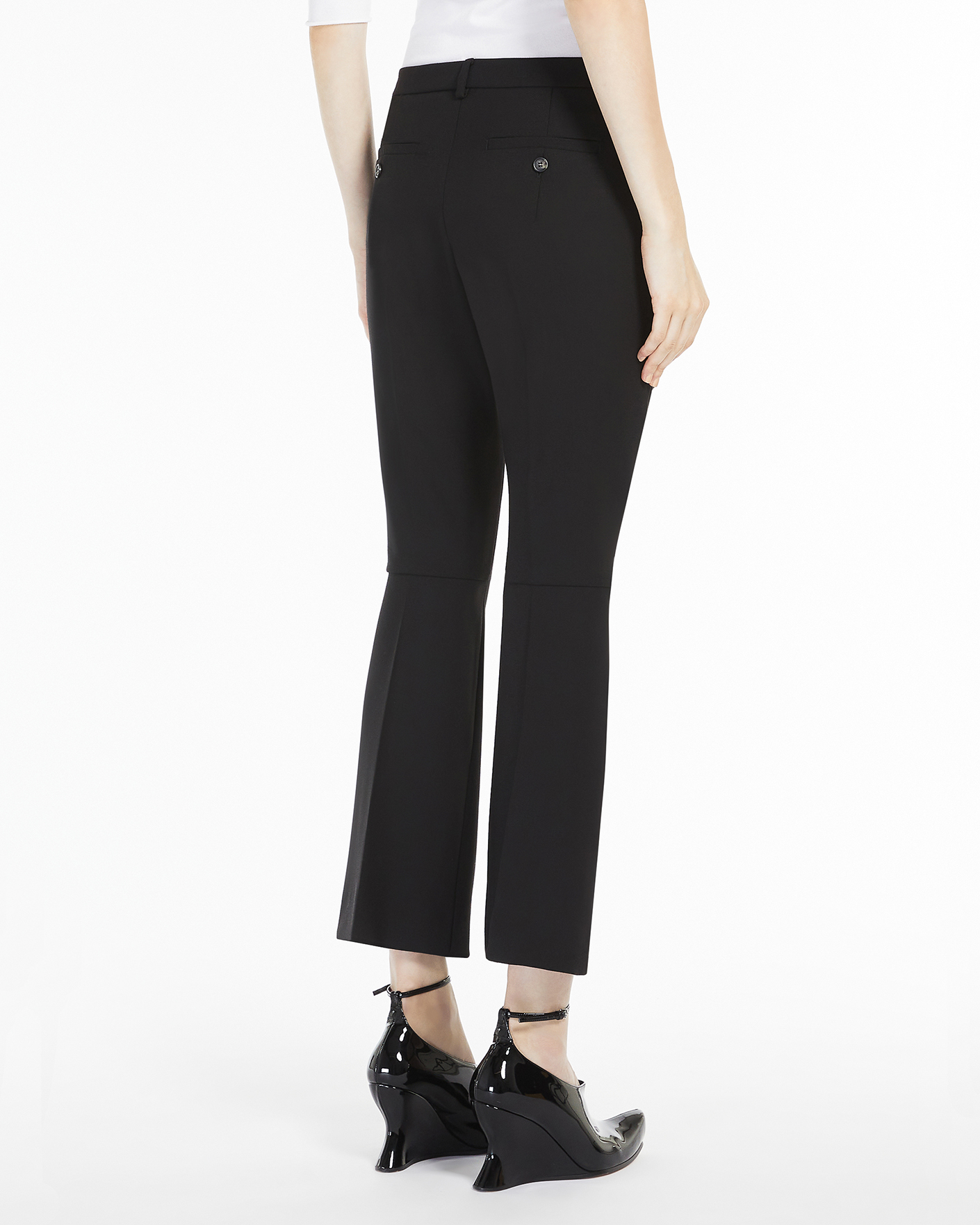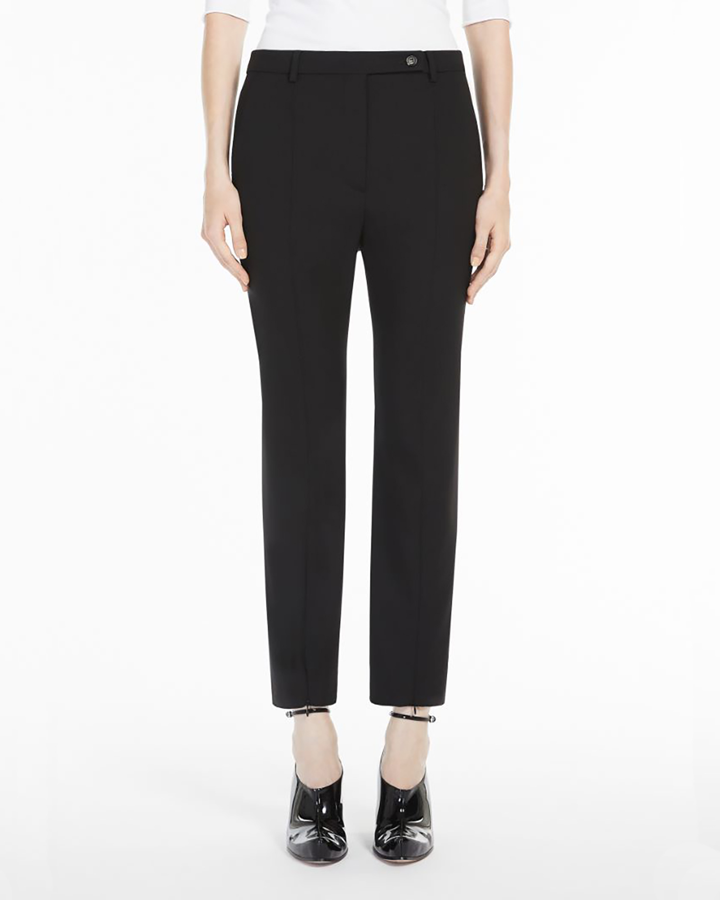 Зауженные брюки Sportmax черного цвета выполненны из 100% шерсти. Модель со слегка заниженной посадкой на стандартной застежке. Задний шов на высоте колена создает небольшой расклешенный край. Длина по щиколотку c разрезом на молнии по центру. Имеются врезные карманы по бокам и сзади на пуговице. Брюки можно сочетать с любым гардеробом.