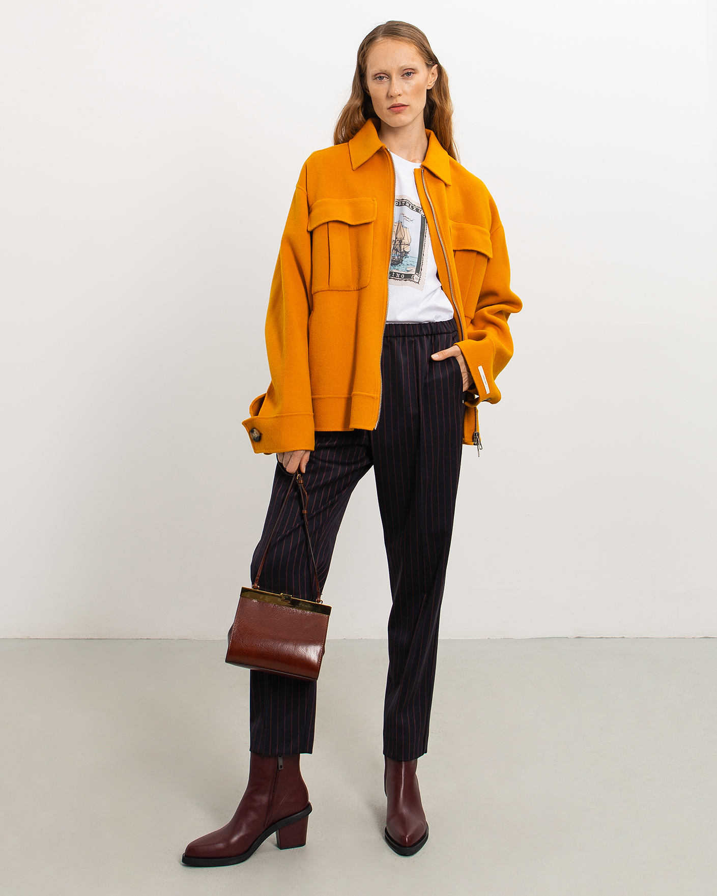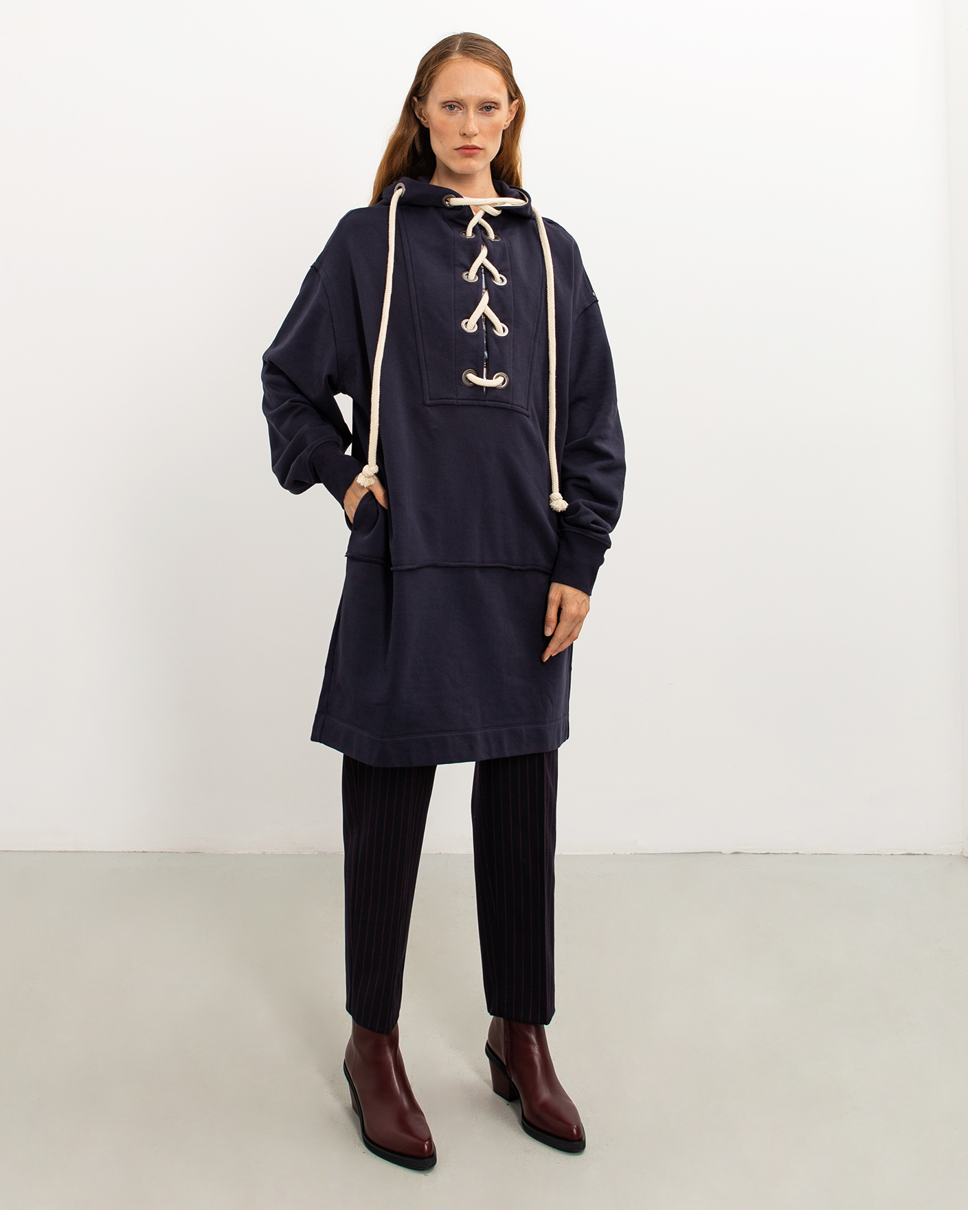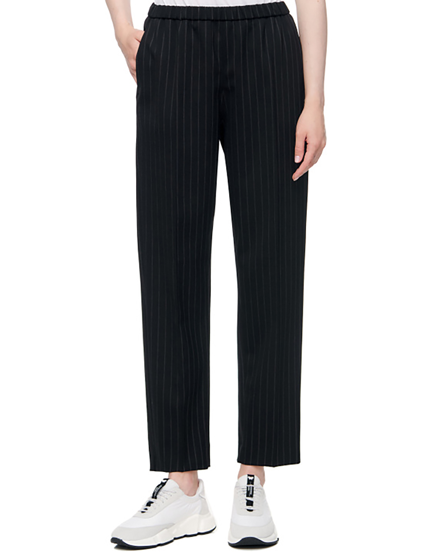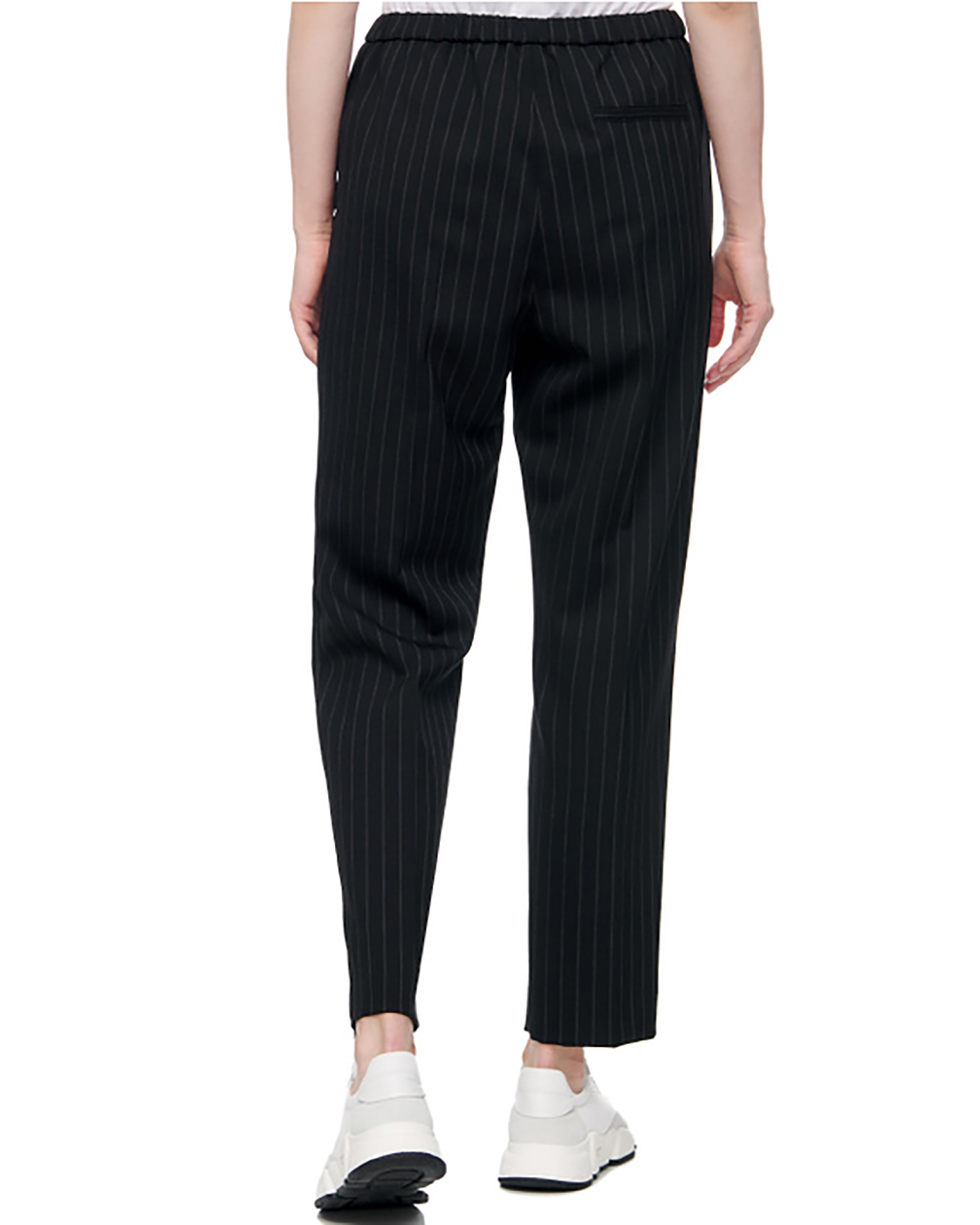 Слегка зауженные брюки-джоггеры Sportmax темно-синего цвета в узкую вертикальную полосу красного цвета. Шерстяная модель с поясом на резинке в складку, что обеспечивает идеалльную посадку. Имеются врезные карманы по бокам и одинсзади. Джоггеры отлично впишутся в ваш деловой гардероб.