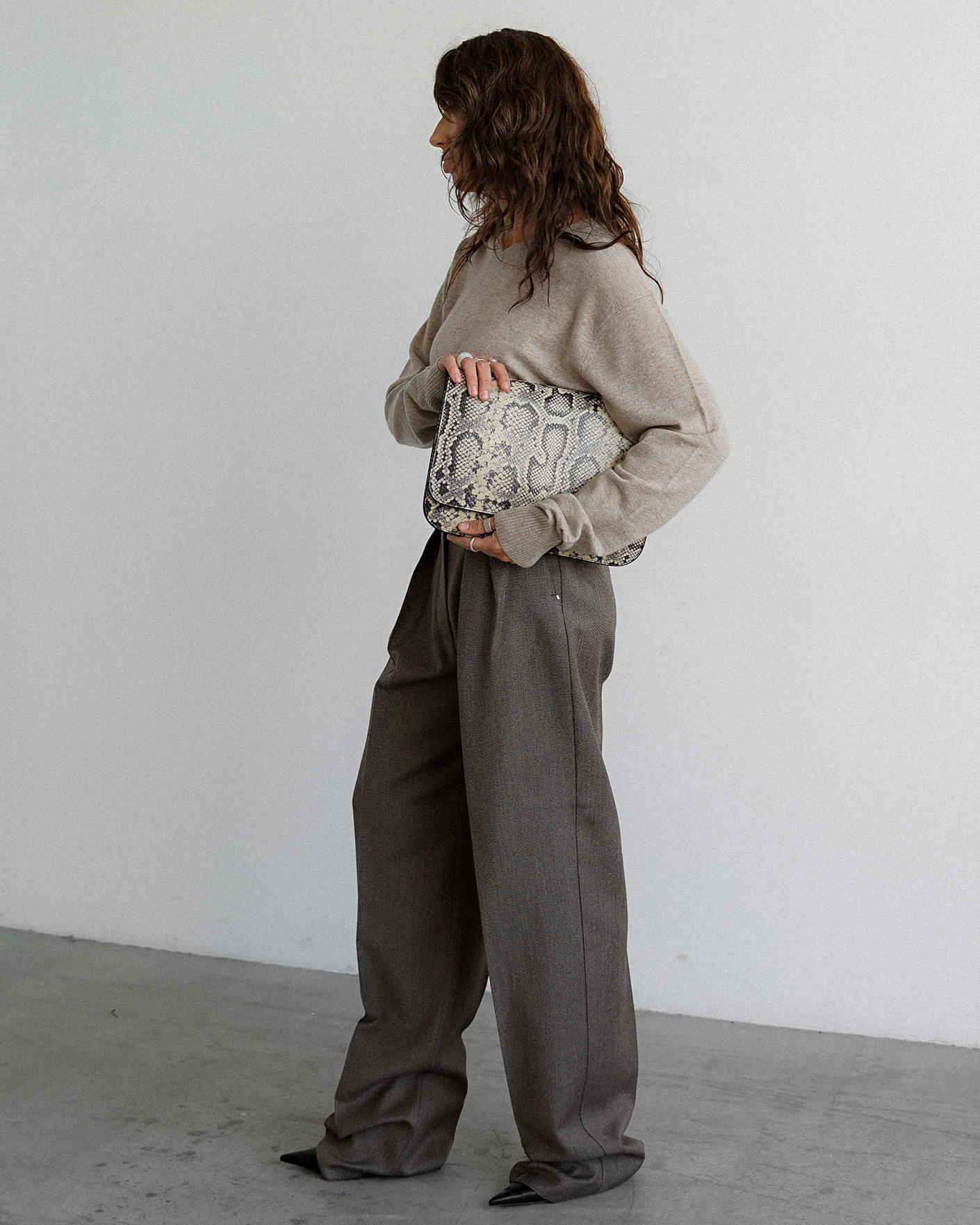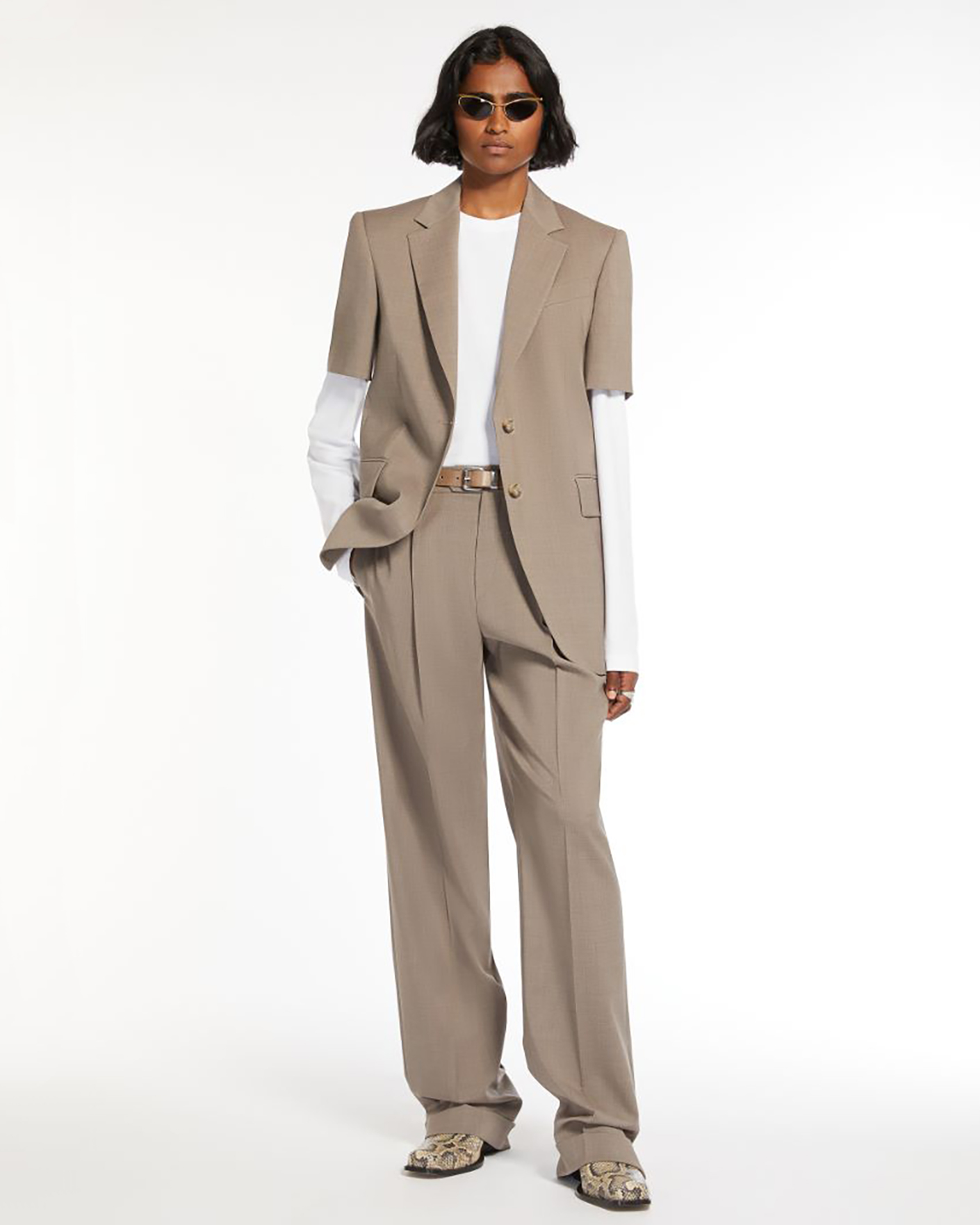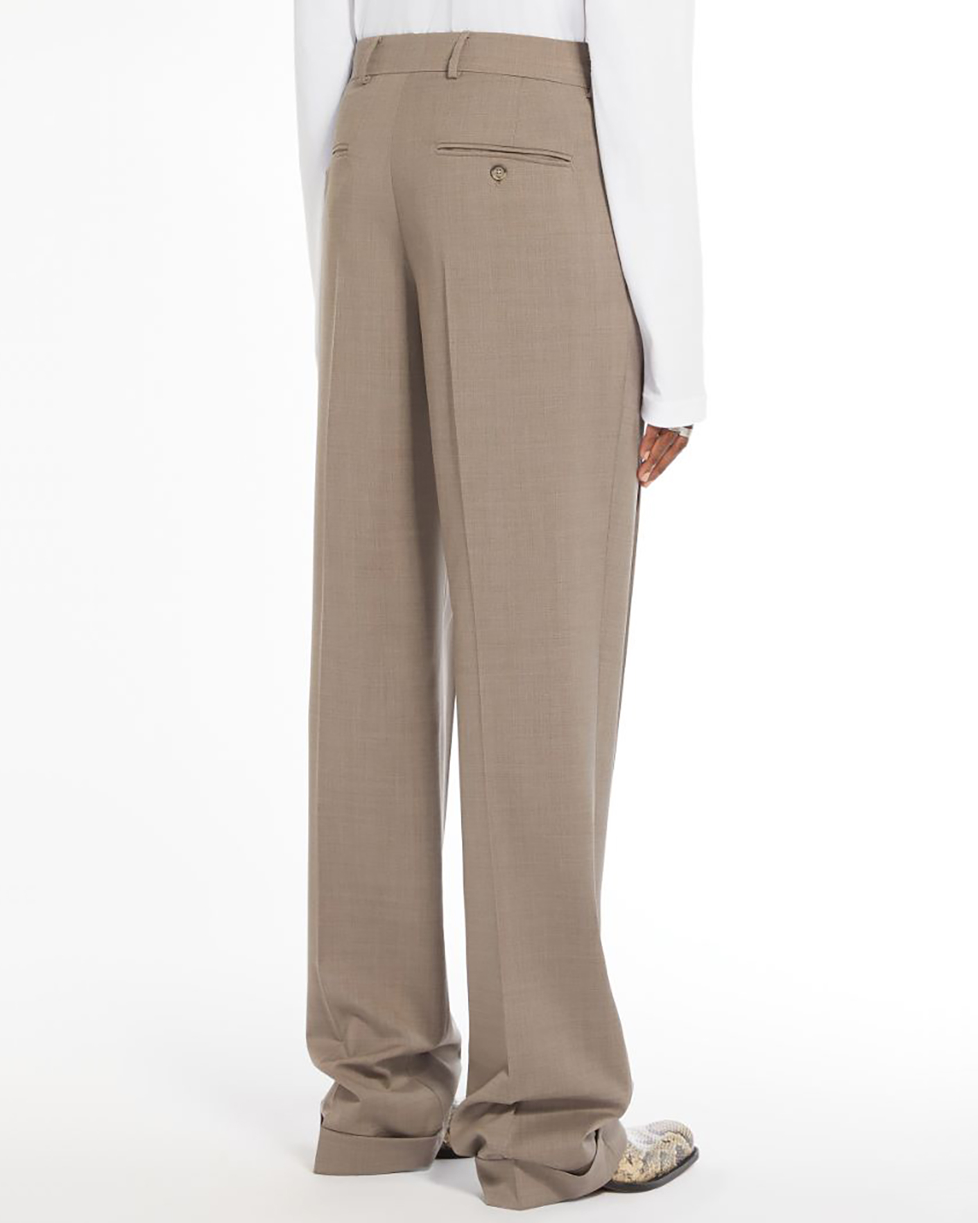 Широкие брюки Sportmax серо-бежевого цвета в строчный рисунок. Модель из 100% шерсти, завышеннная талия, защипы, стандартная застежка, имеются врезные карманы по бокам и сзади на пуговице. Манжеты с отворотами. Стильные брюки станут идеальными спутниками в деловом образе.