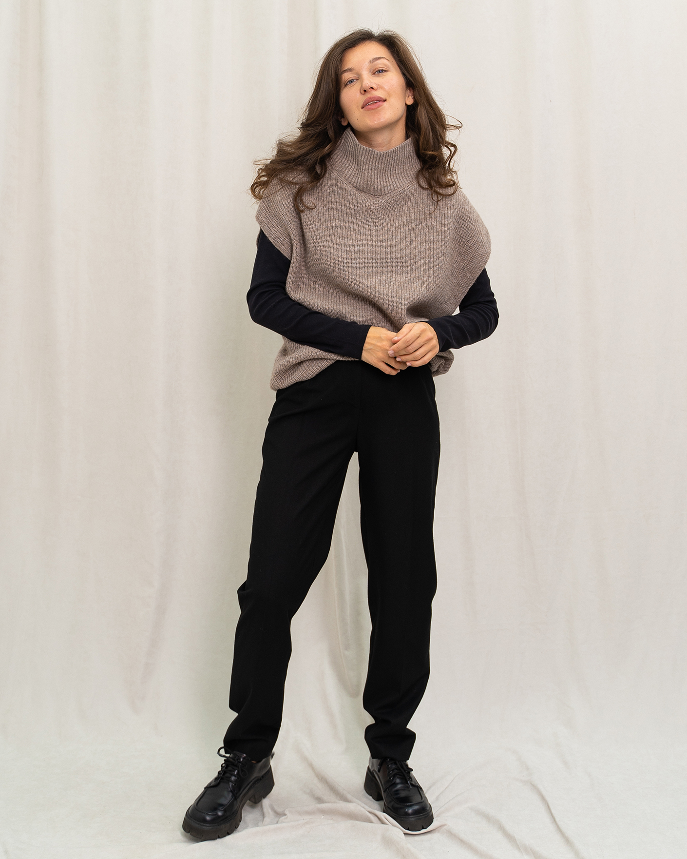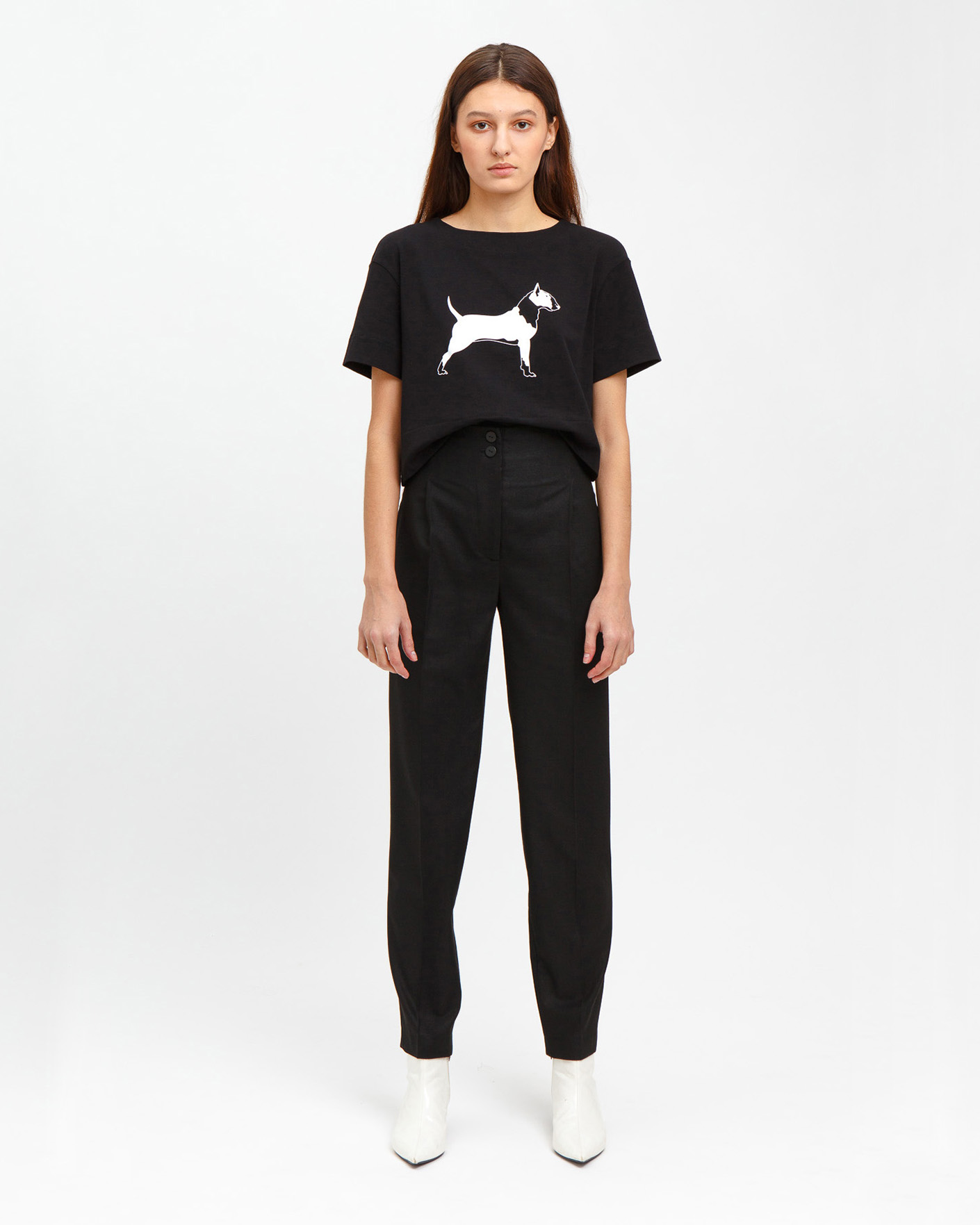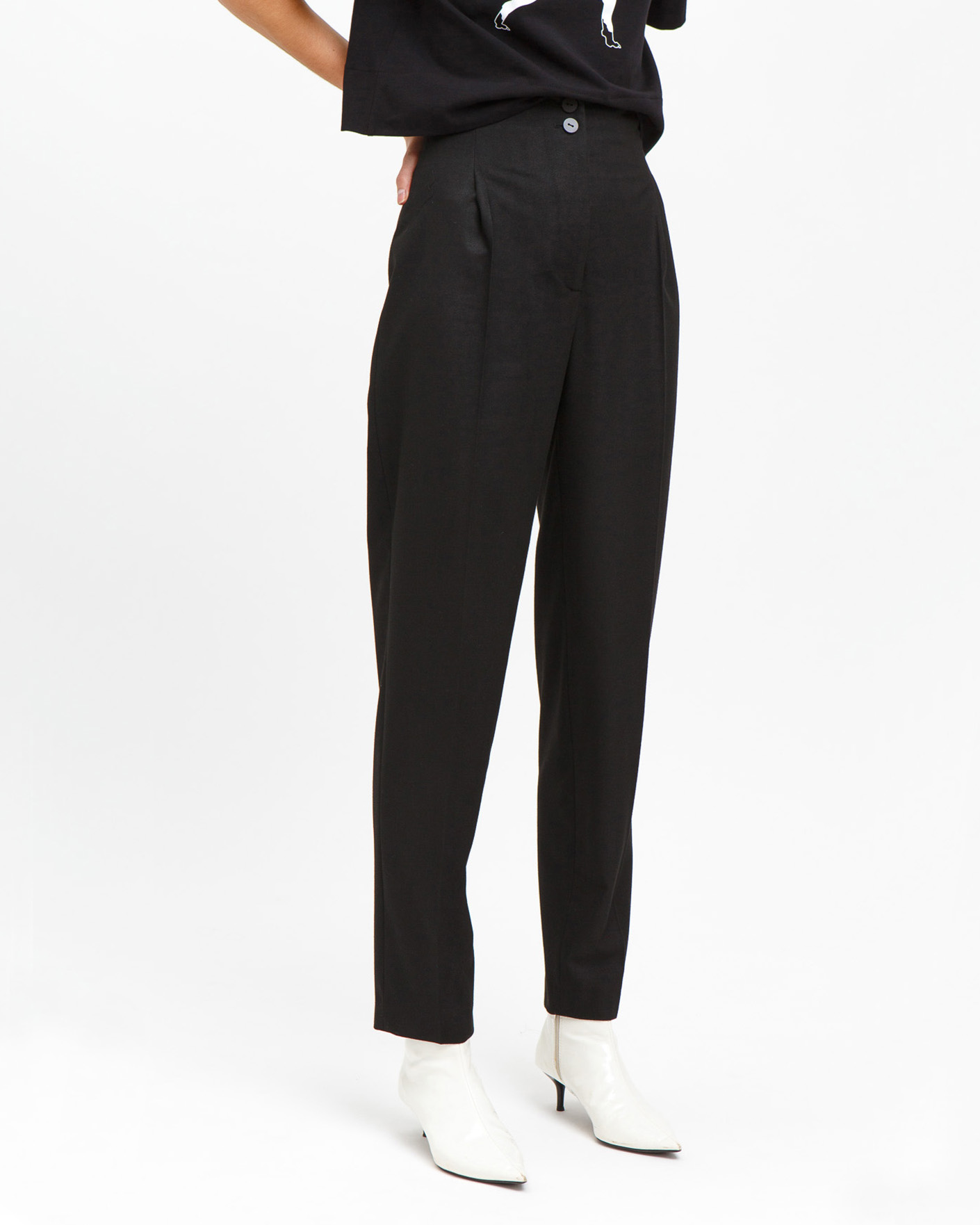 Зауженные брюки Cuvee черного цвета. Модель с завышенной талией на защипах и со стрелками. Имеются врезные карманы по бокам. Брюки можно сочетать с футболкой, блузой, рубашкой, джемпером, кардиганом и жакетом.