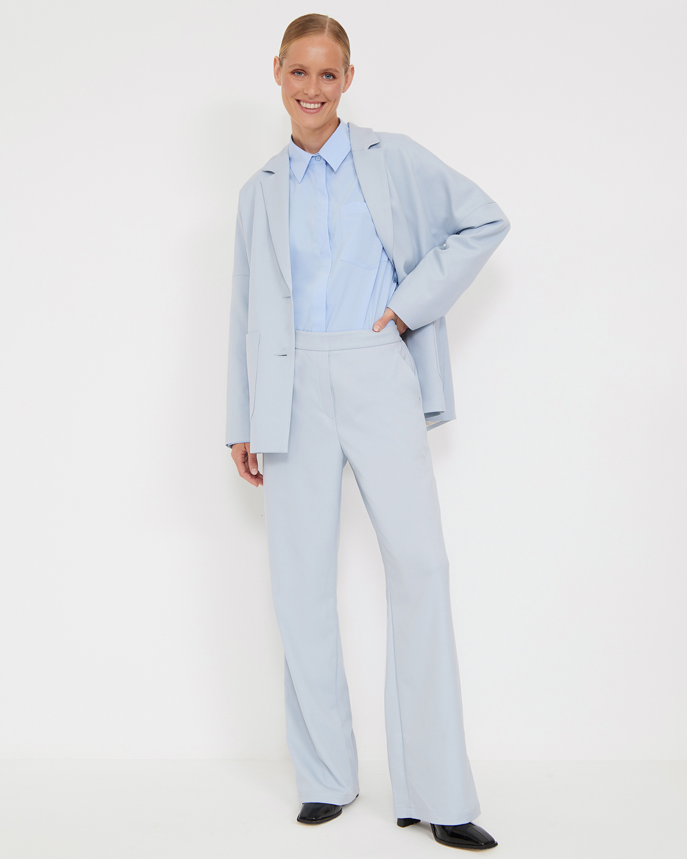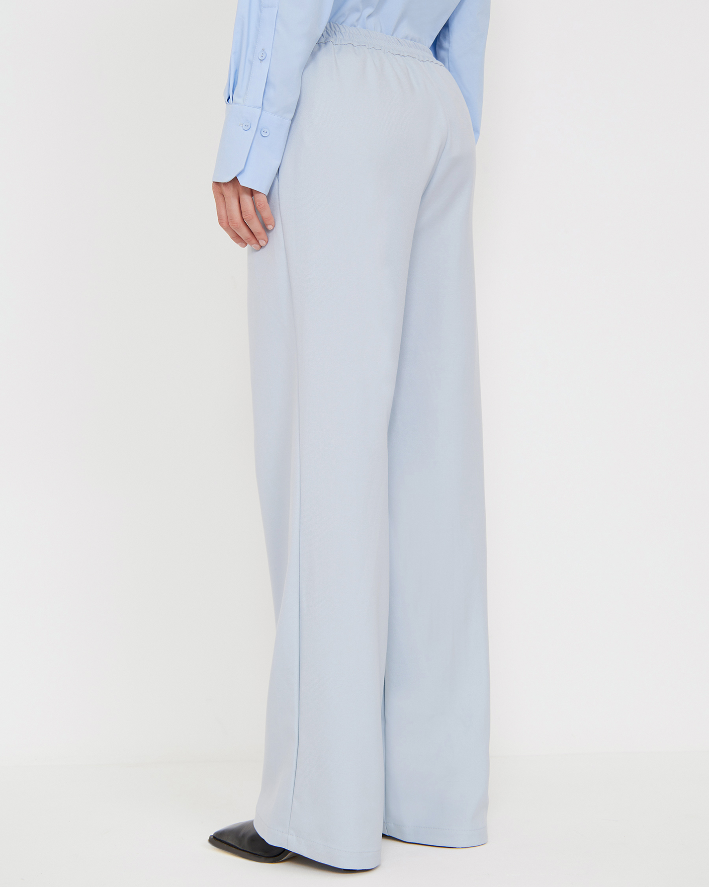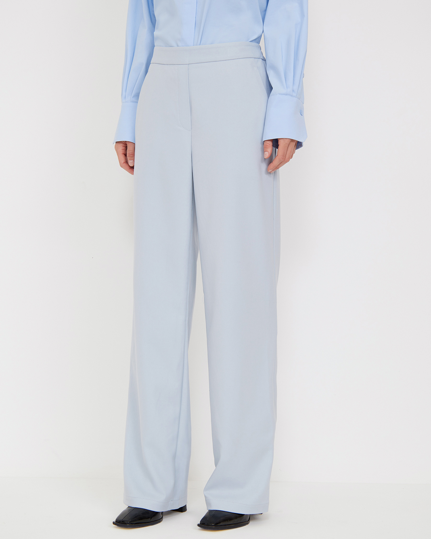 Стильные брюки Emka голубого цвета. Модель с завышенной талией без застежки с эластичной вставкой сзади. Имеются врезные карманы по бокам. Брюки можно сочетать с топом, рубашкой, блузой, джемпером, кардиганом, жилетом и жакетом.