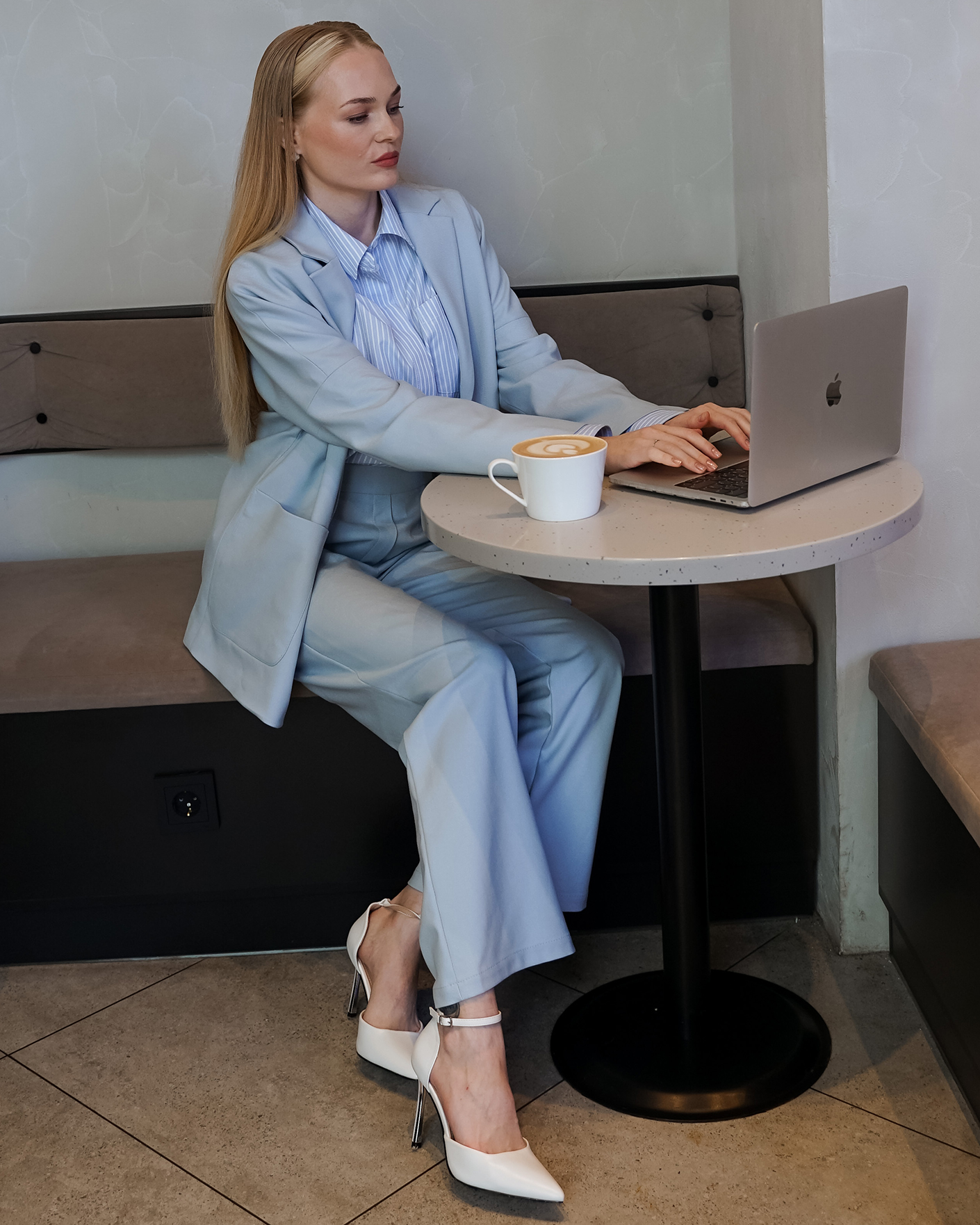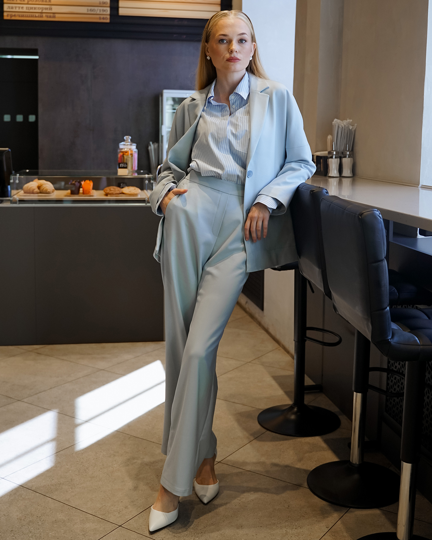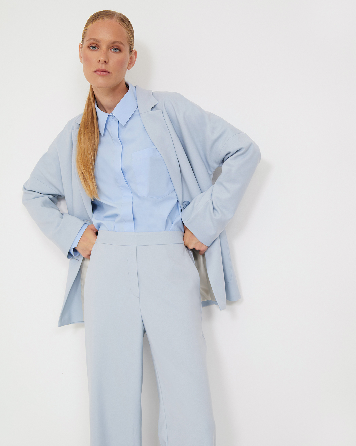 Стильные брюки Emka голубого цвета. Модель с завышенной талией без застежки с эластичной вставкой сзади. Имеются врезные карманы по бокам. Брюки можно сочетать с топом, рубашкой, блузой, джемпером, кардиганом, жилетом и жакетом.