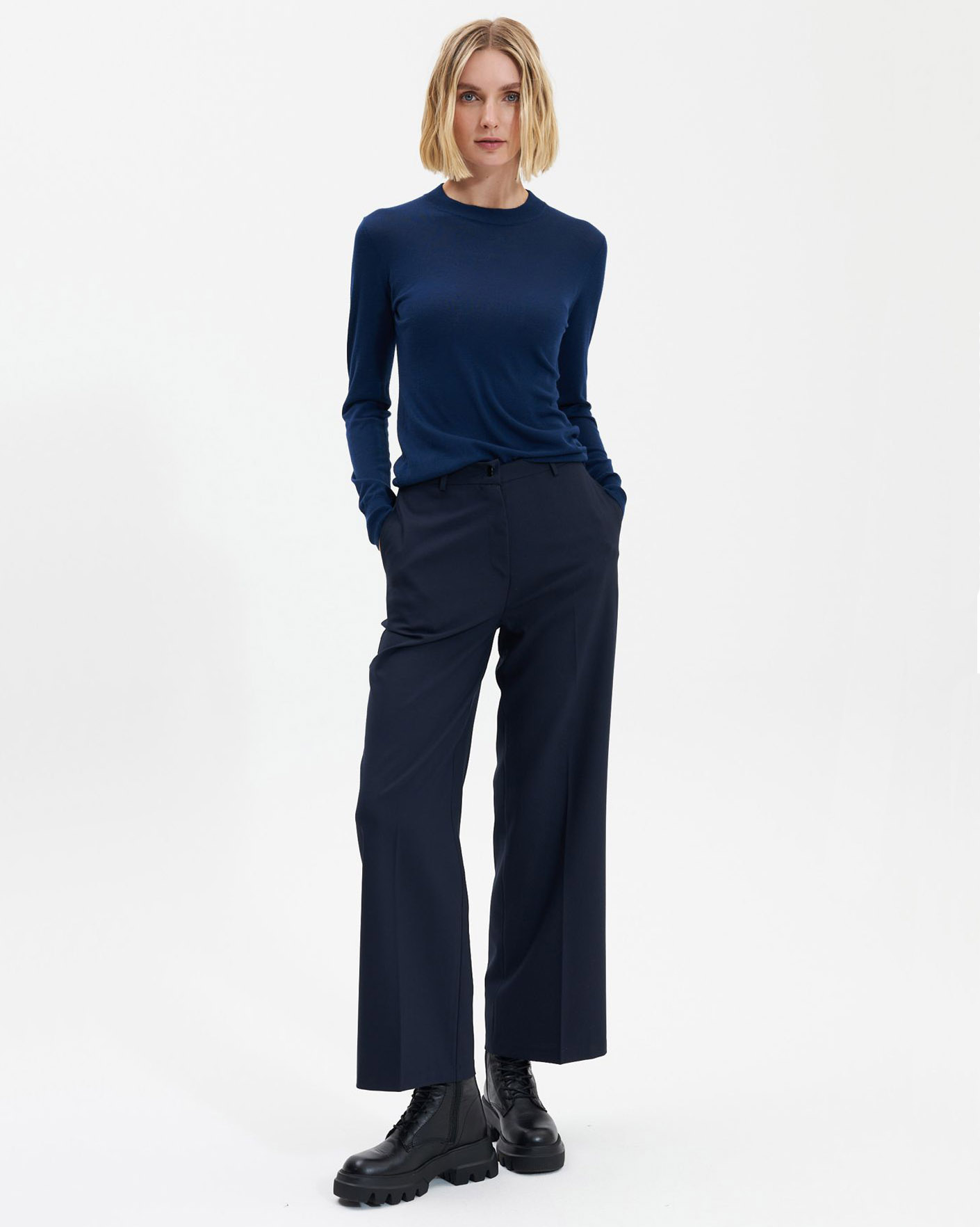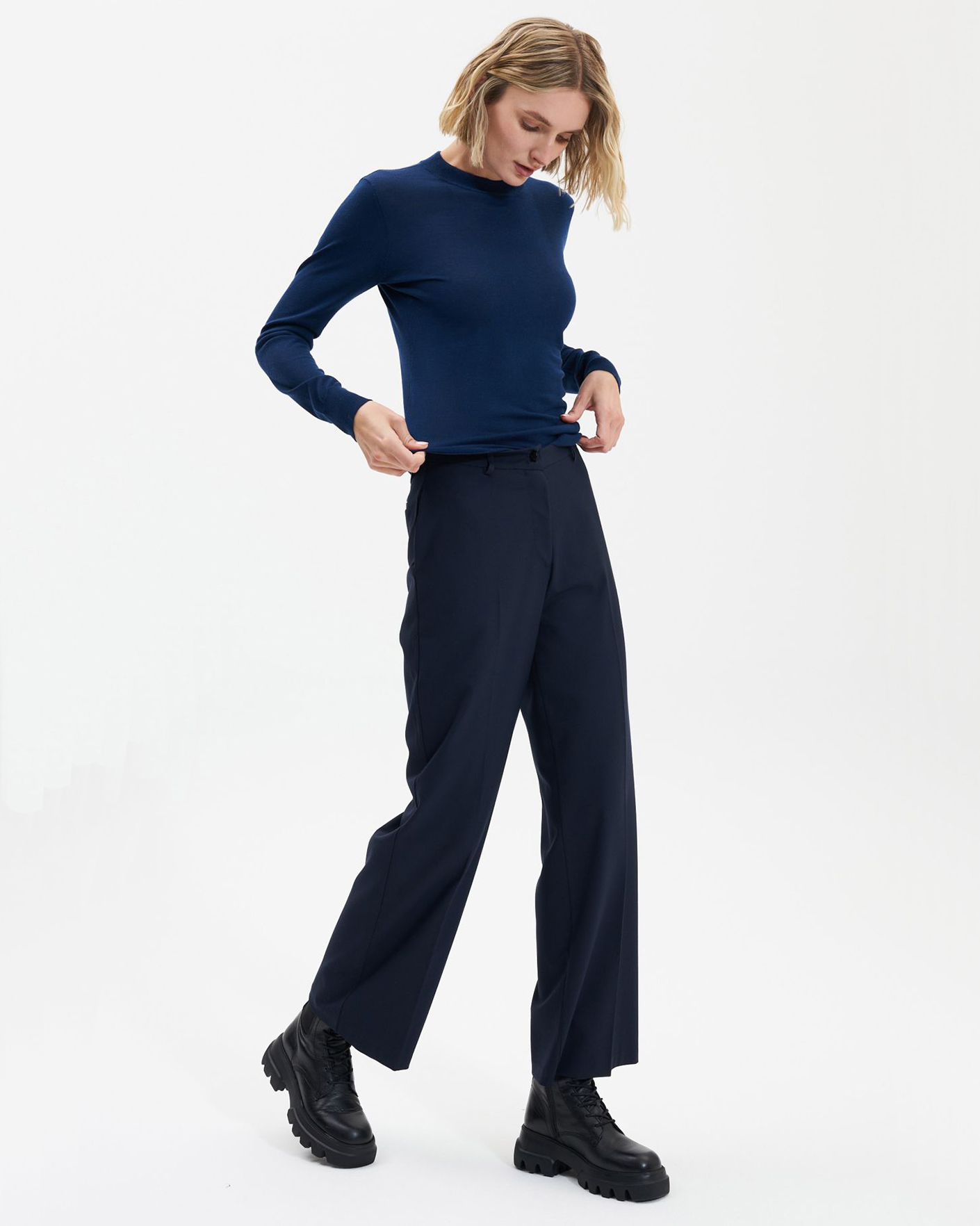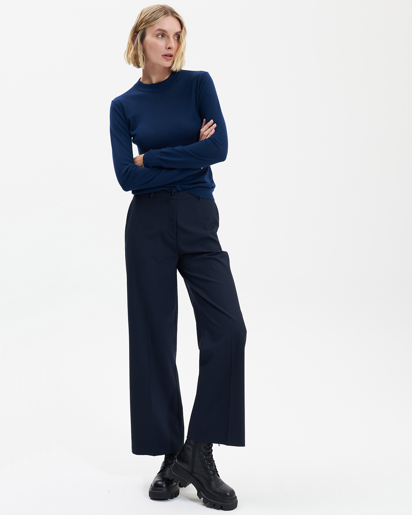 Брюки UNQ синего цвета со стрелками. Модель прямого кроя с завышенной талией на стандартной застежке. Имеются врезные карманы по бокам и сзади. Классические брюки отлично впишутся в повседневный гардероб.