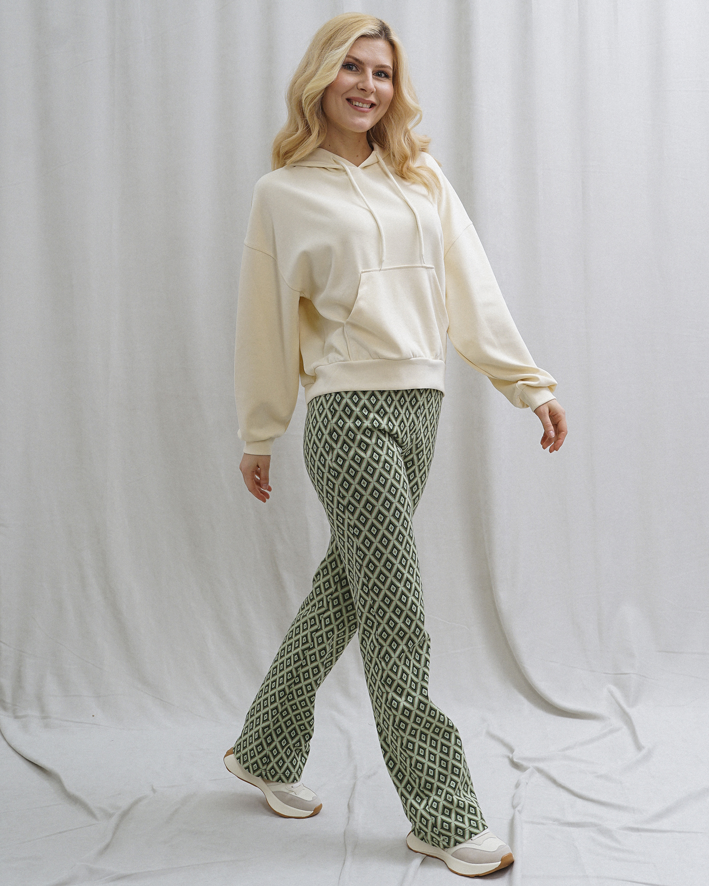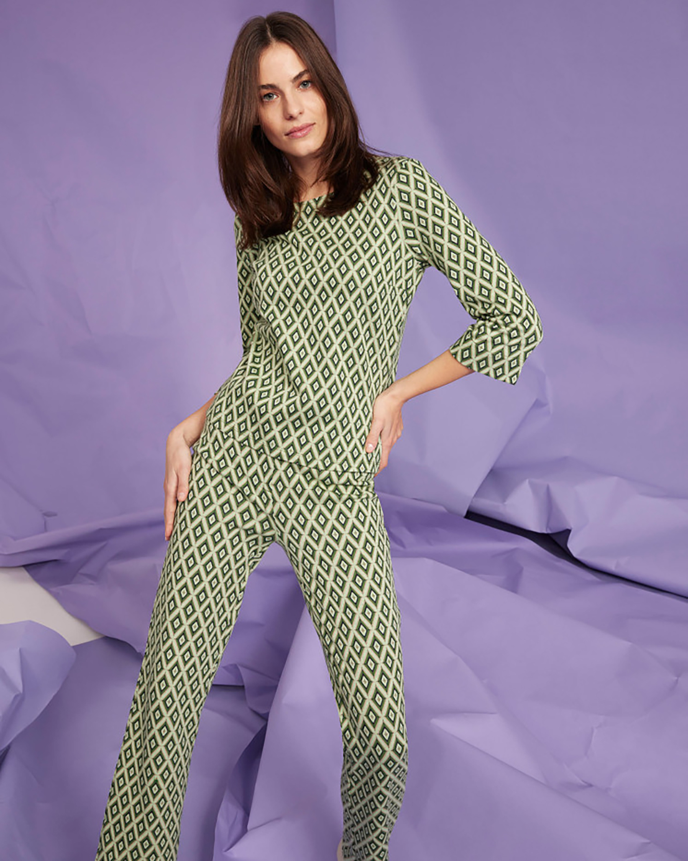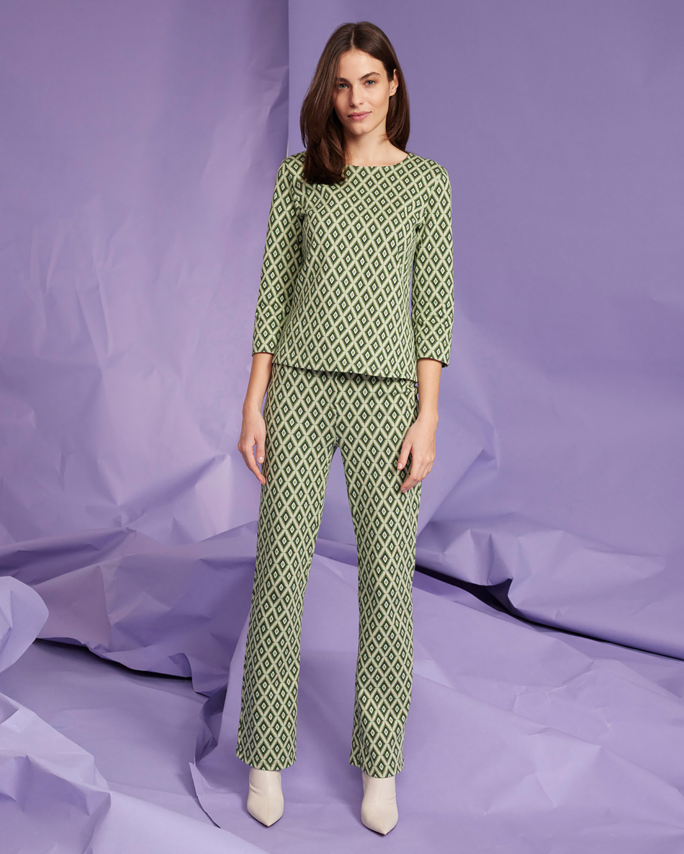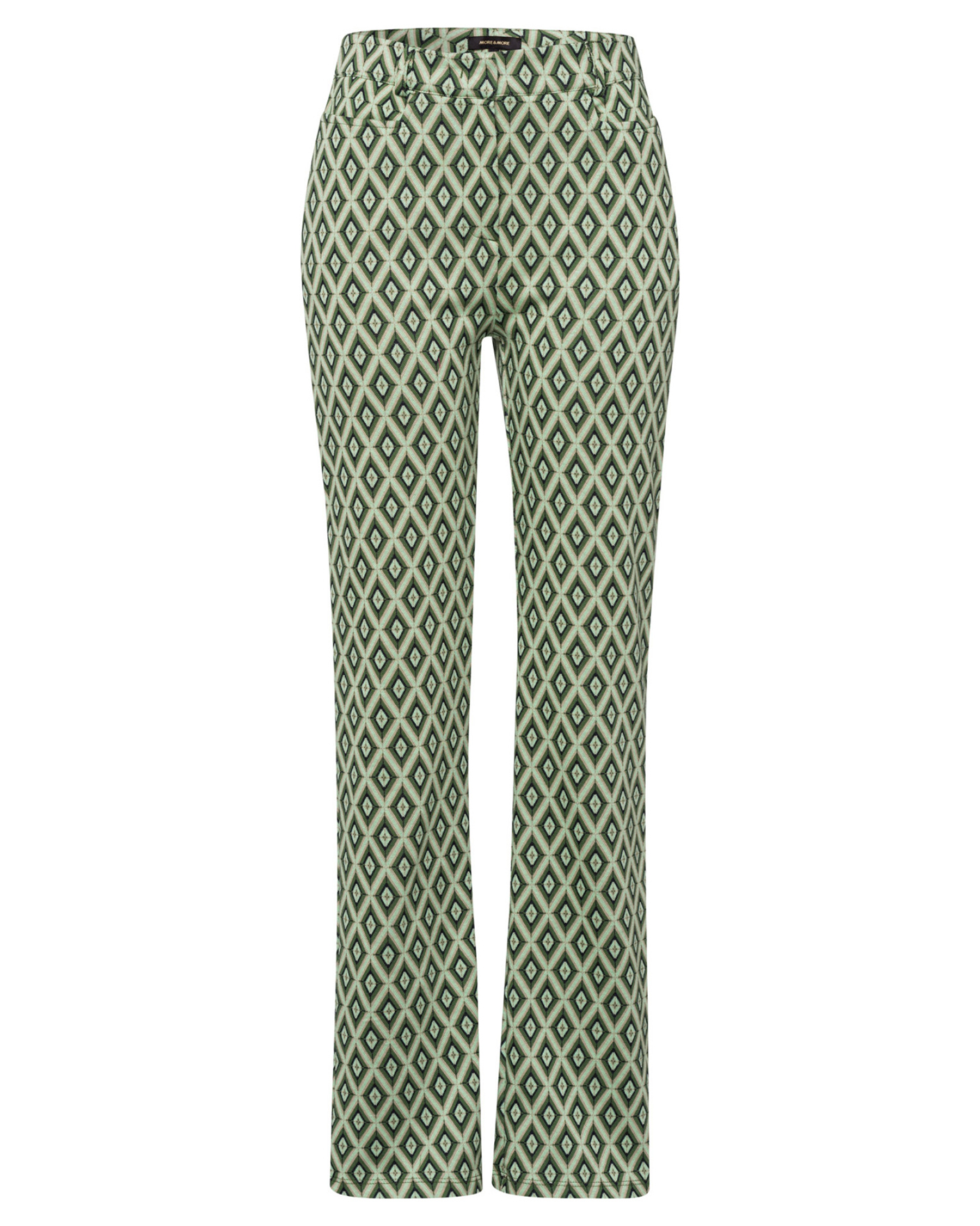 Яркие брюки More&More зеленого цвета в ромбовидный жаккардовый принт. Модель на эластичном поясе с имитацией ширинки. Слегка расклешенный силуэт, шлифовки для ремня, врезные карманы по бокам. Брюки отлично впишутся в ваш гардероб.