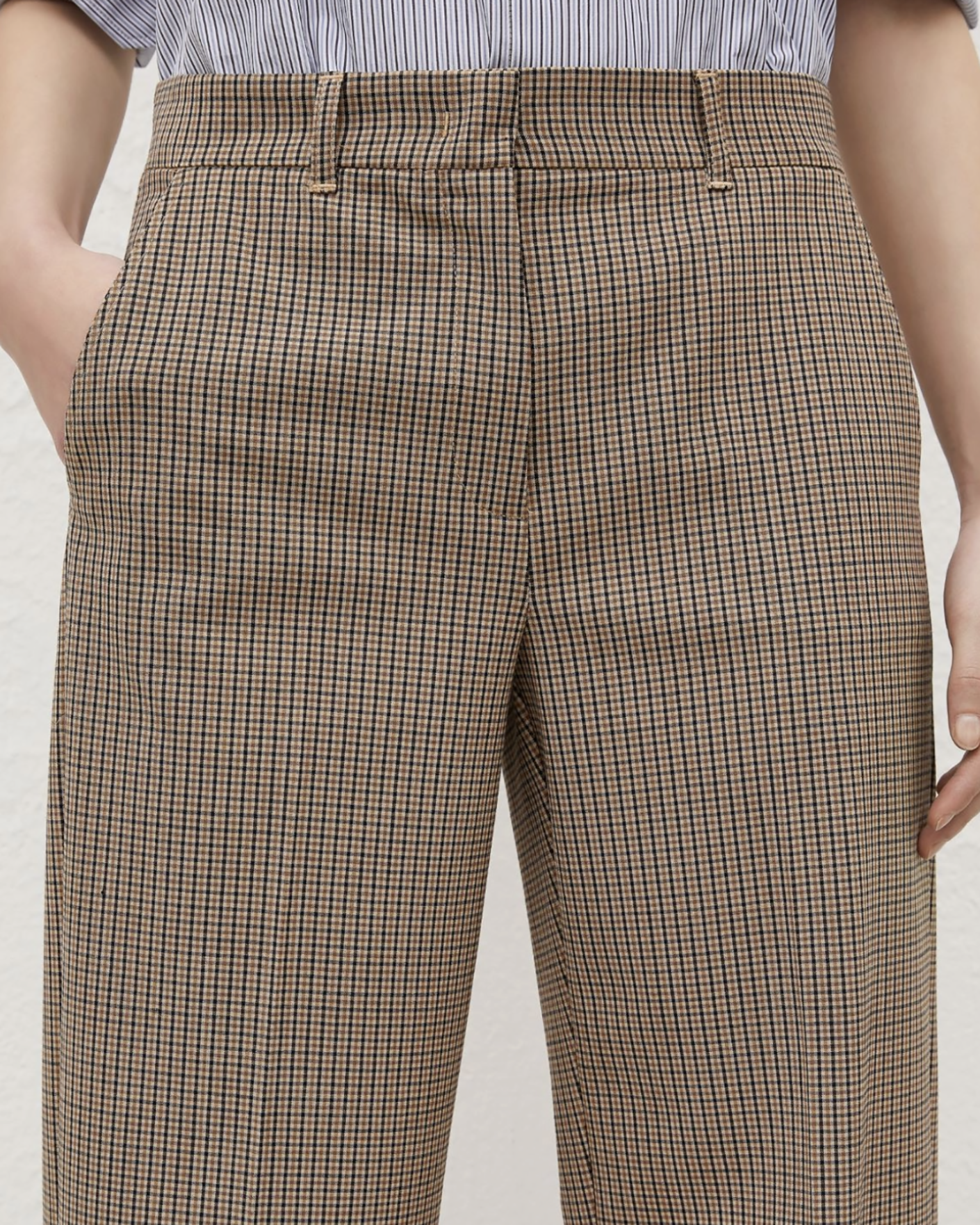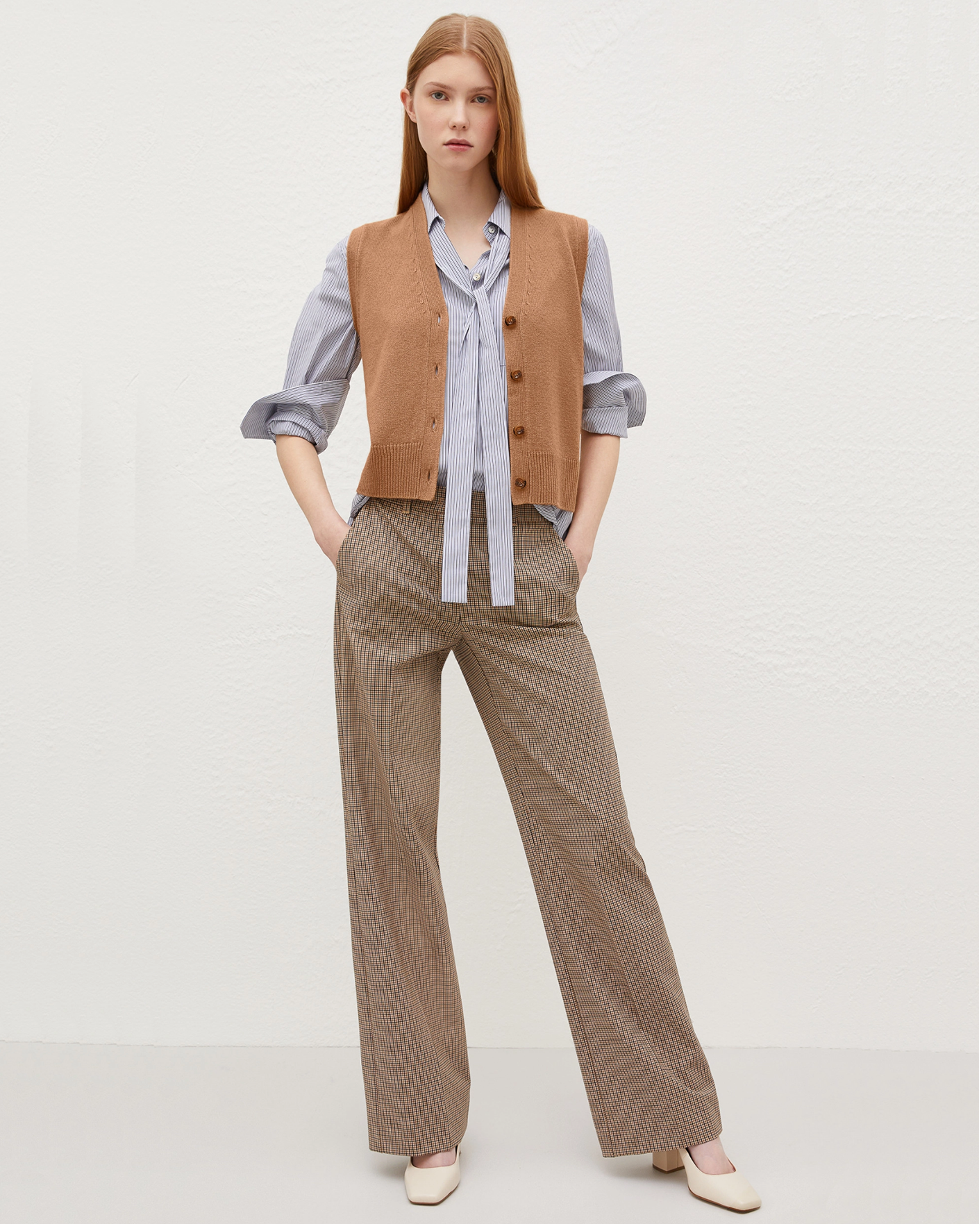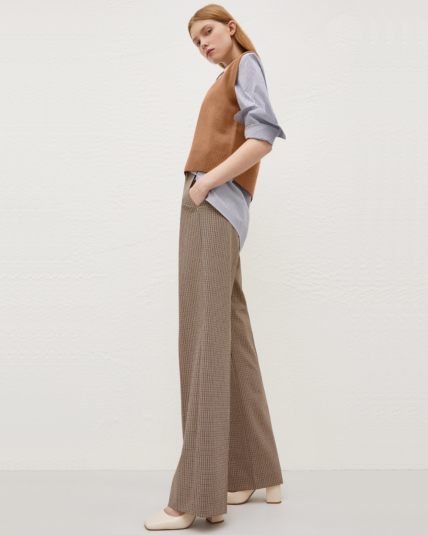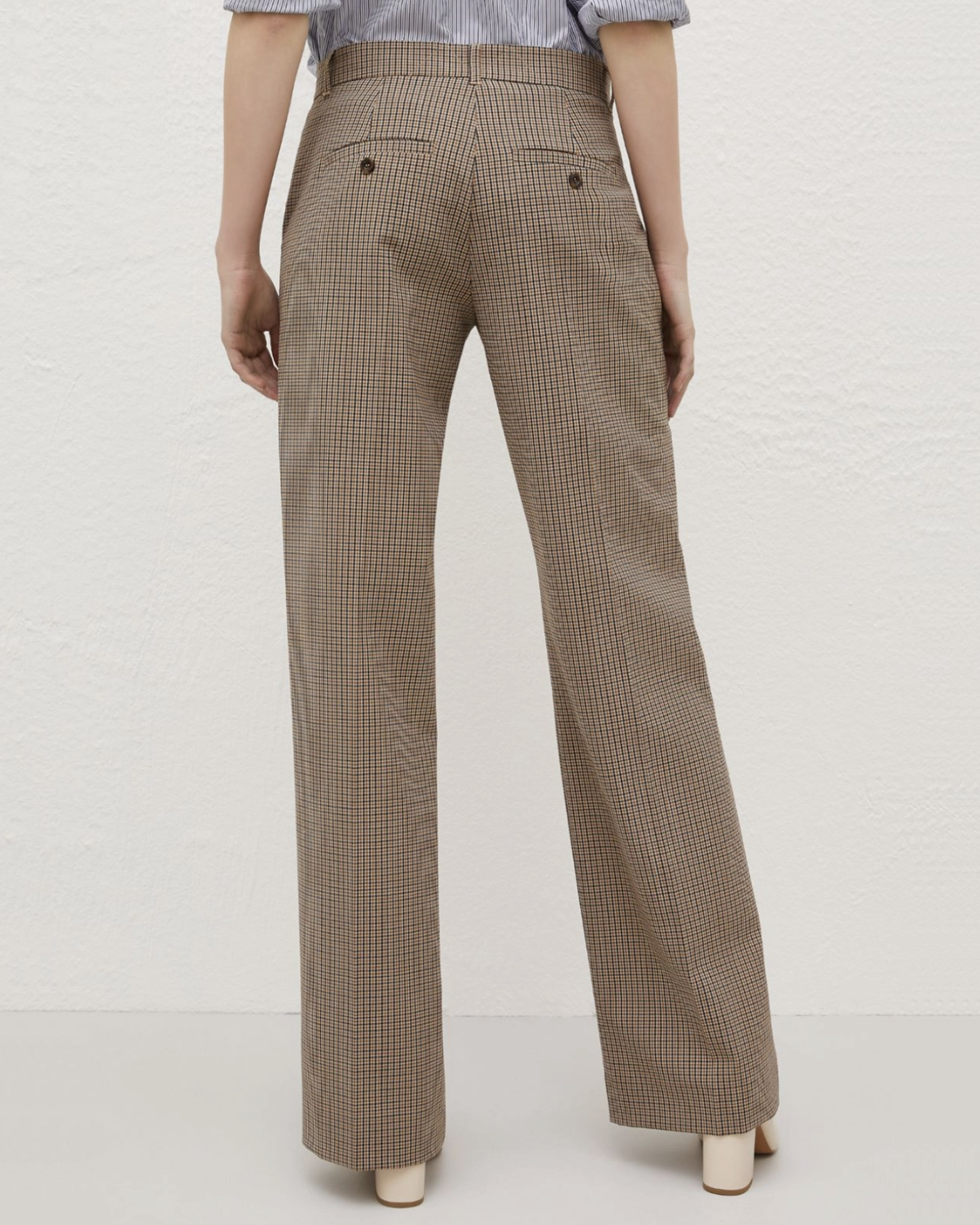 Классические брюки Marella бежевого цвета в мелкий рсиунок гусиные лапки. Модель прямого кроя, с завышенной талией на скрытой застежке, имеются врезные карманы по бокам и сзади на пуговицы. Идеальные брюки для офисного стиля.