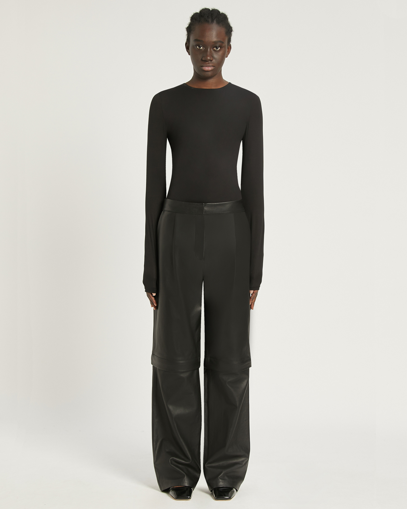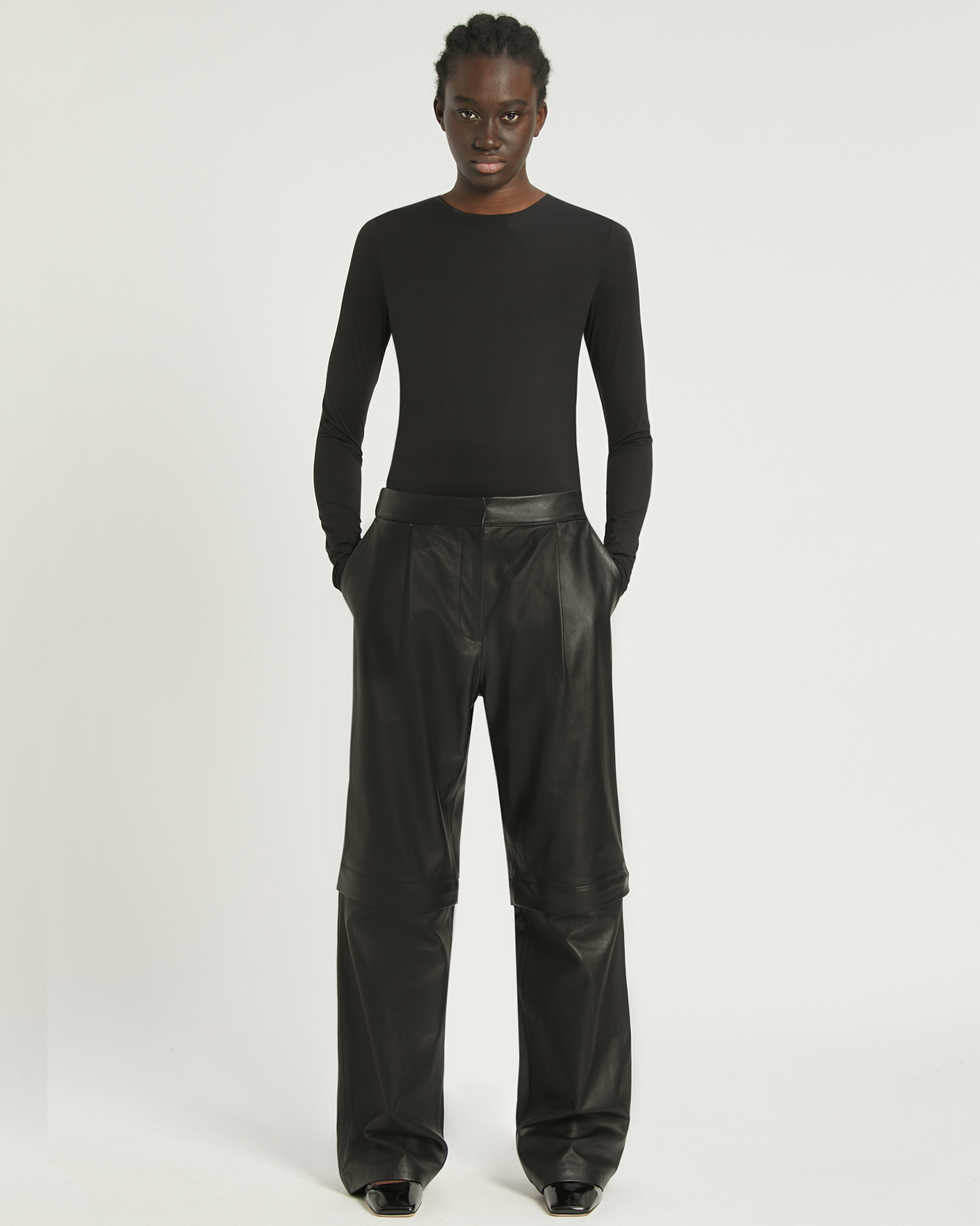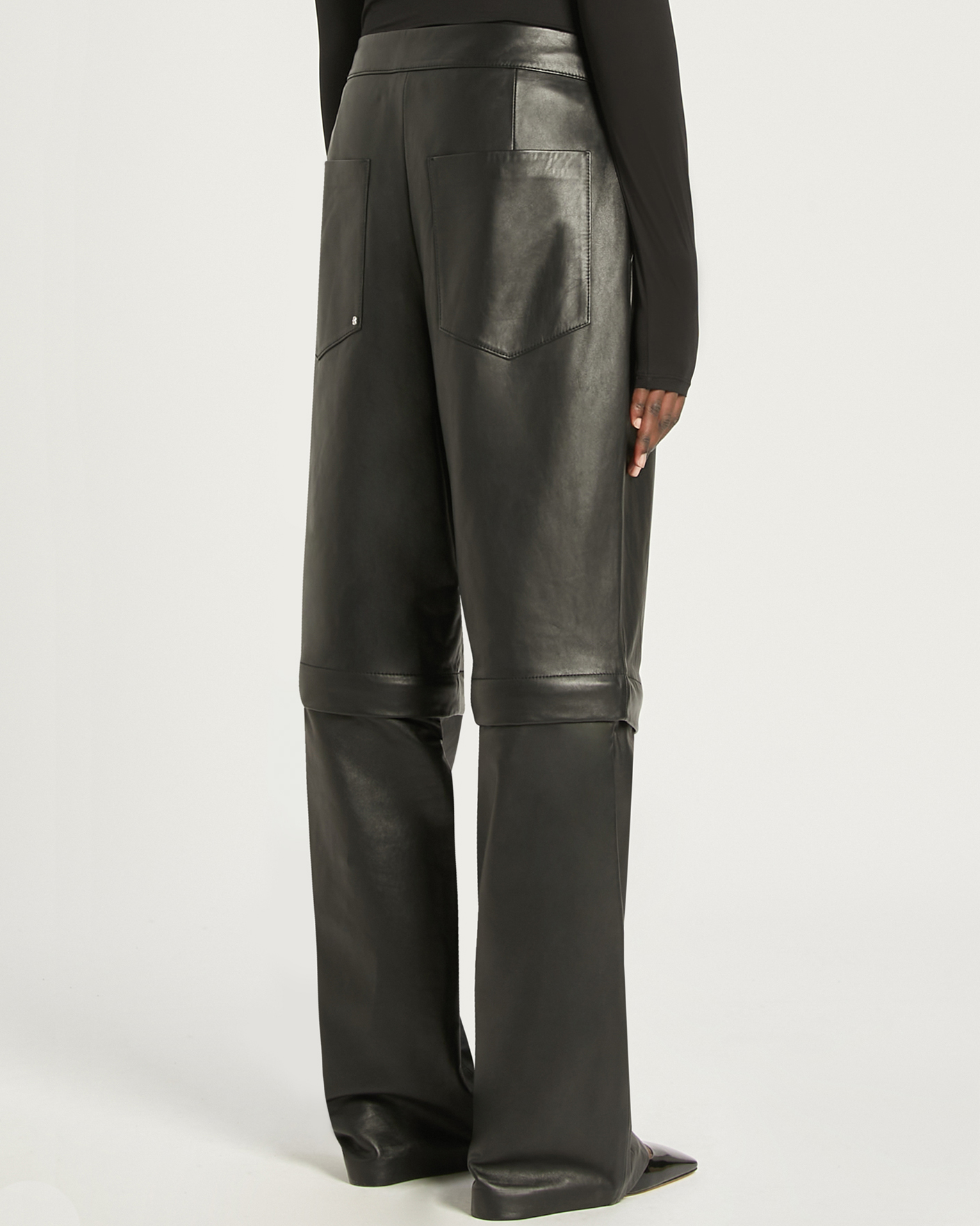 Брюки-шорты Sportmax черного цвета выполнены из 100% кожи. Мягкая и удобная модель 2-в-1 может превратиться из прямых брюк в ультрамодные шорты с помощью молний на коленях. Имеются врезные карманы по бокам и два накладных кармана сзади. Застежка на скрытую молнию и крючок. Стильные брюки-шорты станут фаворитами вашего гардероба.